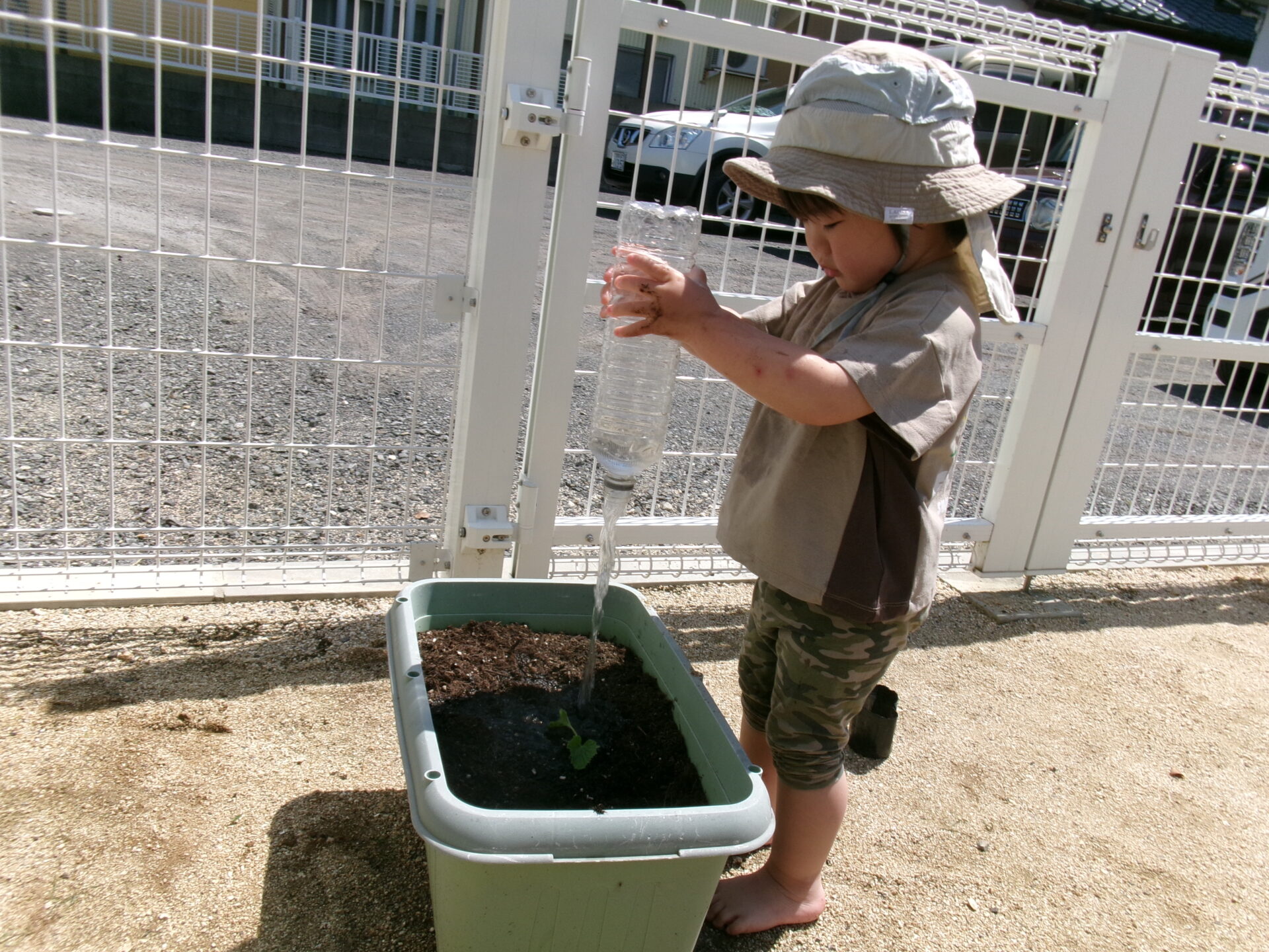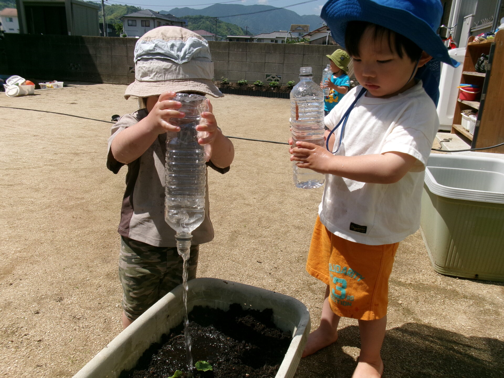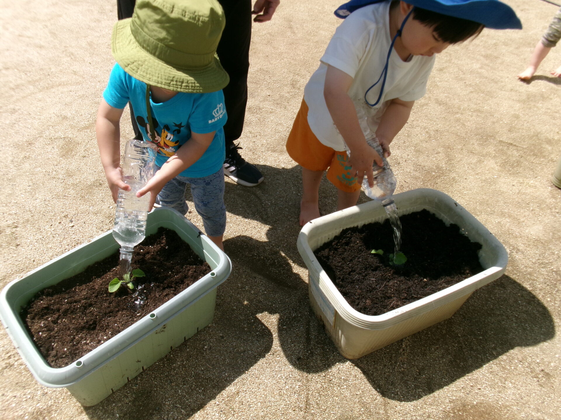 水やりも、ペットボトルに自分たちで水を入れてあげることができました。
