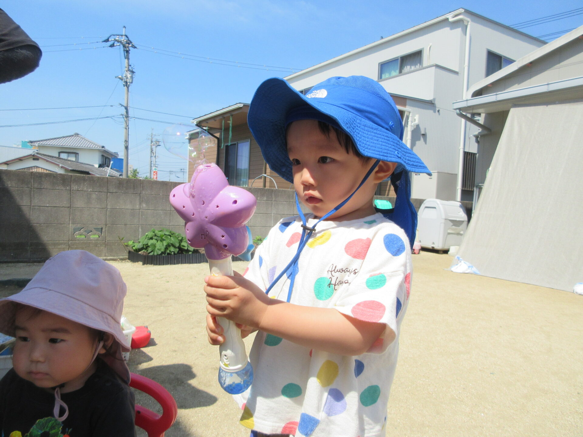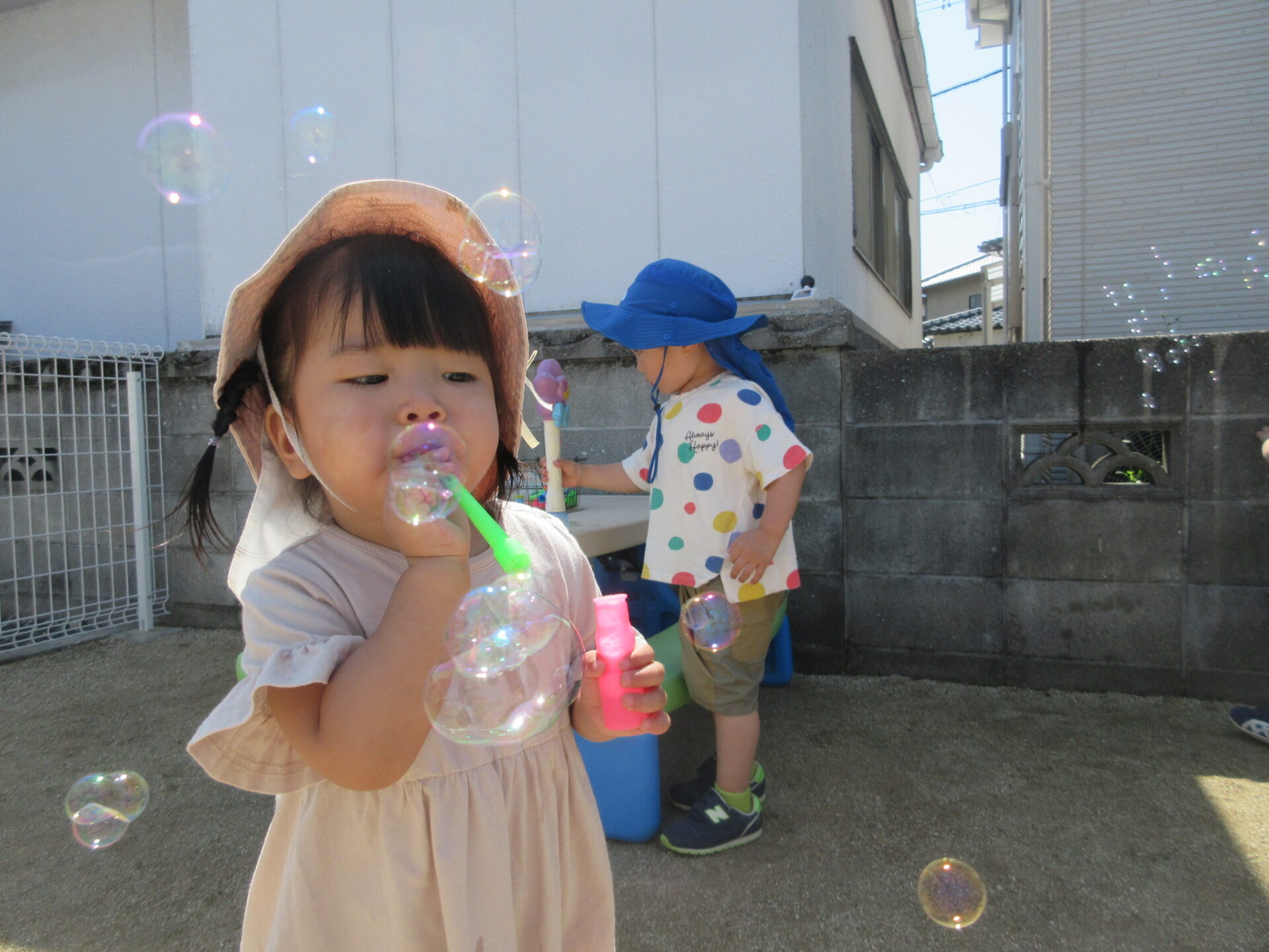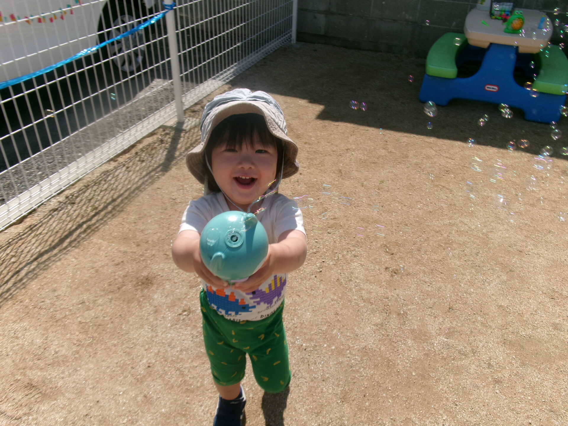 今日はとても天気が良く、お外でシャボン玉遊びをしました!