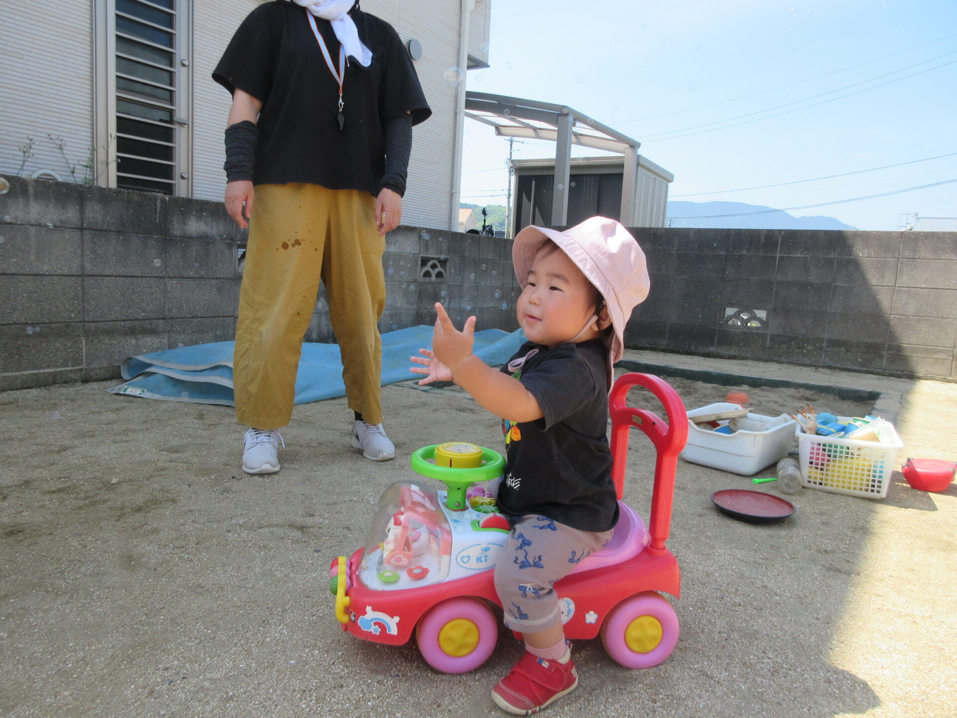 しゃぼん玉を持つ子は「まて、まてー」と追いかけ、もう一人の子は「きゃ、きゃ」と笑いながら車に乗り逃げていました(笑)