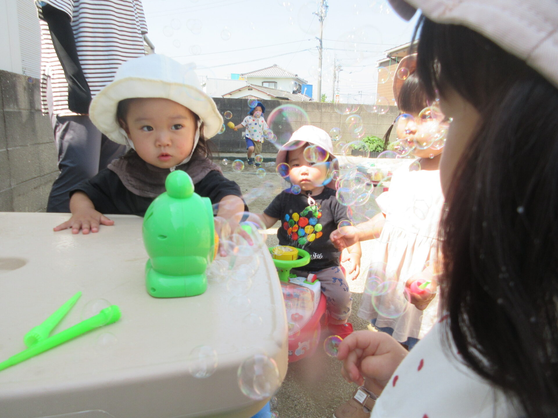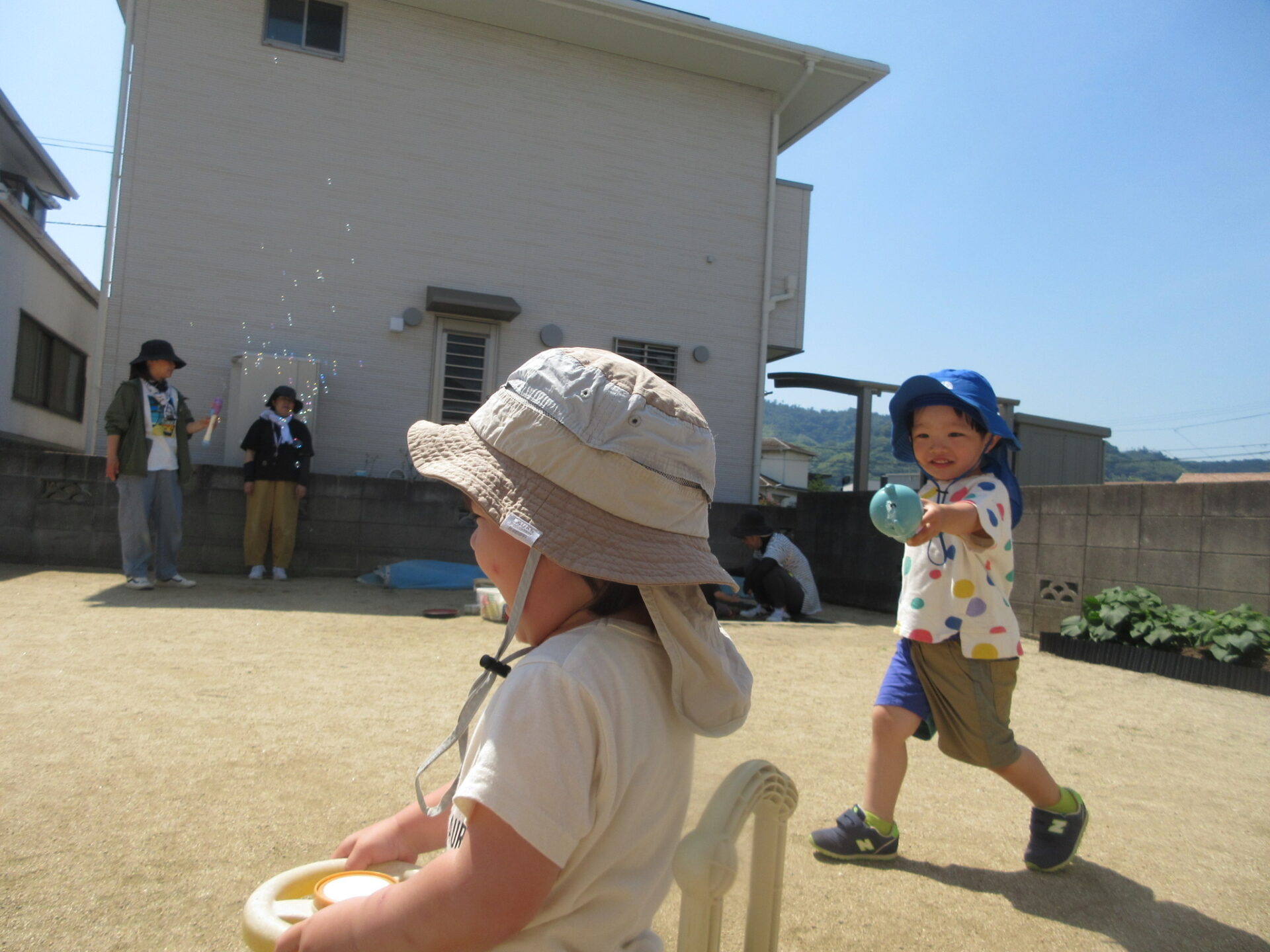まんぼう組(2歳児)さんたちは、シャボン玉で追いかけっこを始めました。