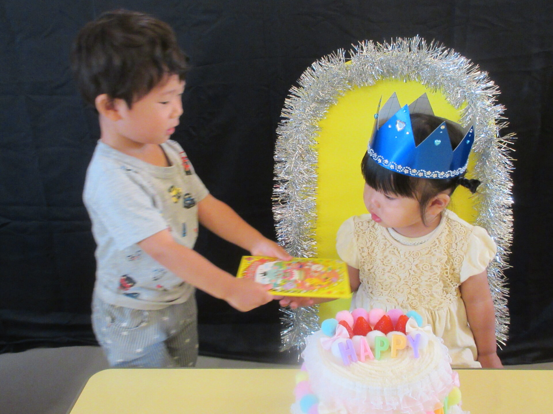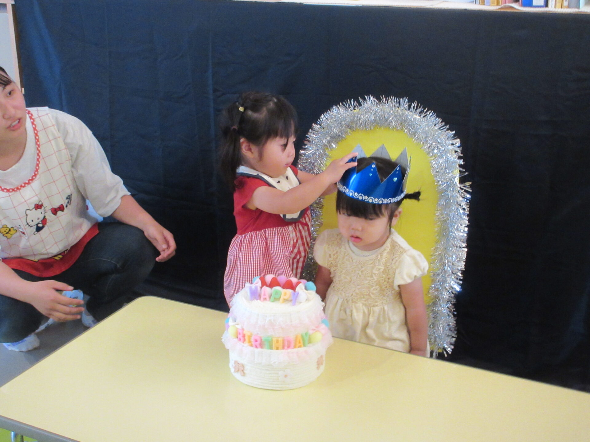 「冠を渡してくれるお友達いますか?」と聞くと、「はーい」と手を上げてくれる同じクラスの女の子です!頭に上手に被らせてくれましたよ☆