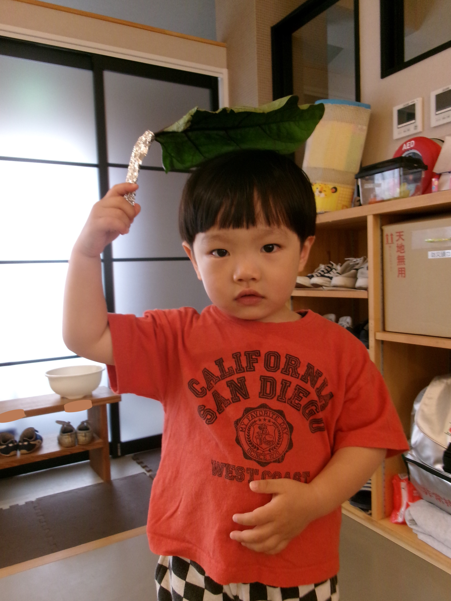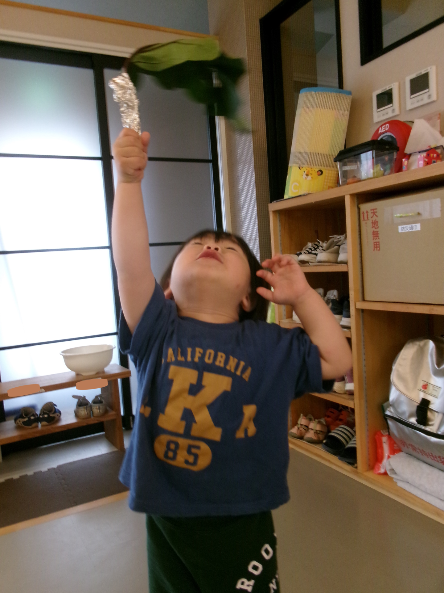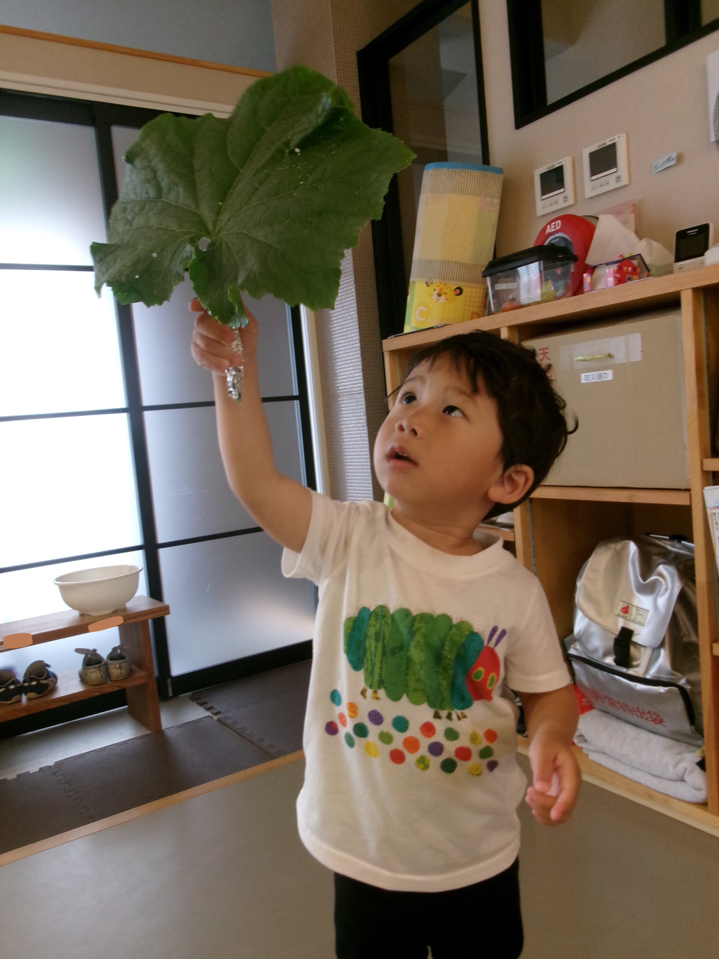 6月は「あめふりくまのこ」という歌をうたって楽しみましたが、その歌詞にある頭に乗せられるくらい大きな葉っぱを、職員が持ってきてくれました。(梅雨の間にこのブログをあげたかったのですが、思いの外早く梅雨明けしてしまったので、急いで更新しました(笑))