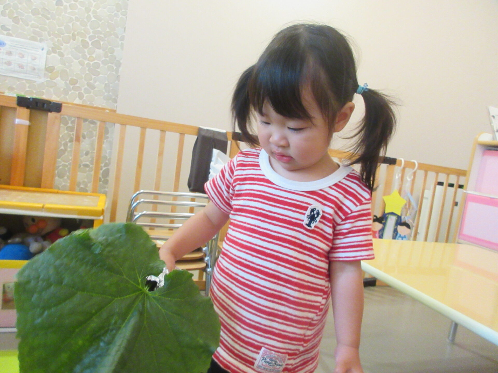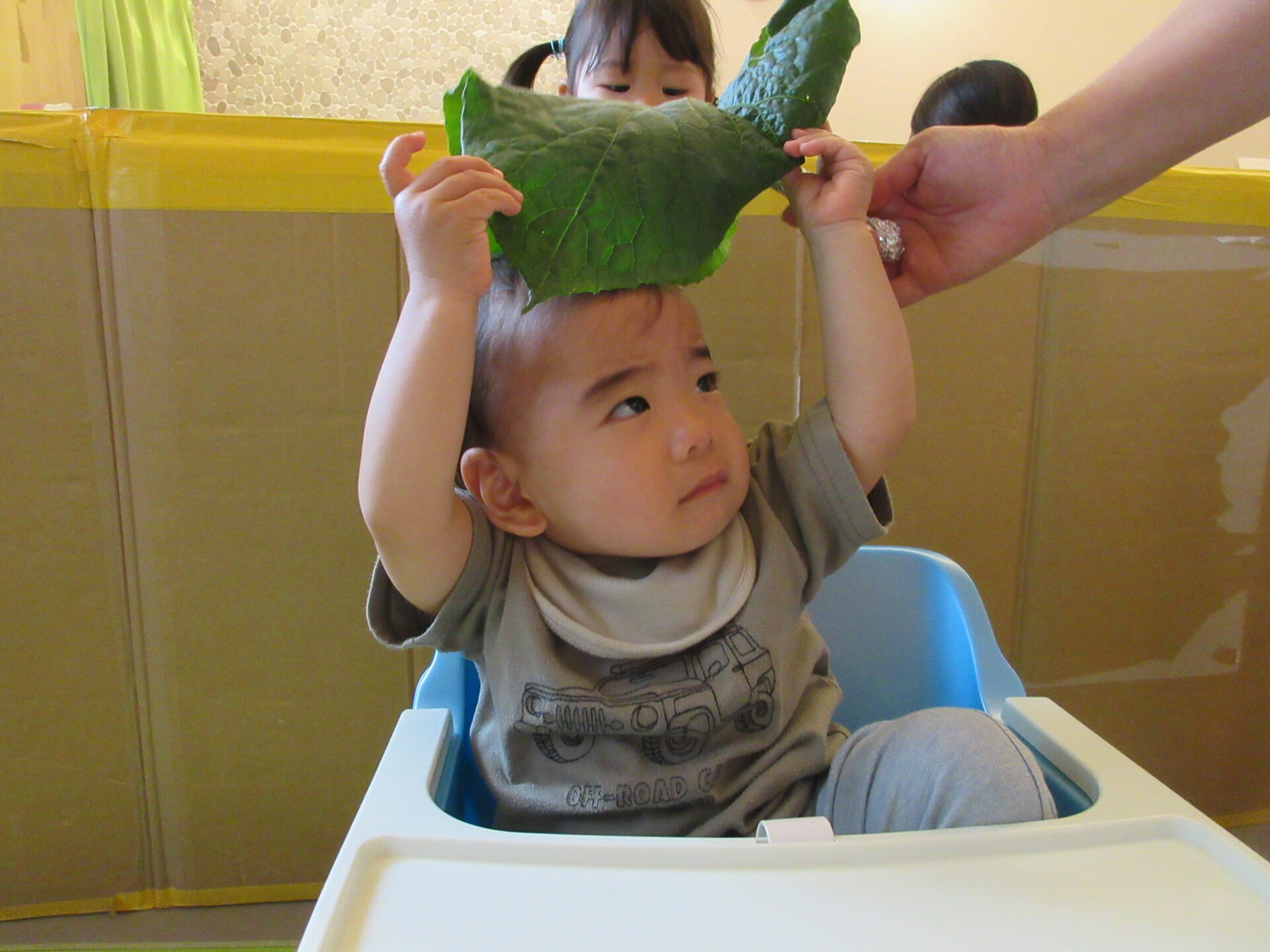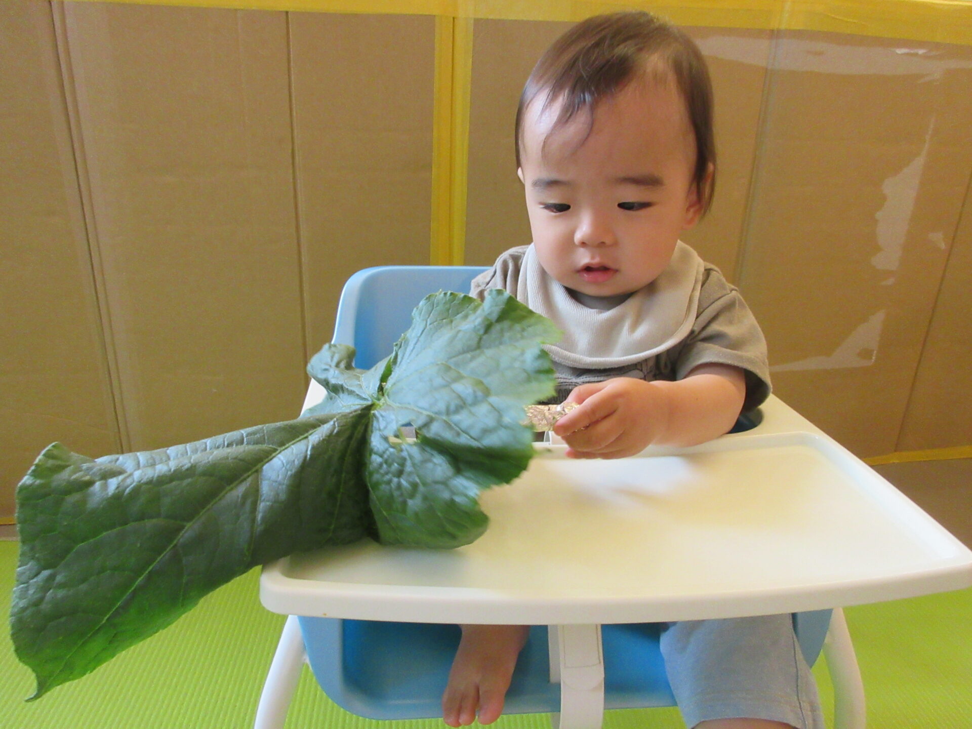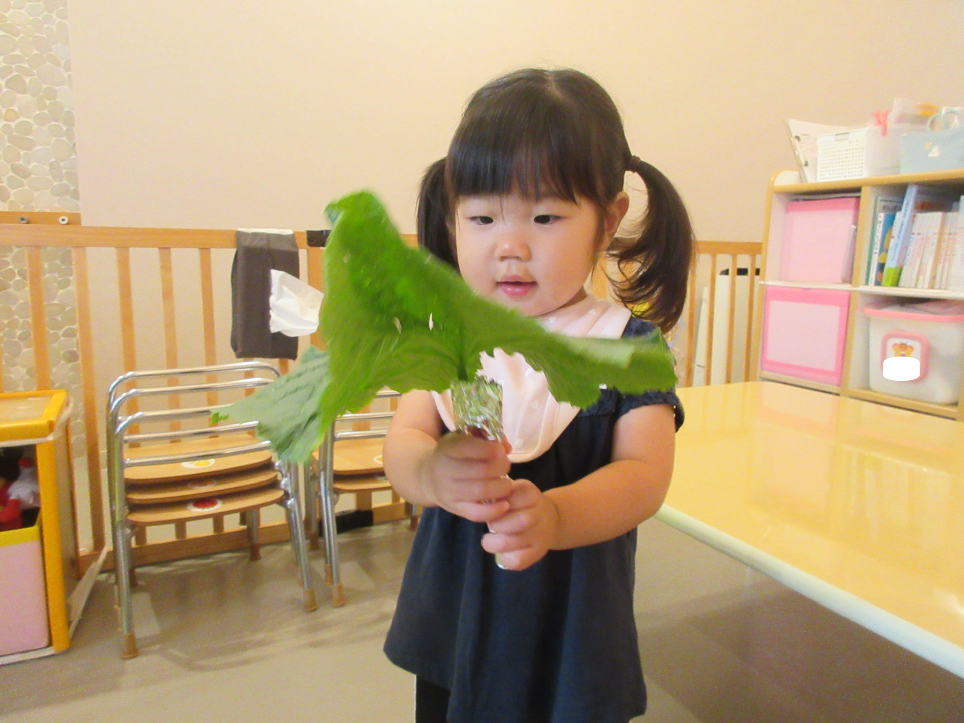 うみ組の小さなお友だちも、自分の顔よりも大きな葉っぱを持って楽しみました。