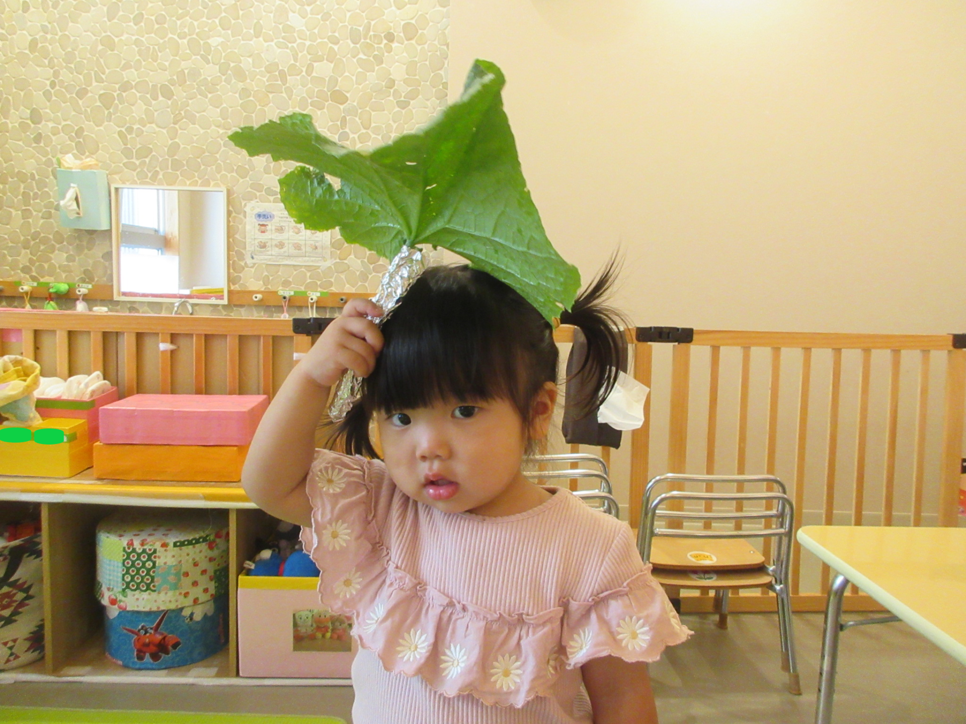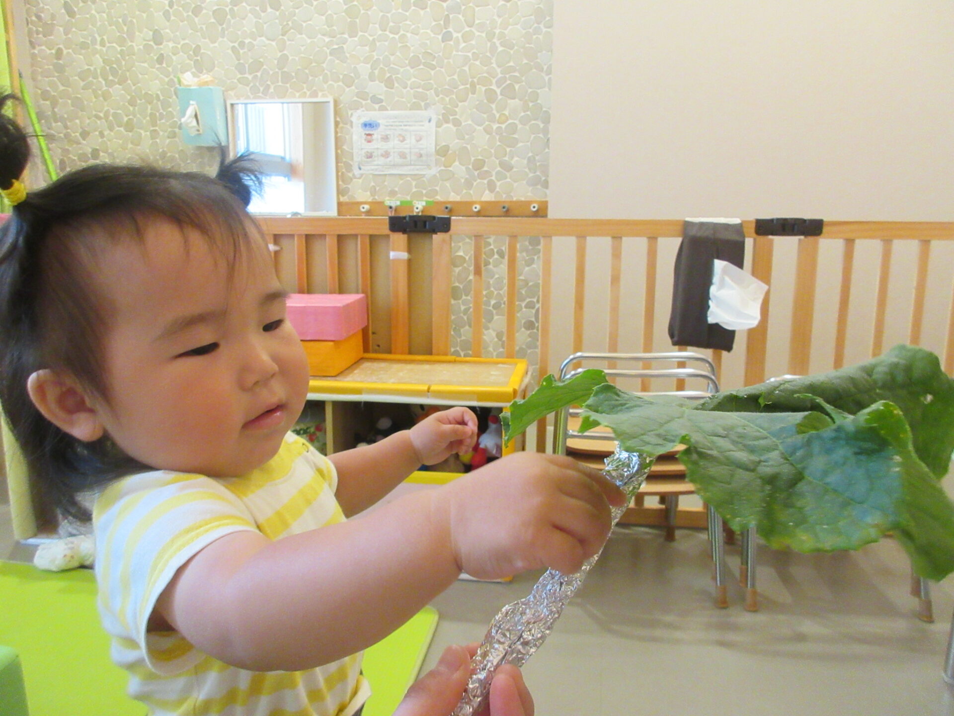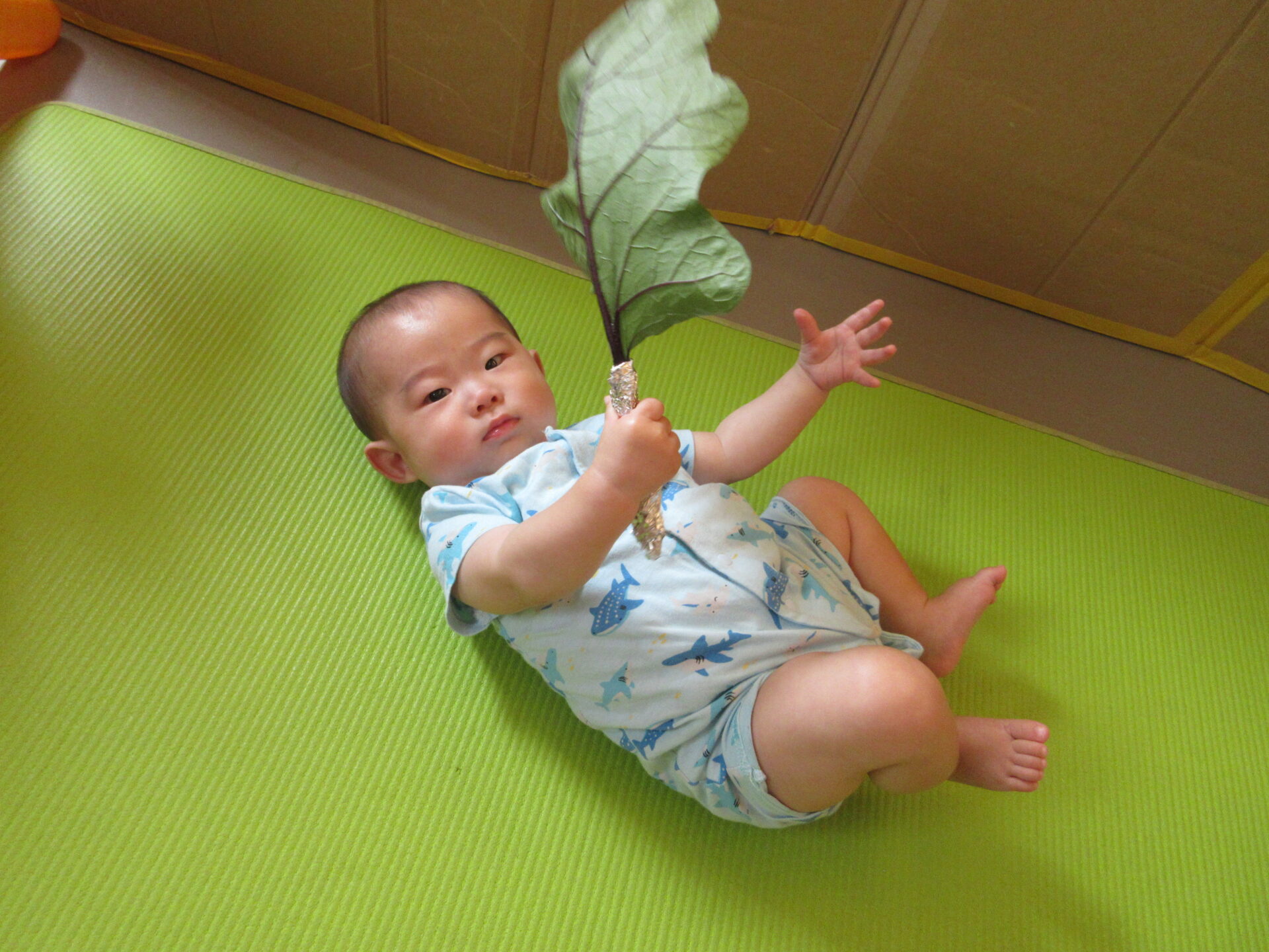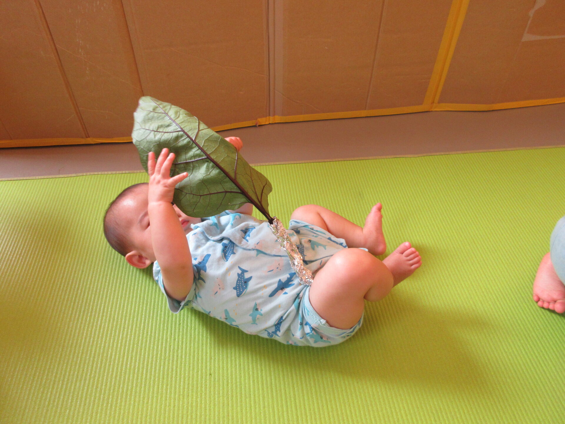 うみ組の小さなお友だちも、自分の顔よりも大きな葉っぱを持って楽しみました。