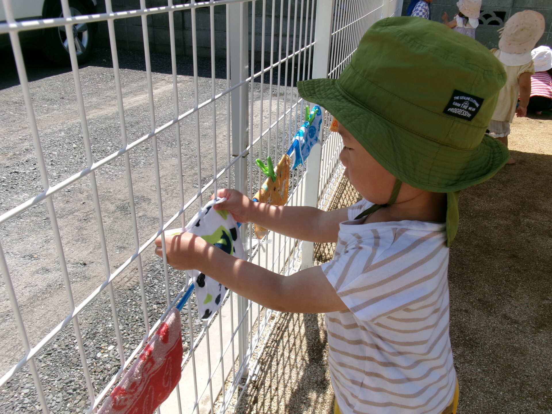 フェンスにかかった紐のところに干して、洗濯ばさみで止めました。