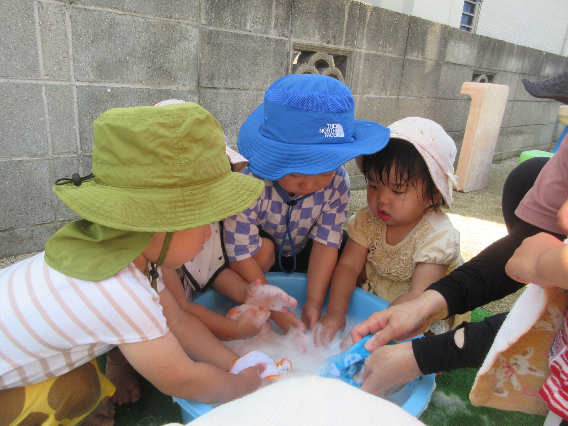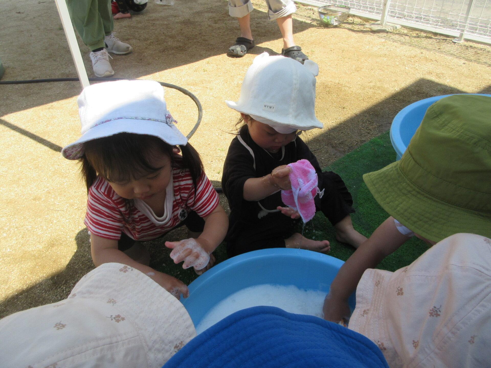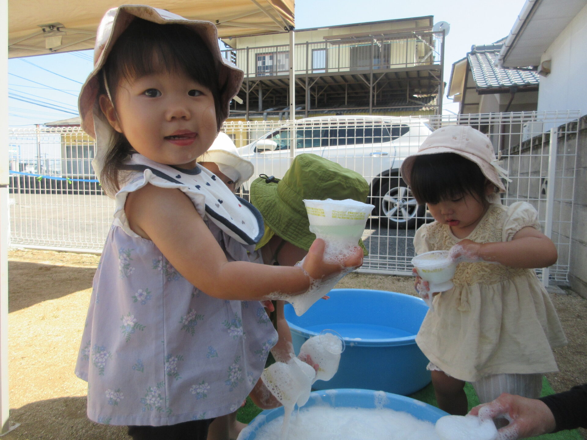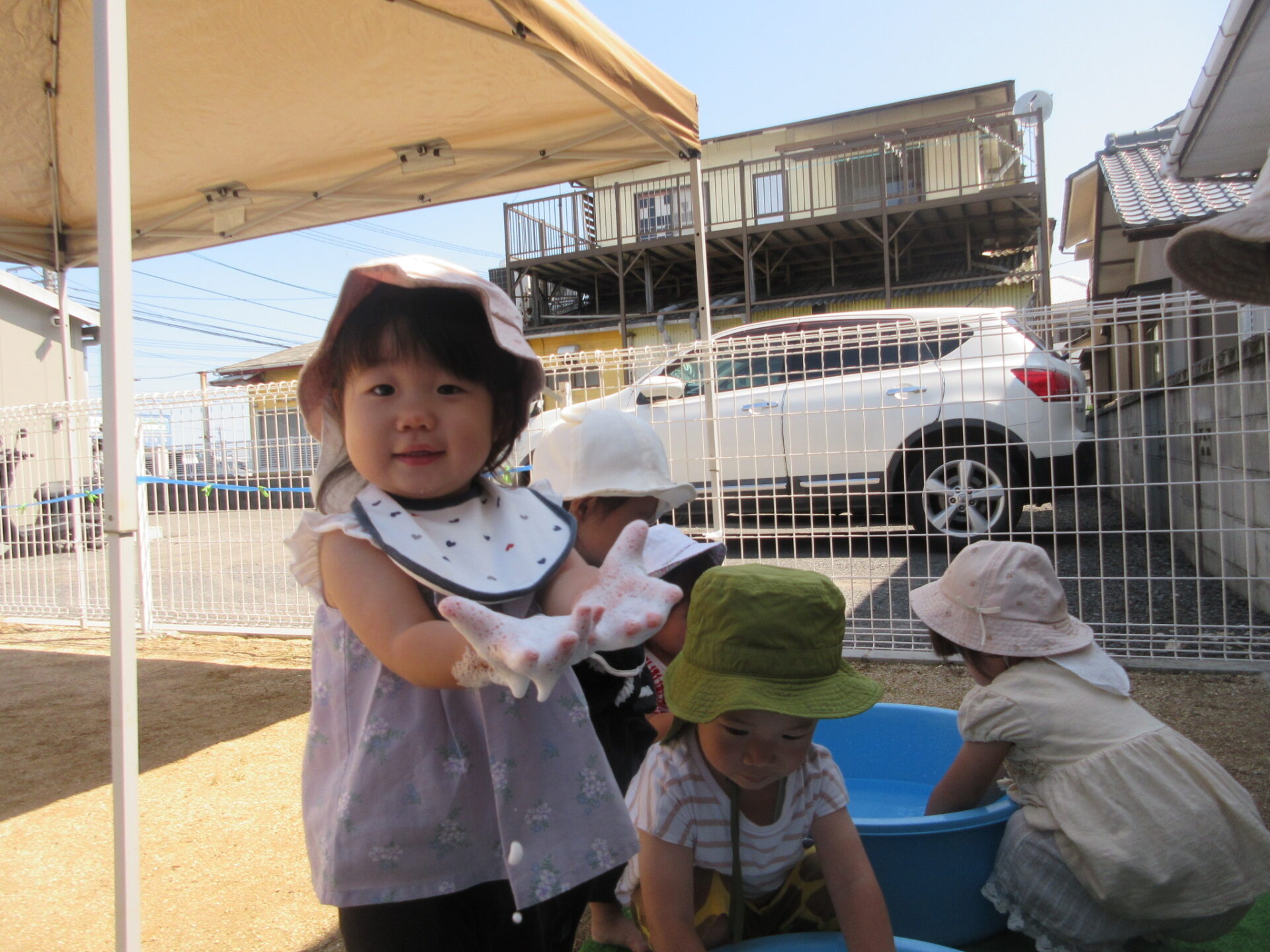 「これ~」と手に付いた泡を見せてくれました。泡がいっぱい付いて大喜びでした。