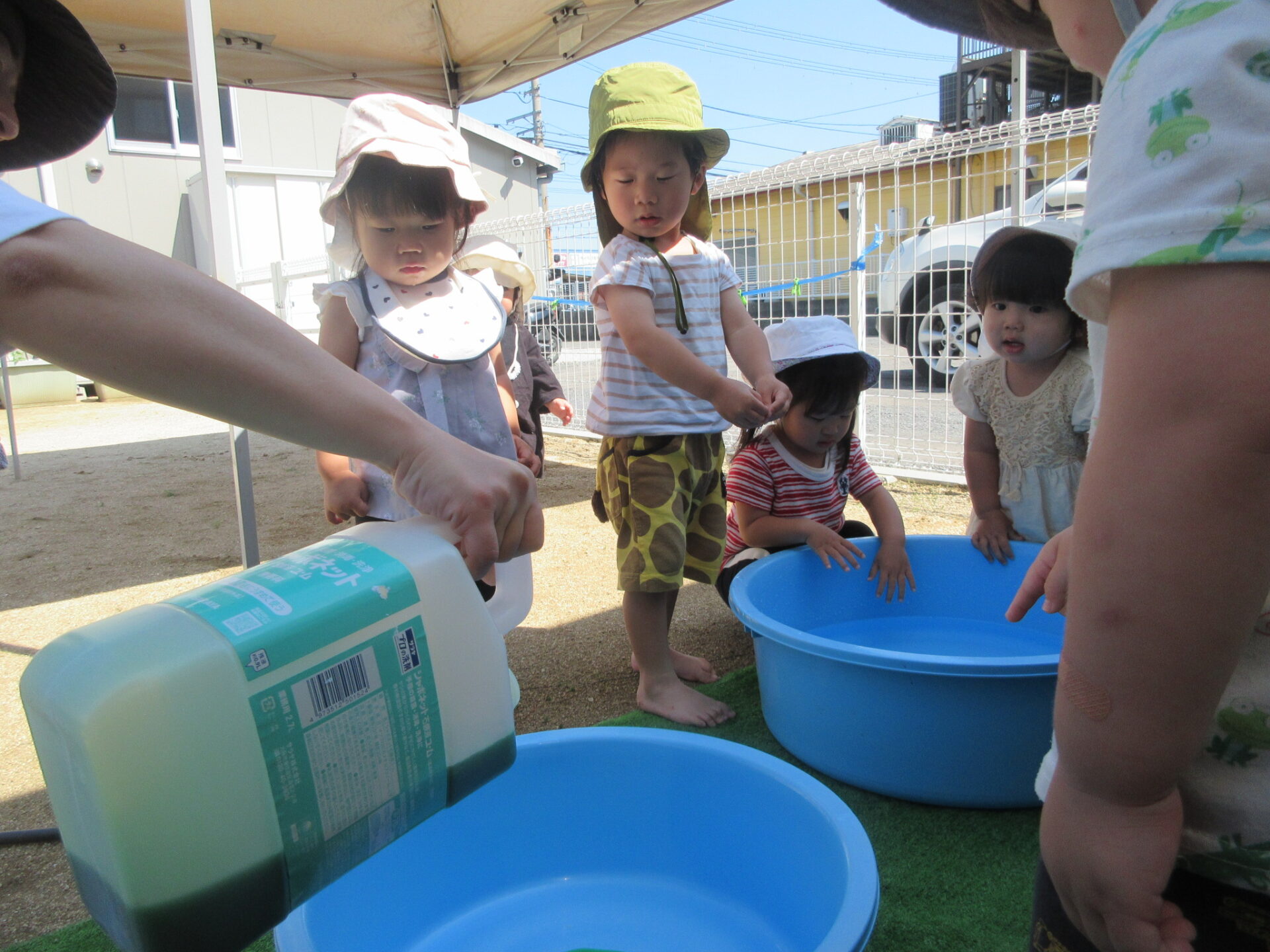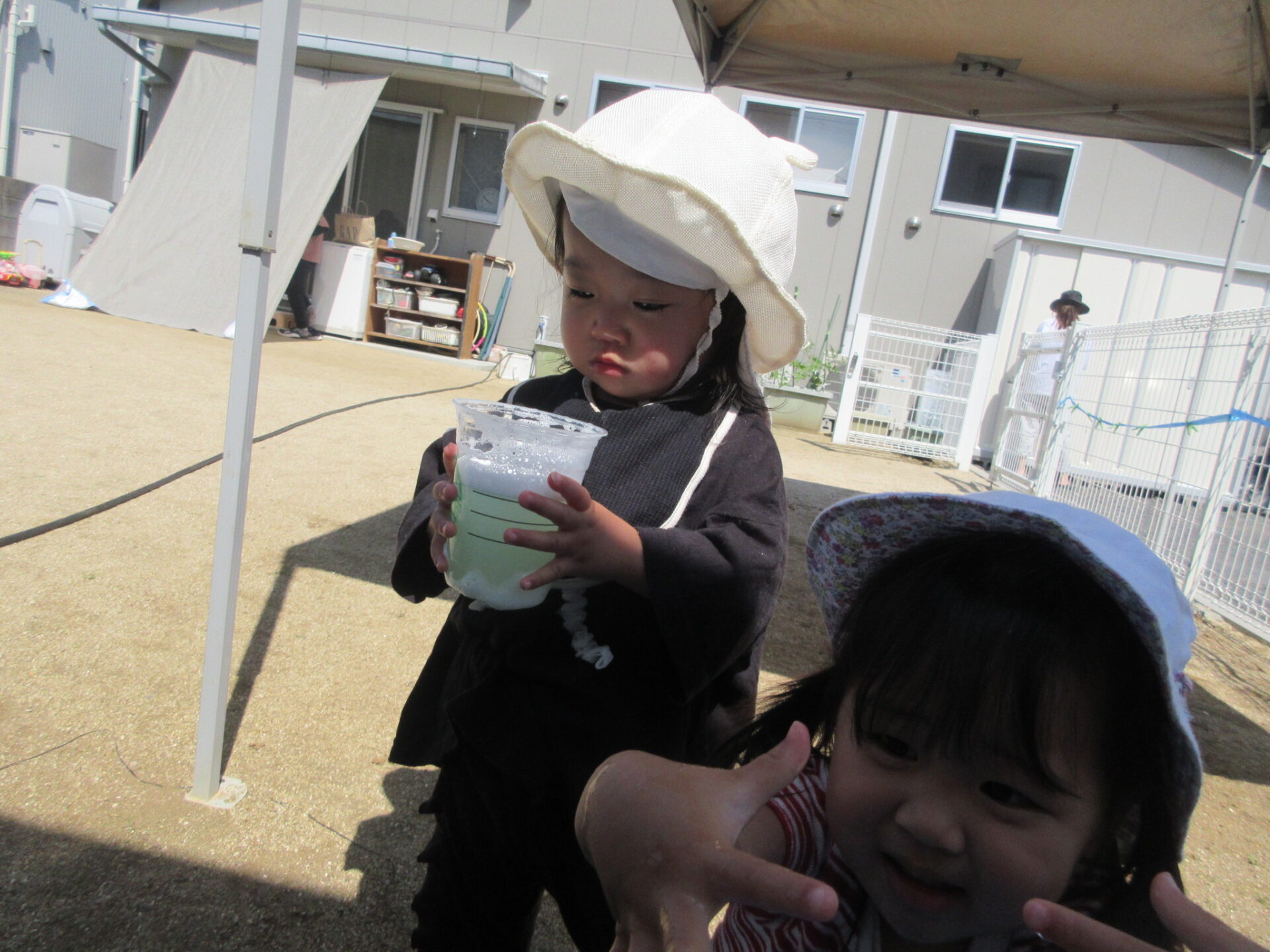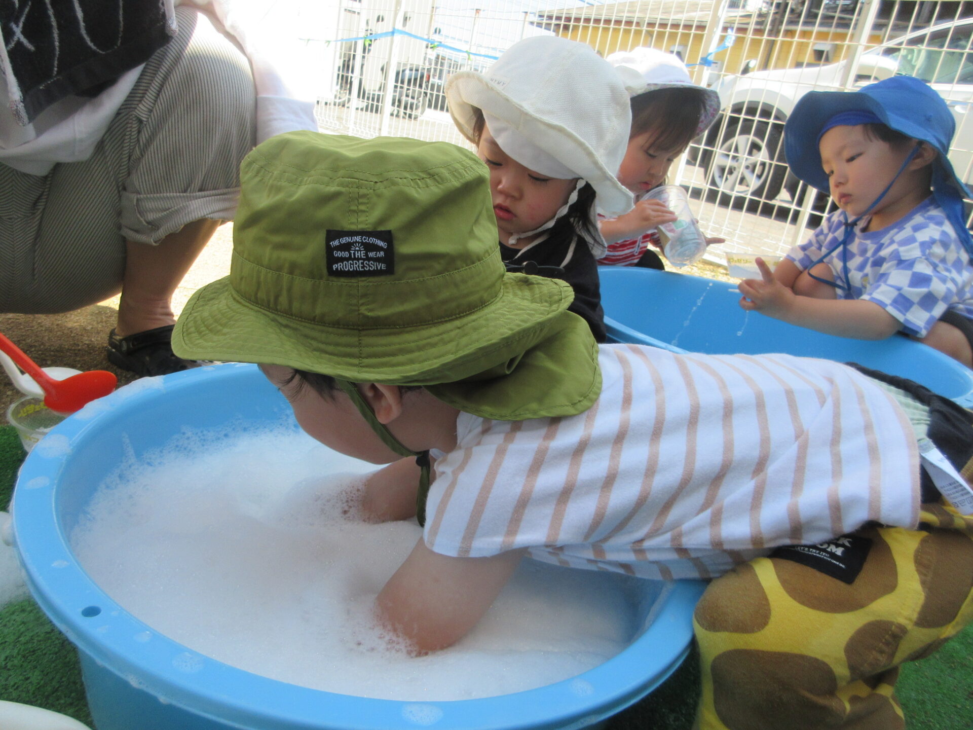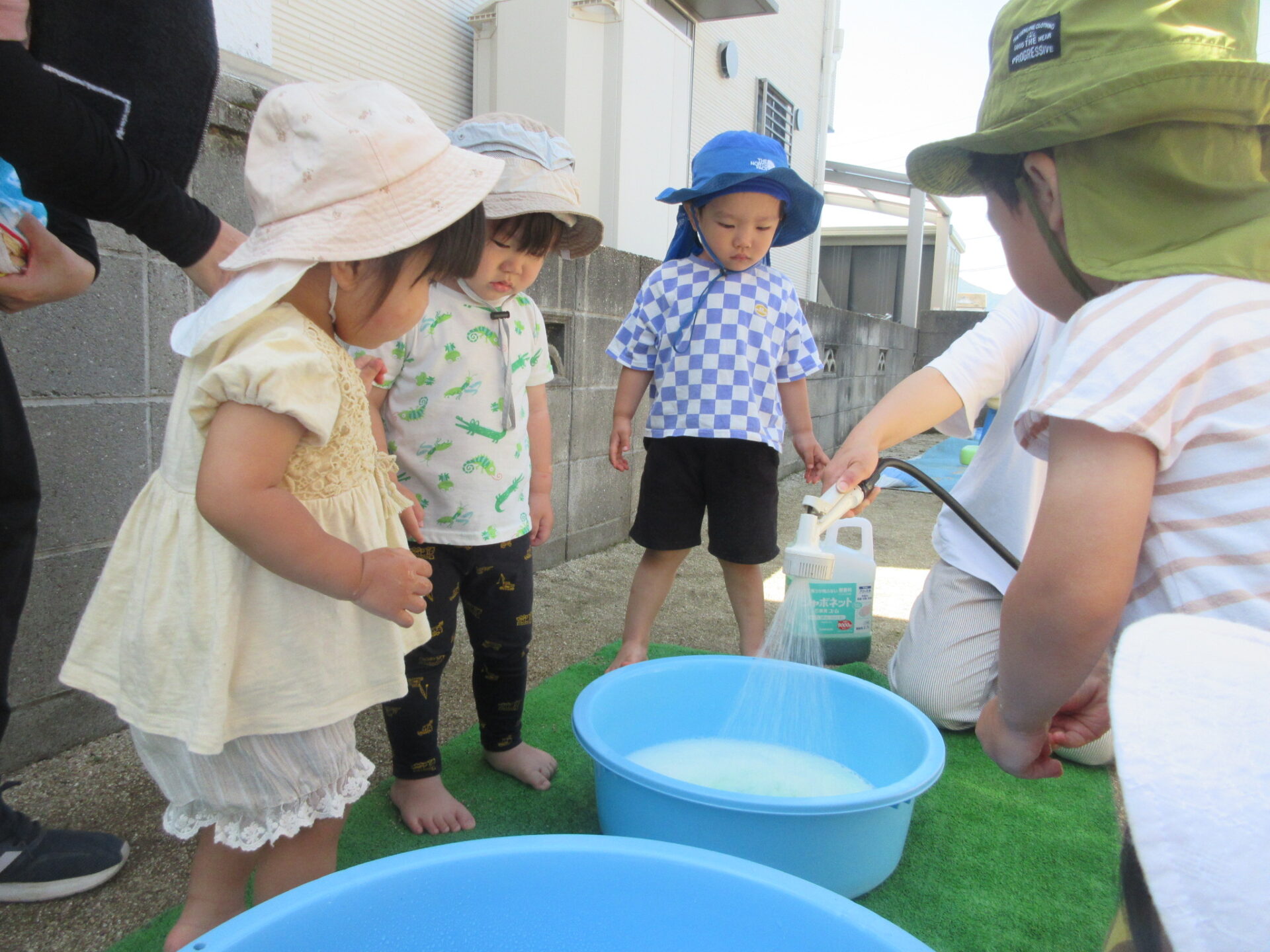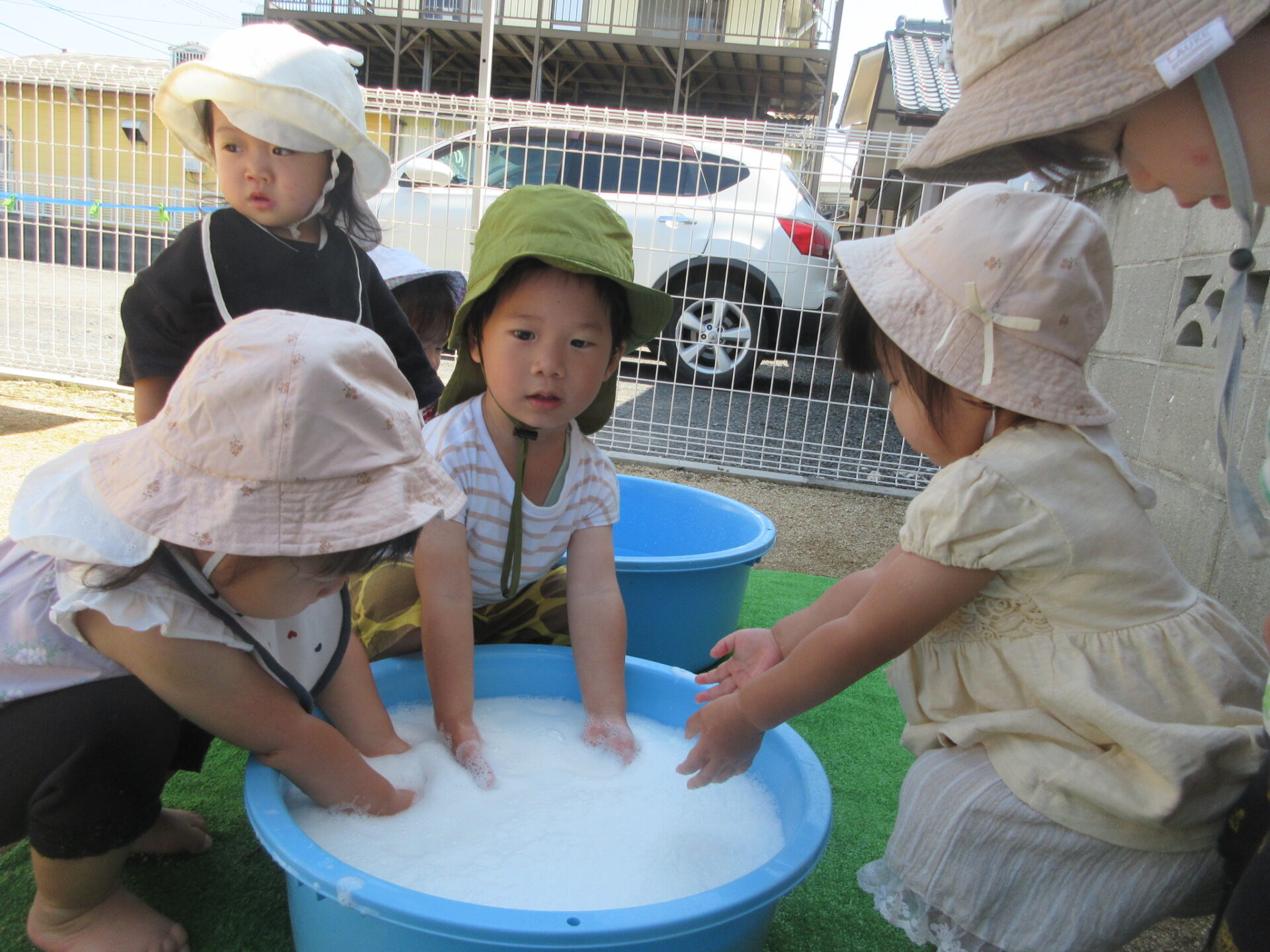 「これ~」と手に付いた泡を見せてくれました。泡がいっぱい付いて大喜びでした。