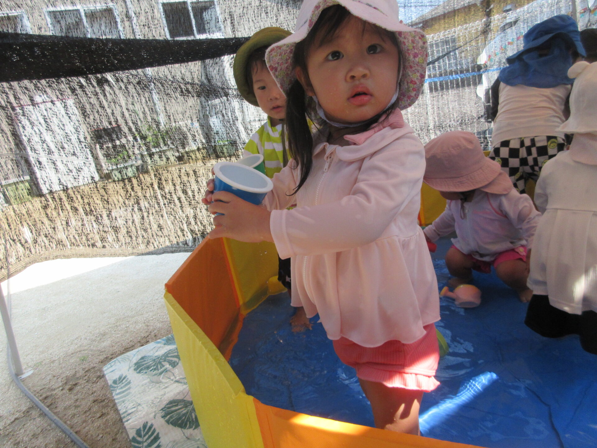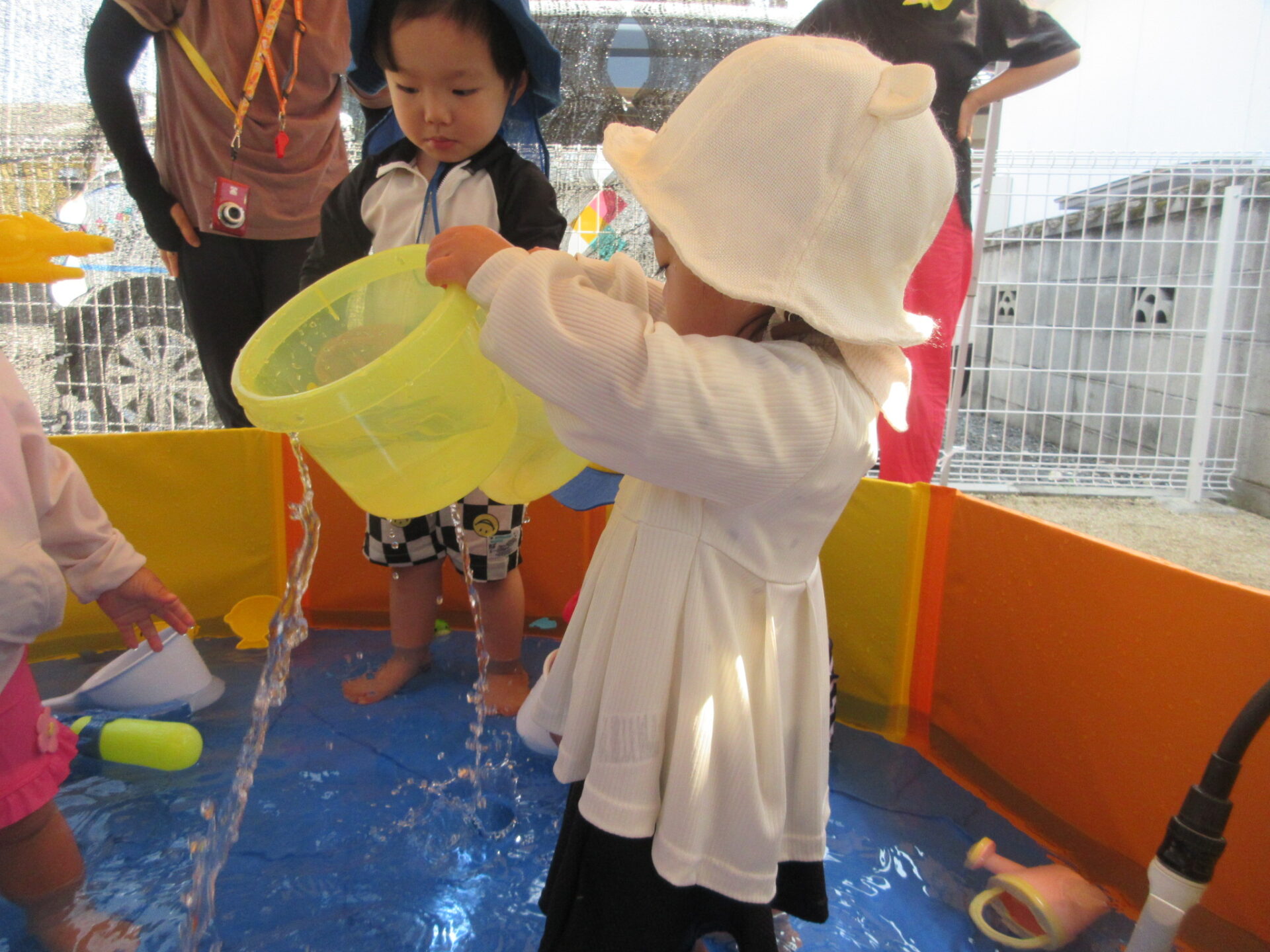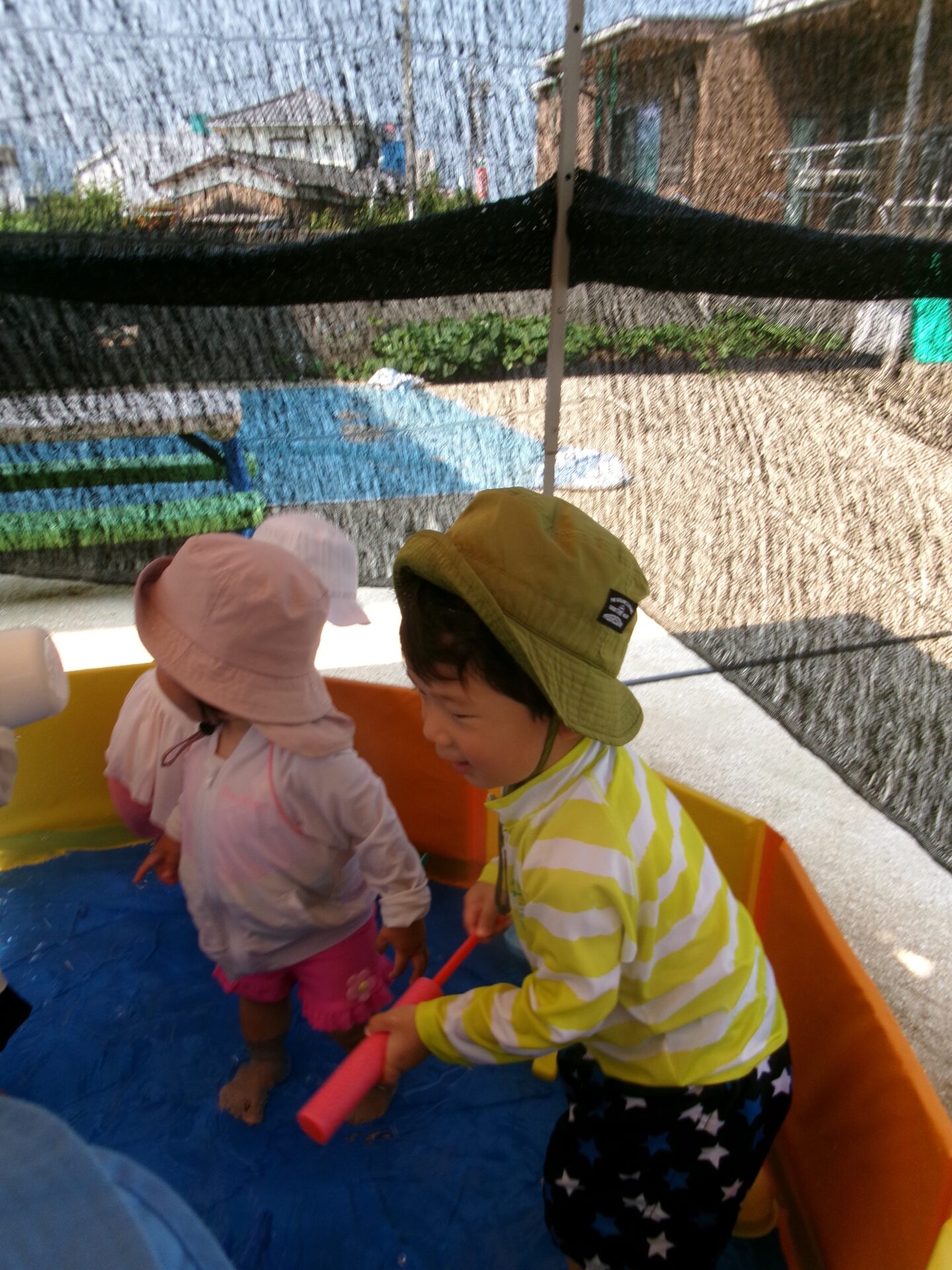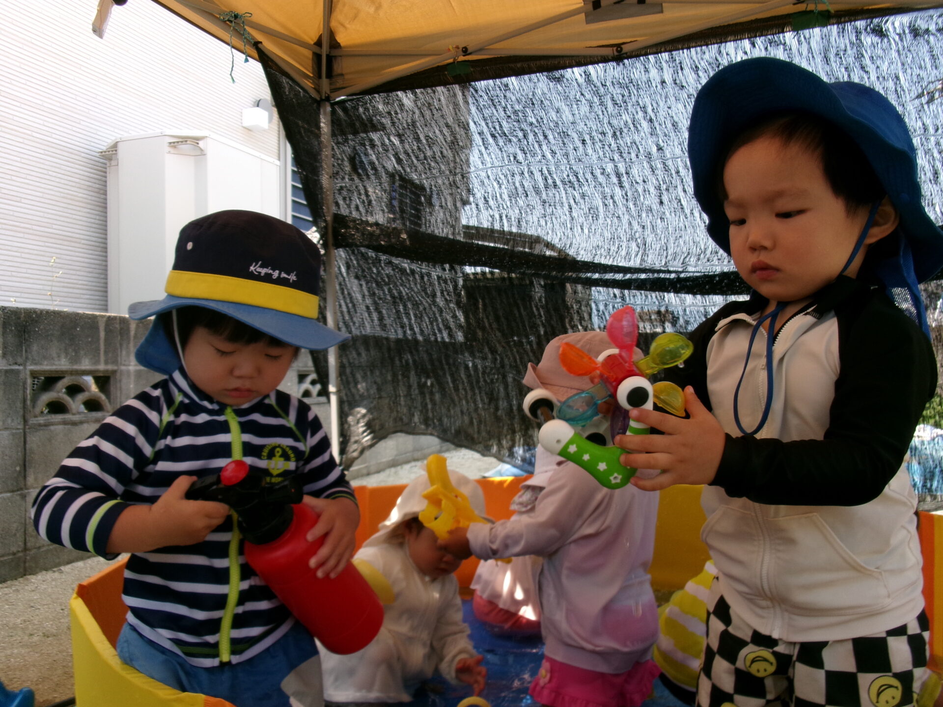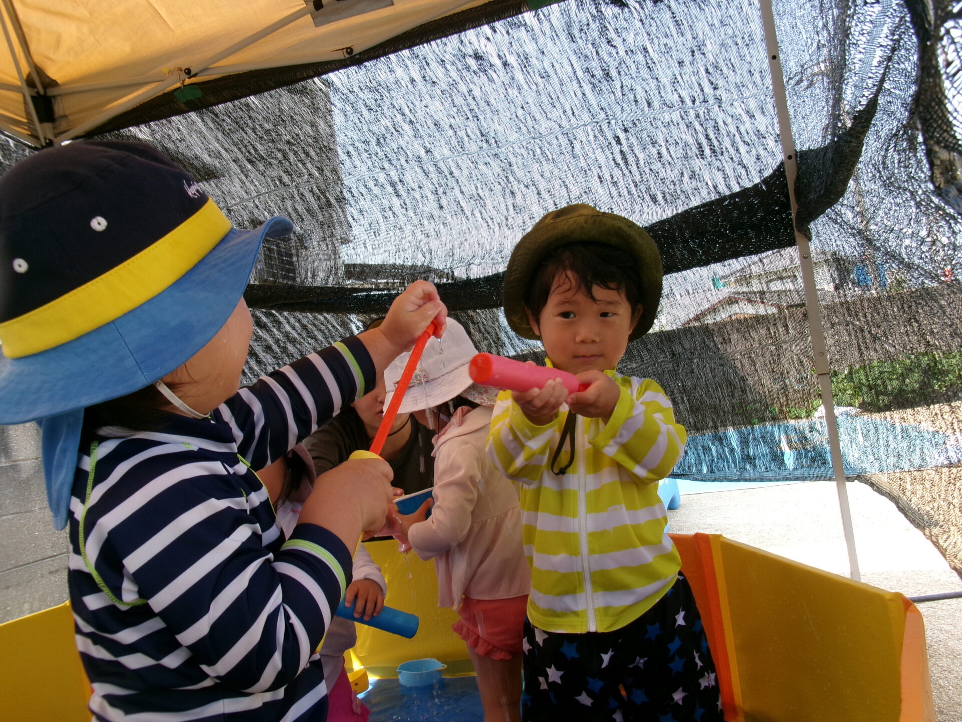 「これどうやるの?」と水鉄砲に興味津々で、水の入れ方を聞きにくると、さっそく水を入れてピューッと水を飛ばしていましたよ!