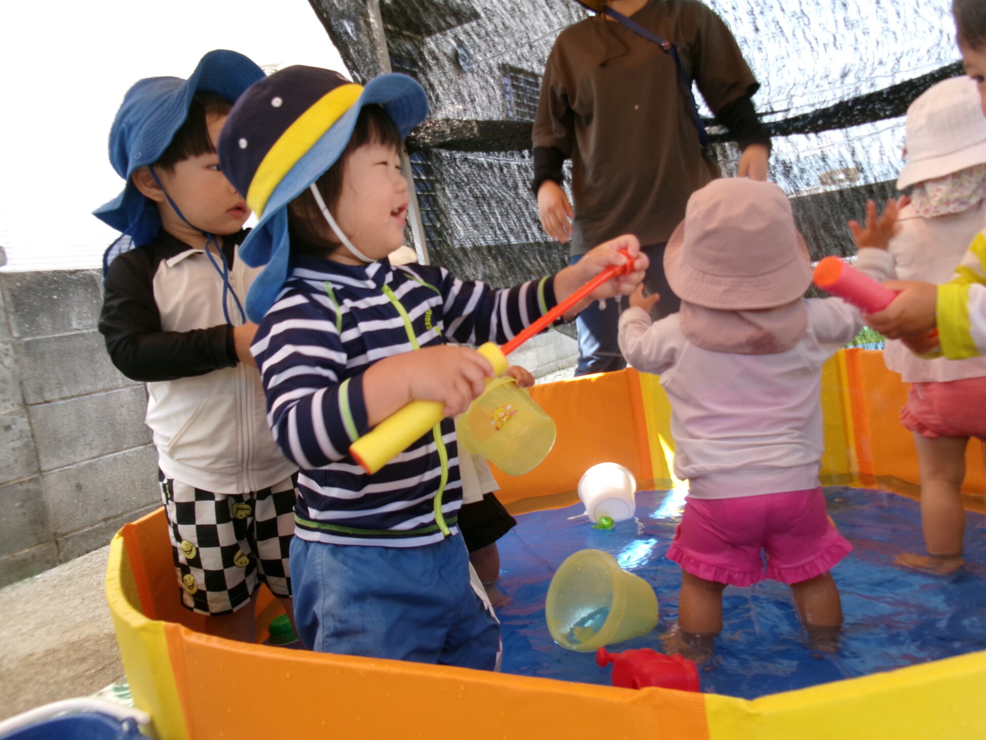 水鉄砲を反対に持っているのになぜか水が出て、飛ばしたつもりになっている子もいて、横で見ていた保育者も大笑い🤣