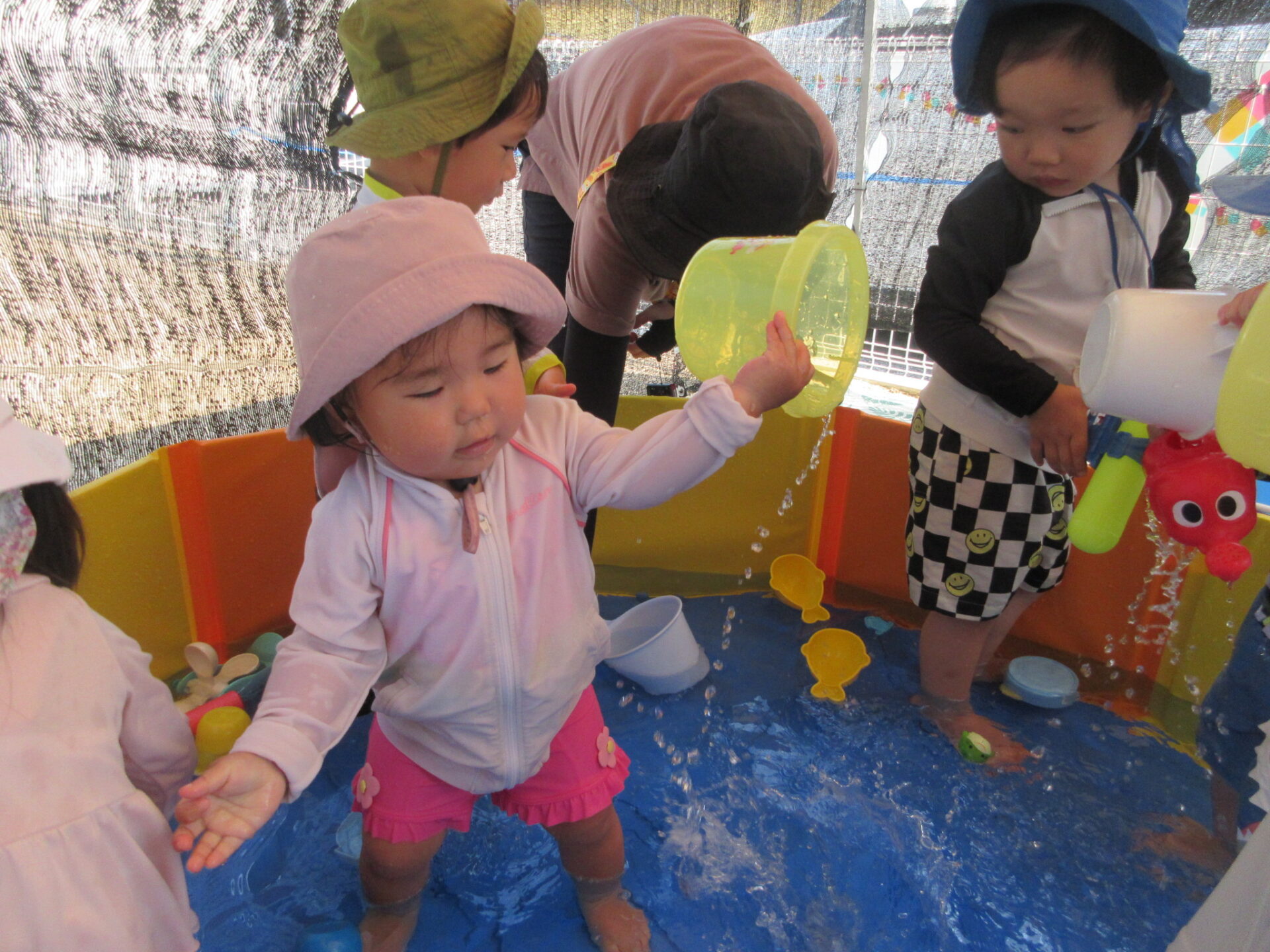 初めはじわっと入って、どの子も様子伺いしているようにおとなしめで、目新しいプール用のおもちゃを触ってみたり、水に沈めてみたりするくらいでした。