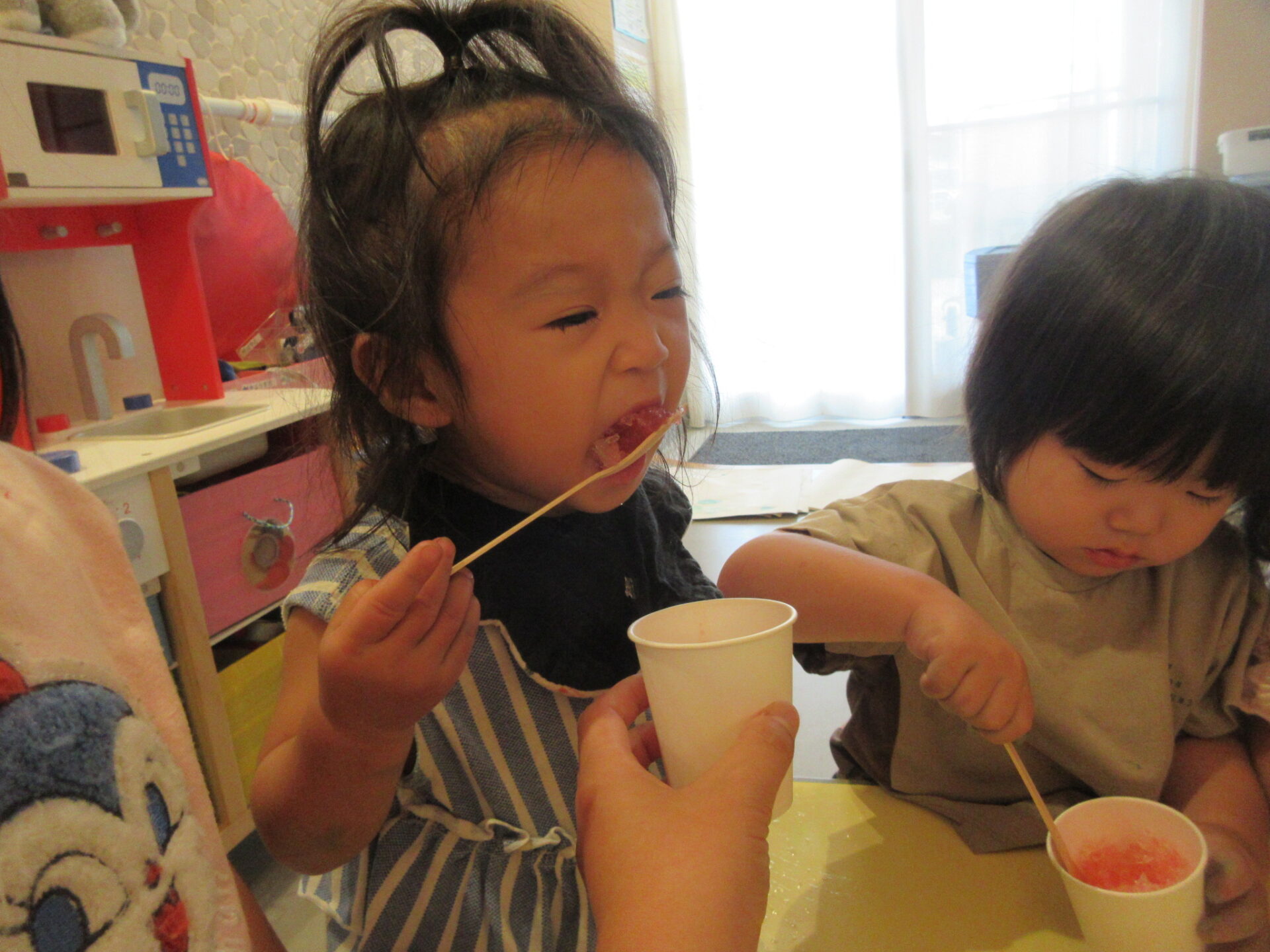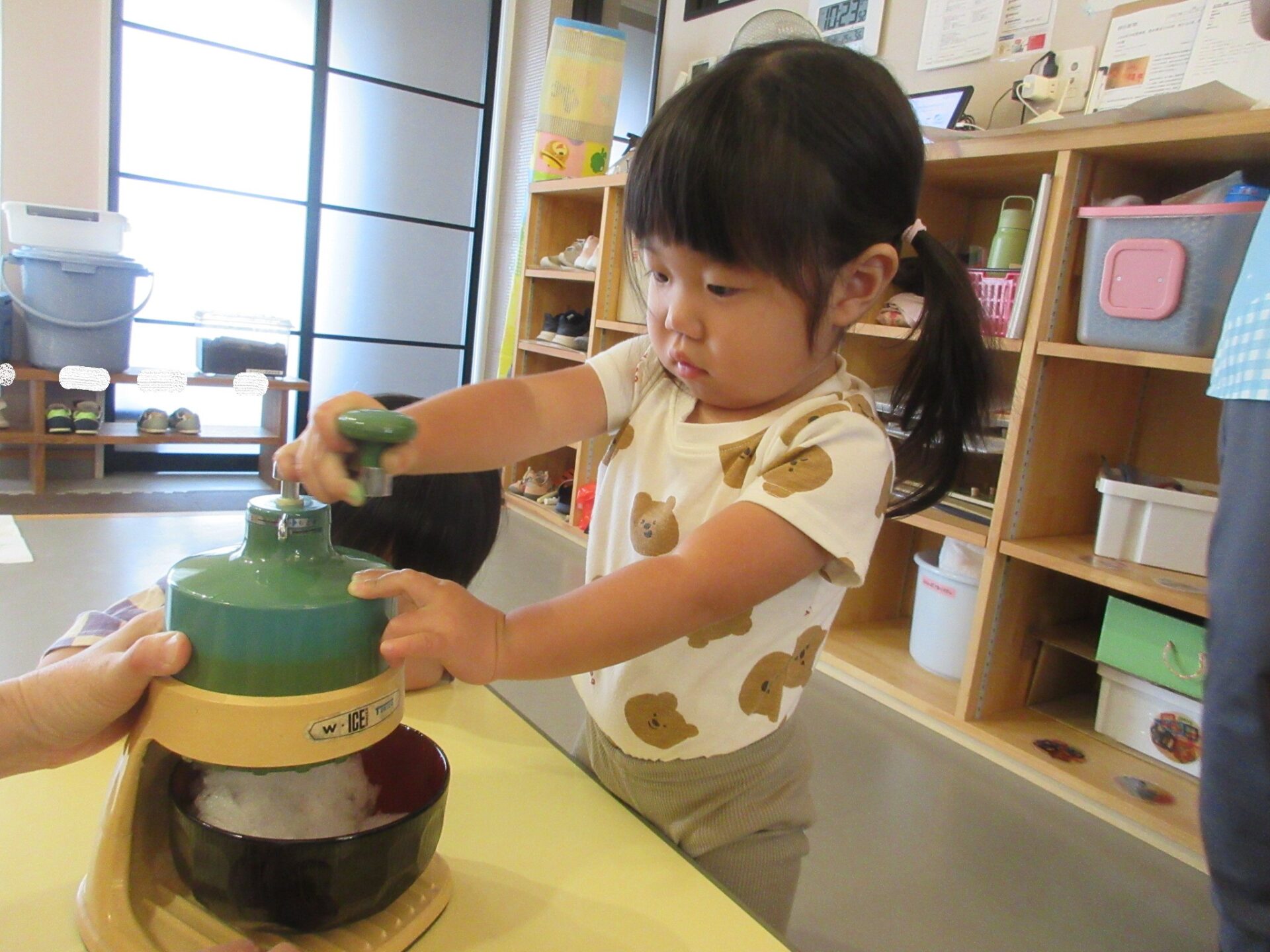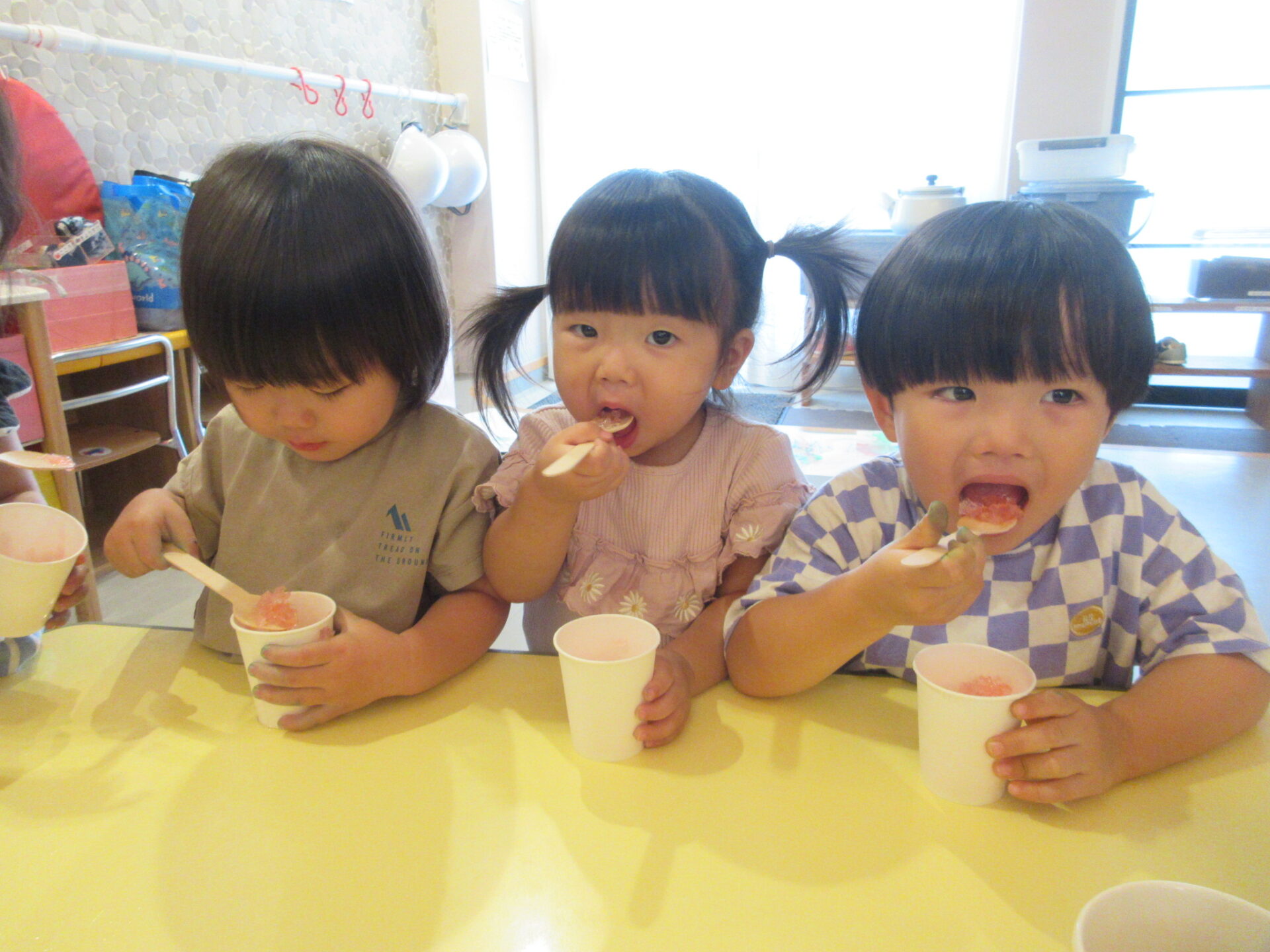 シロップをかけてもらい、「かき氷食べる人~」の声に、元気よく「は~い!!」と返事が返ってきました。