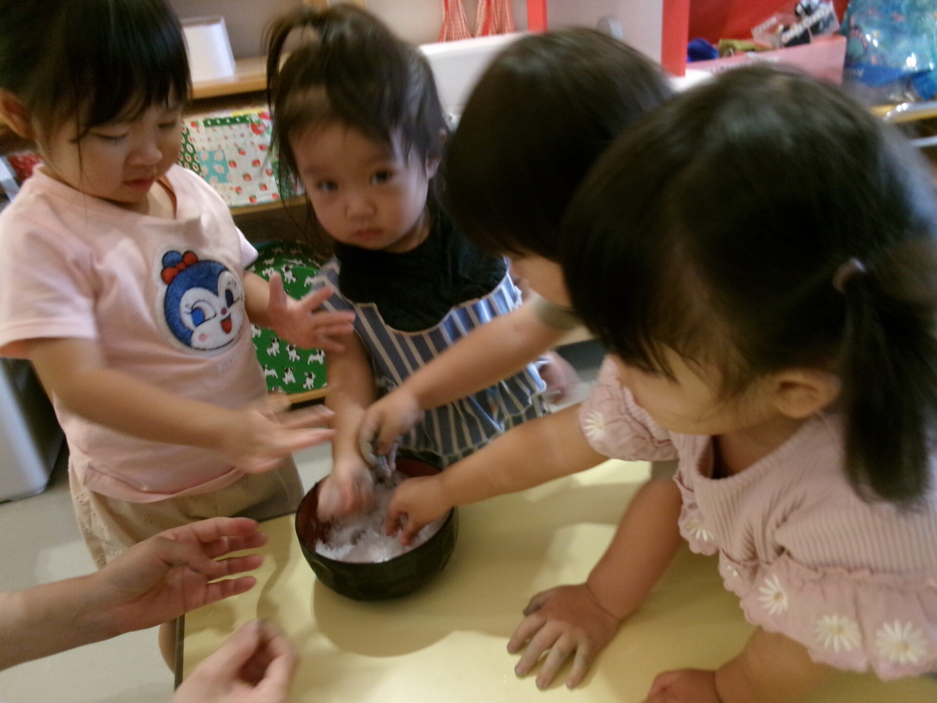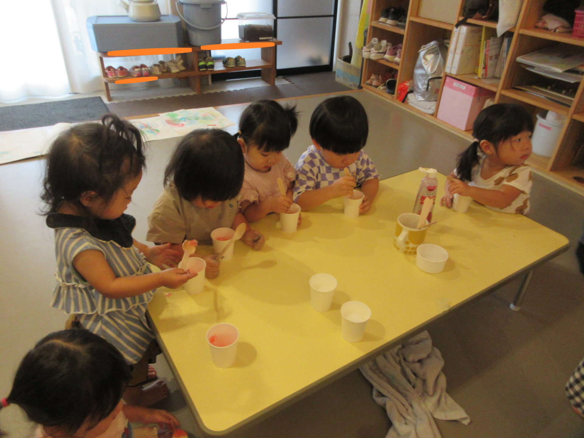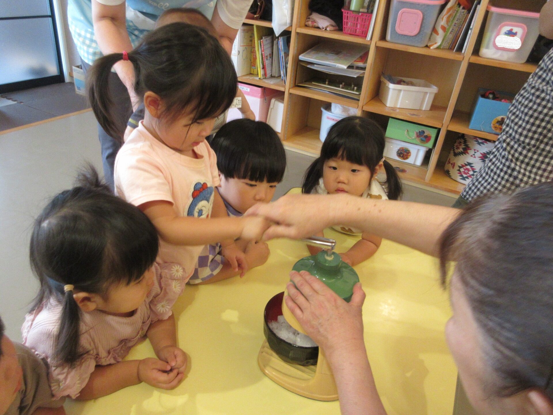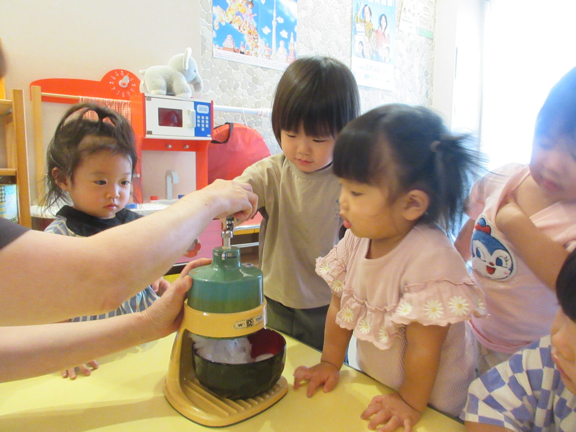 シロップをかけてもらい、「かき氷食べる人~」の声に、元気よく「は~い!!」と返事が返ってきました。
