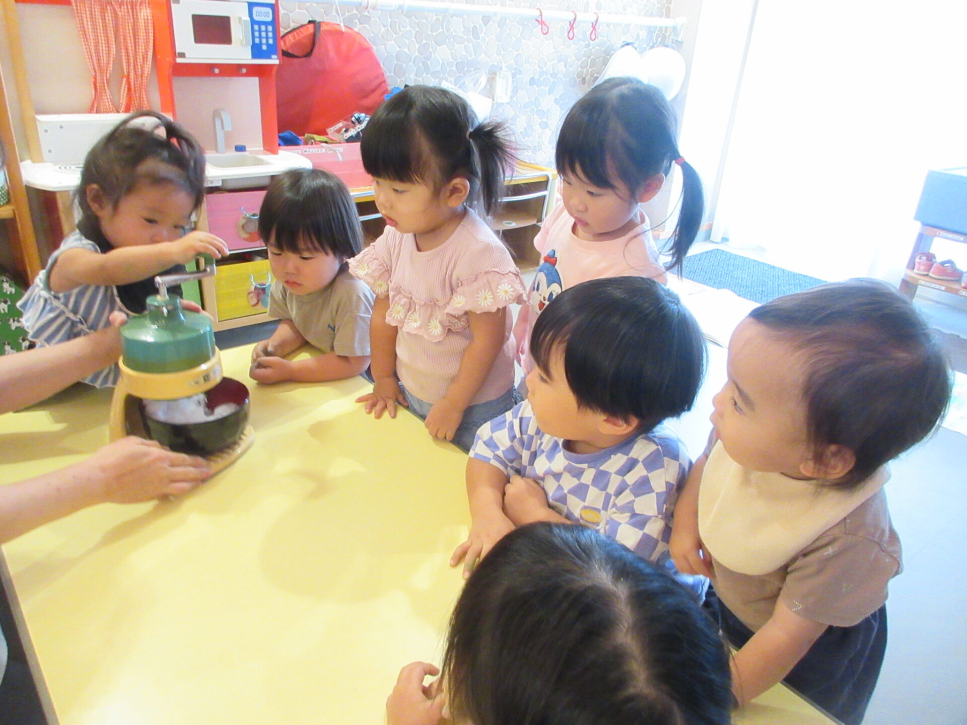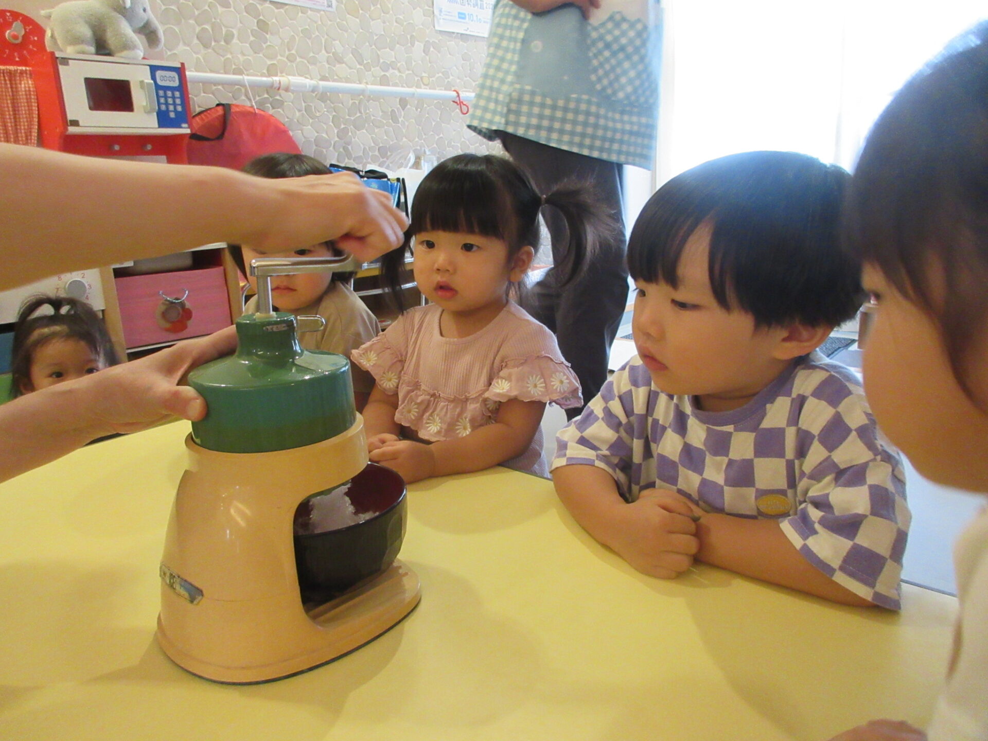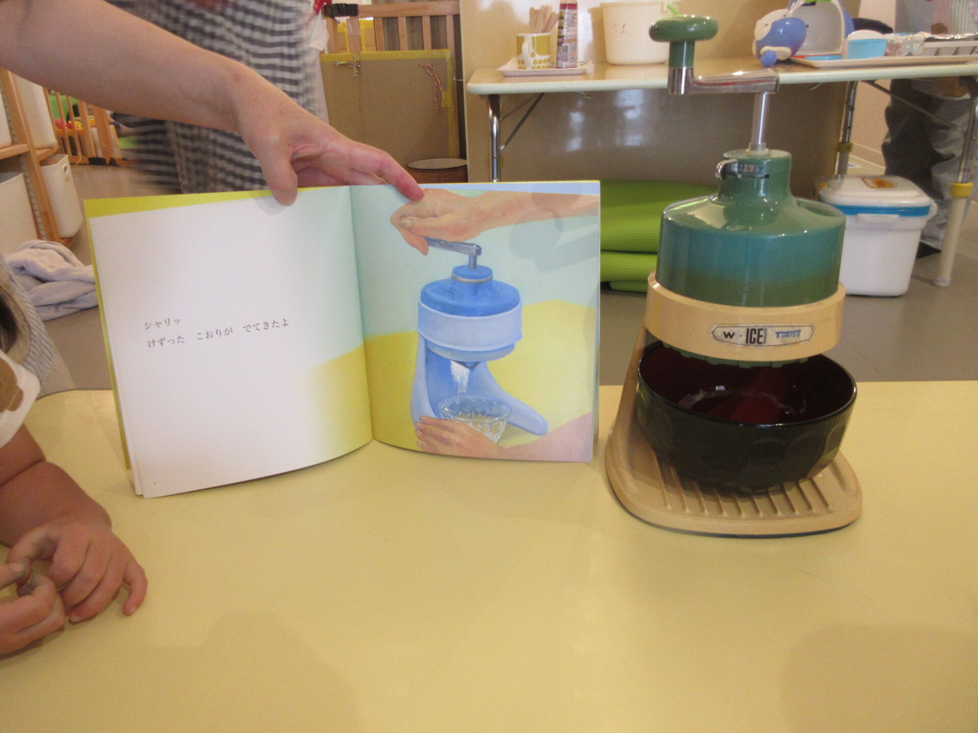 絵本と同じかき氷機を、職員が持っていたので貸してもらい、かき氷を作りました。