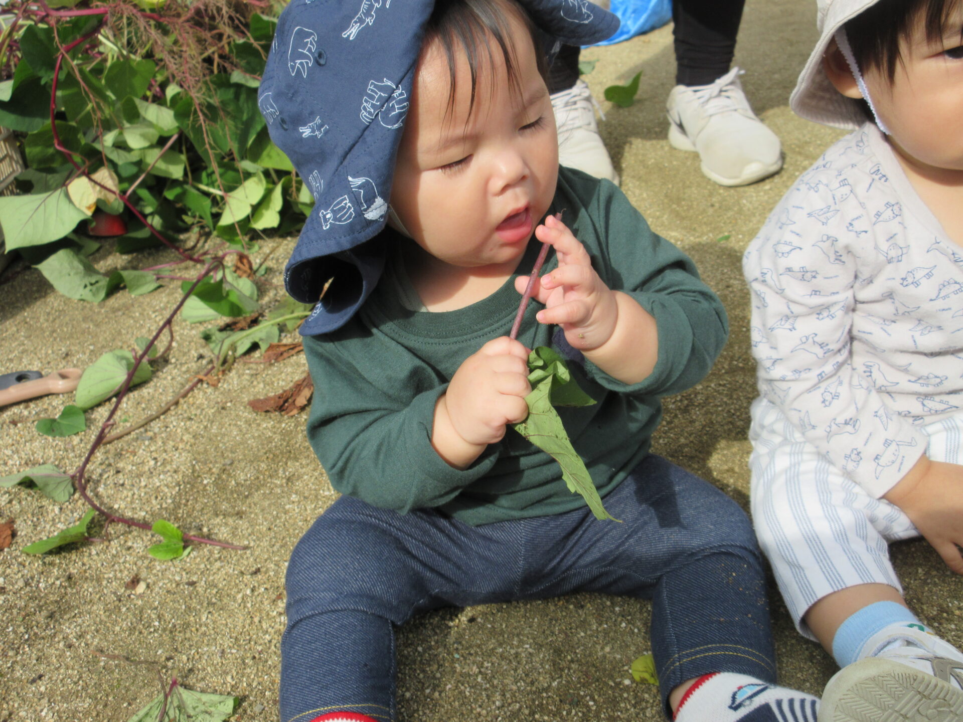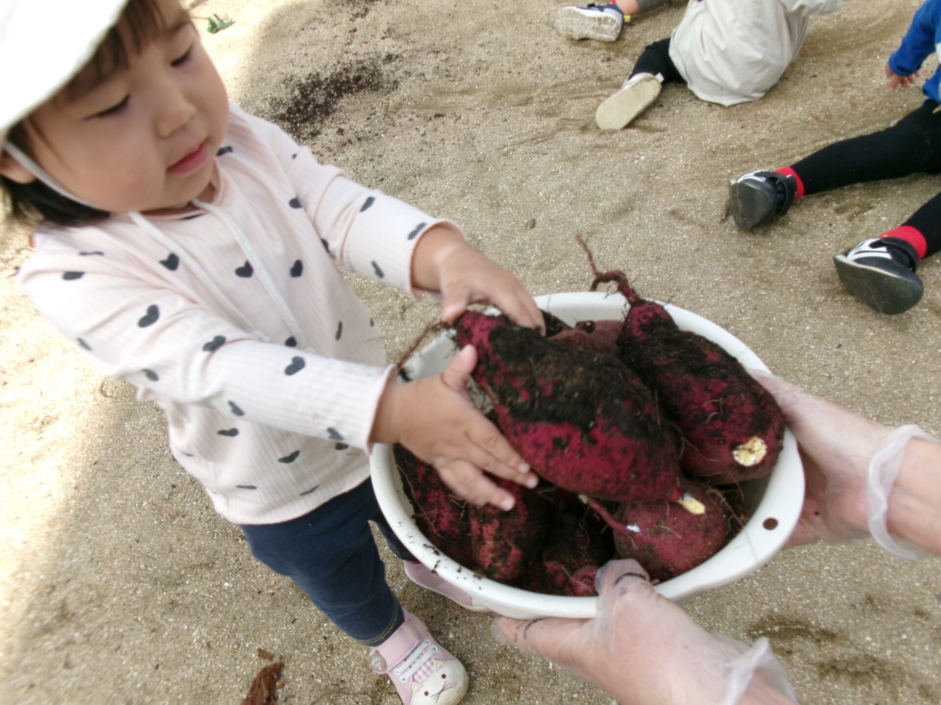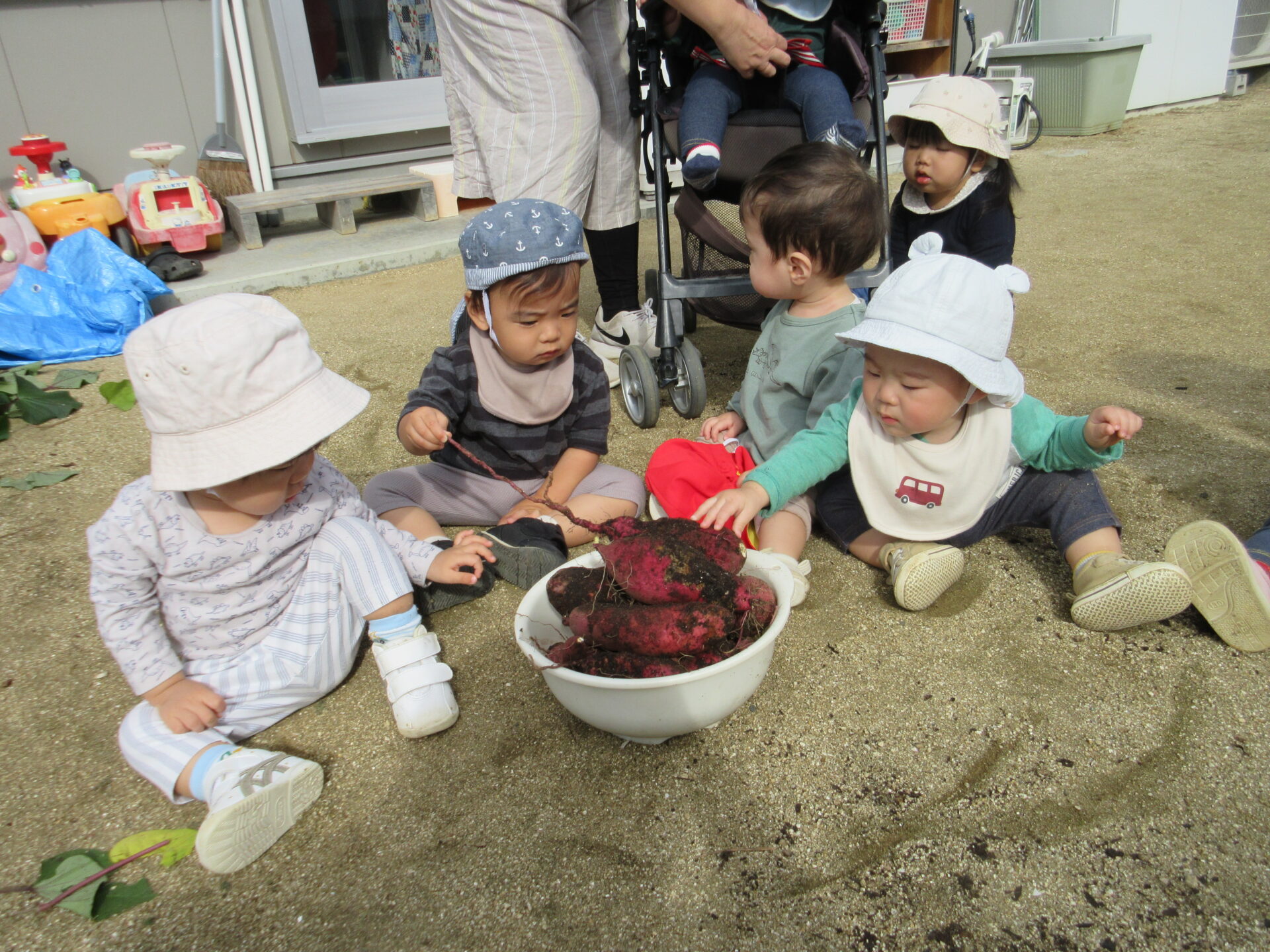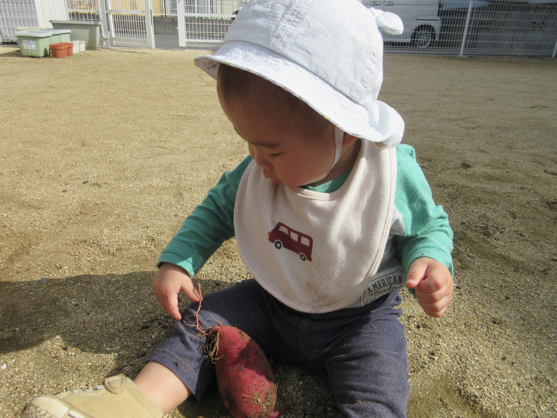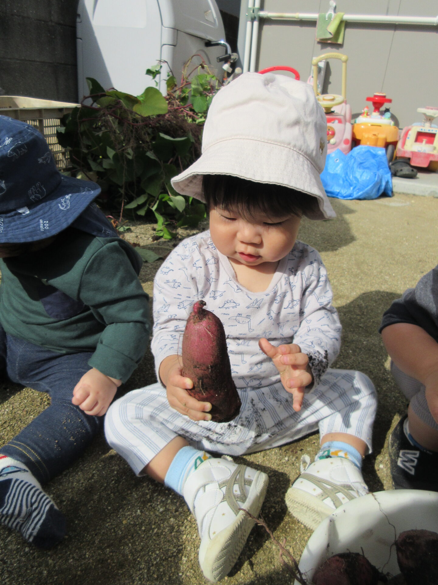 そら組(1歳児)さんは、手が汚れるのが嫌だったり、力が弱かったりして保育者が手伝うこともありましたが、お芋を運ぶことを頑張ってくれましたよ!