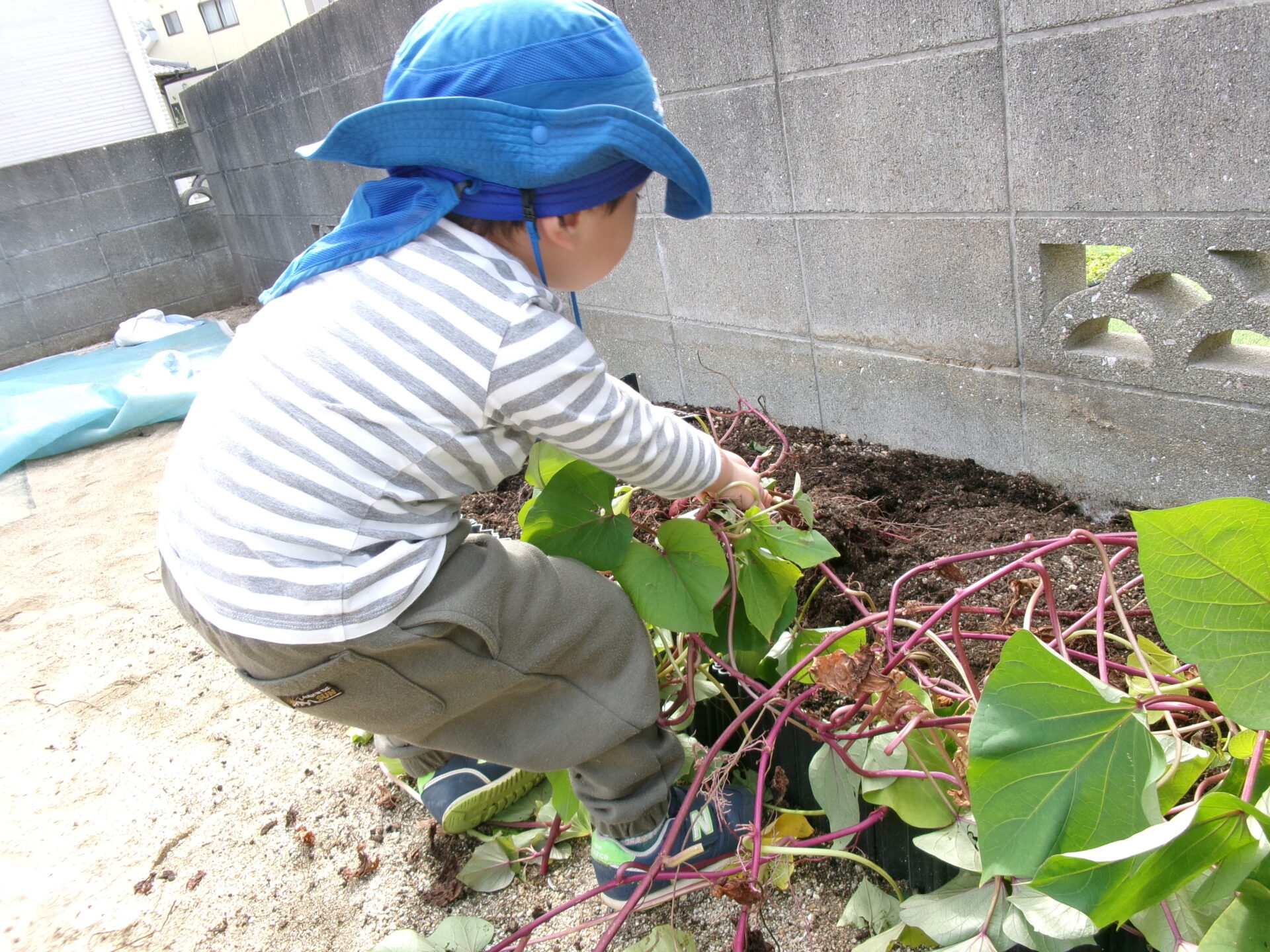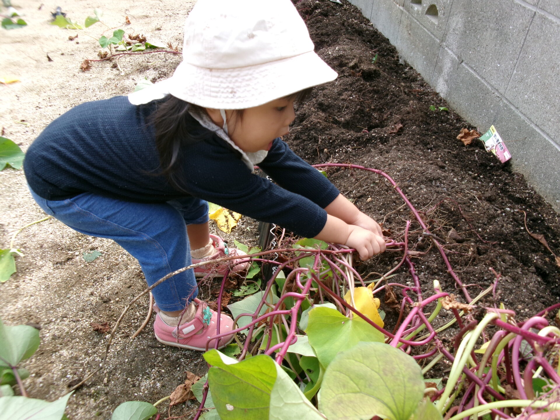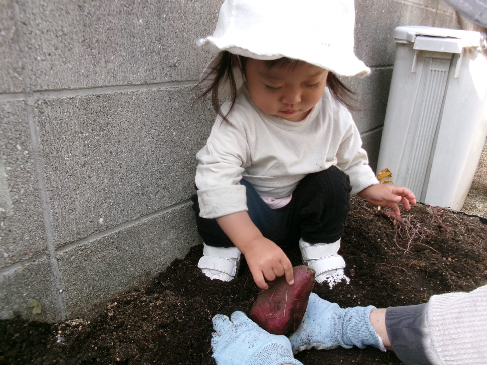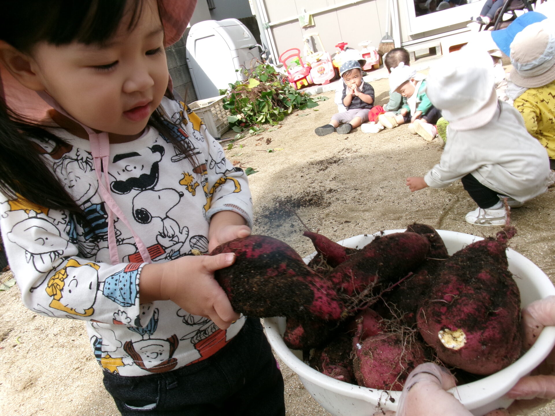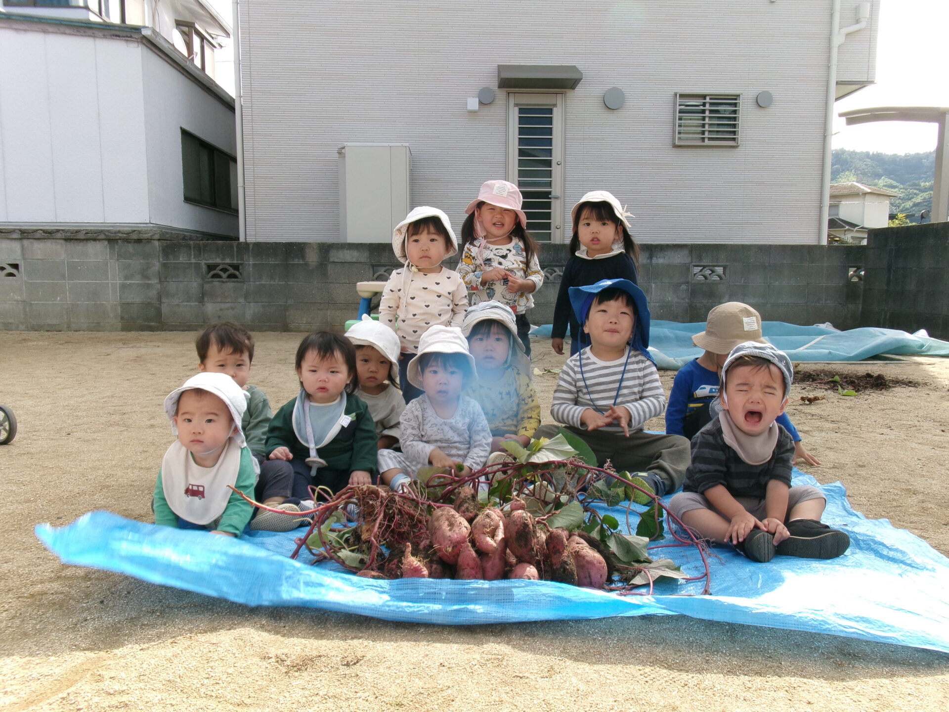 そら組(1歳児)さんは、手が汚れるのが嫌だったり、力が弱かったりして保育者が手伝うこともありましたが、お芋を運ぶことを頑張ってくれましたよ!