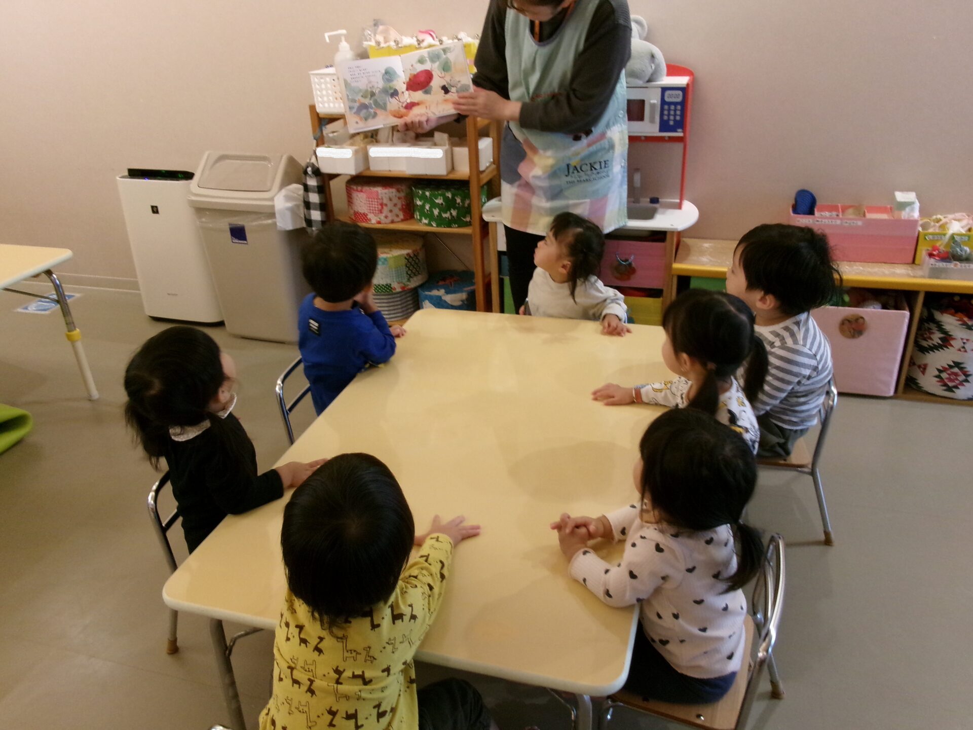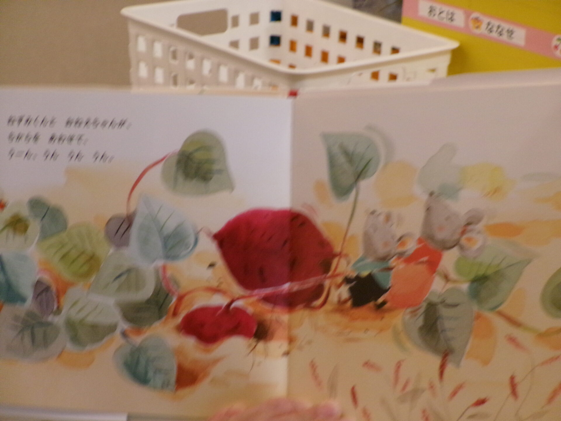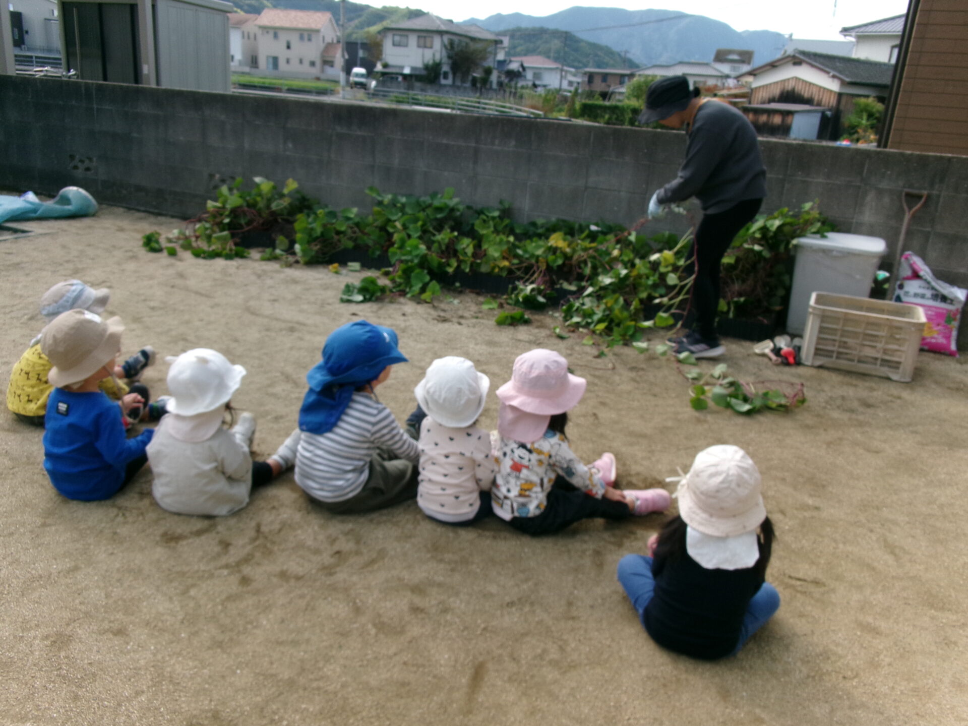 子どもたちは「♪やきいもグーチーパー」の手遊びが大好きで、歌って楽しんだり、「ほくほくおいもまつり」の絵本を見たりしながら、芋ほりの日を楽しみにしていました。