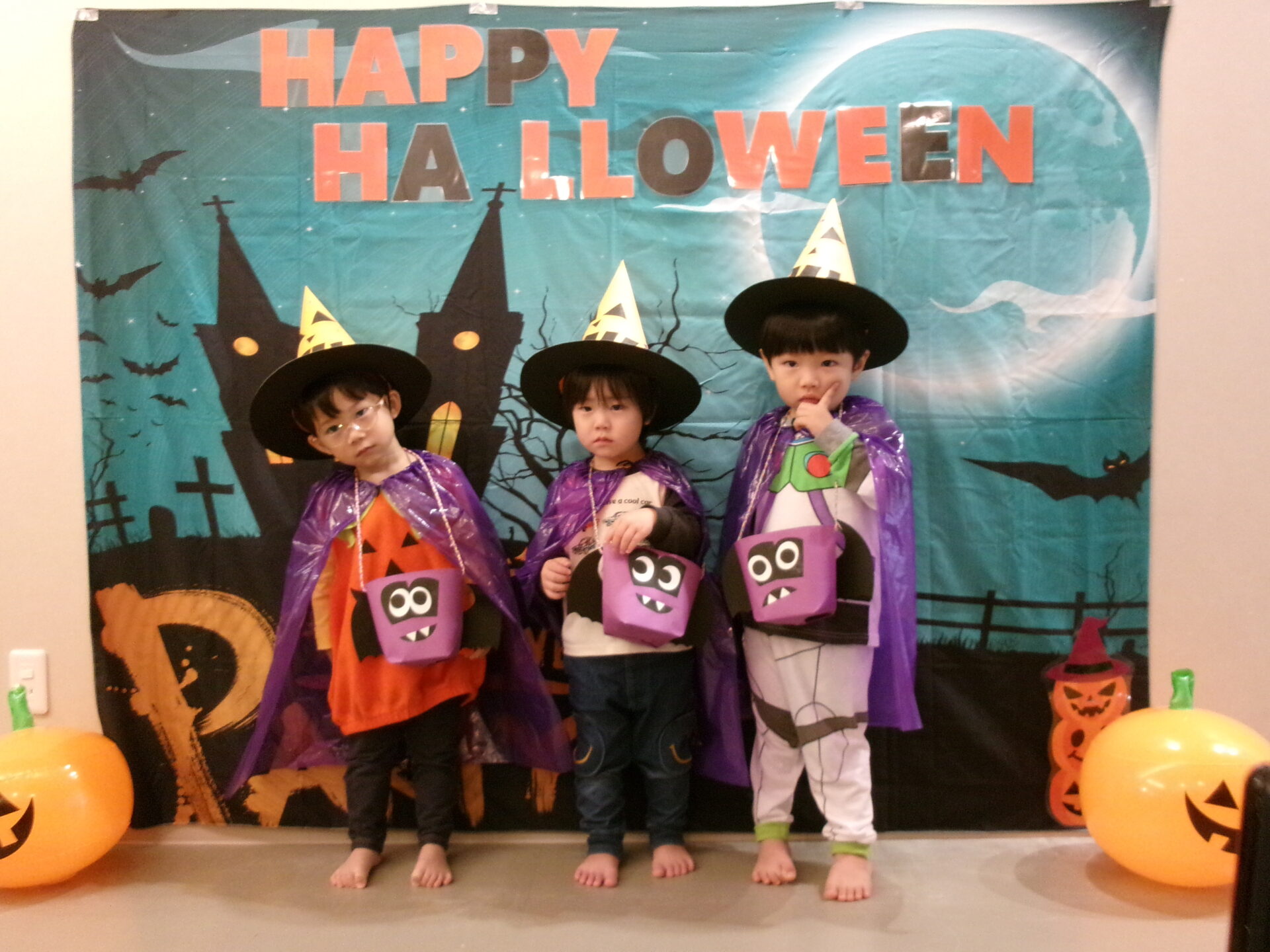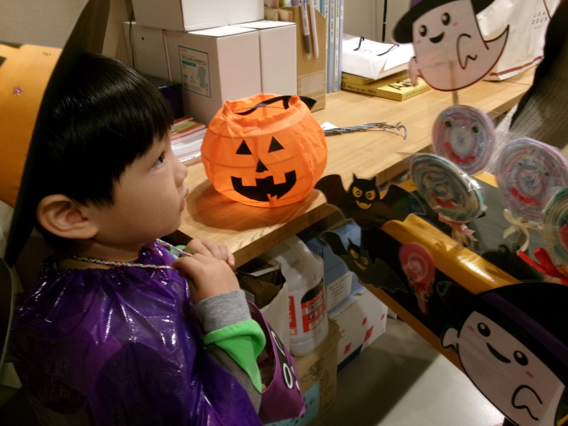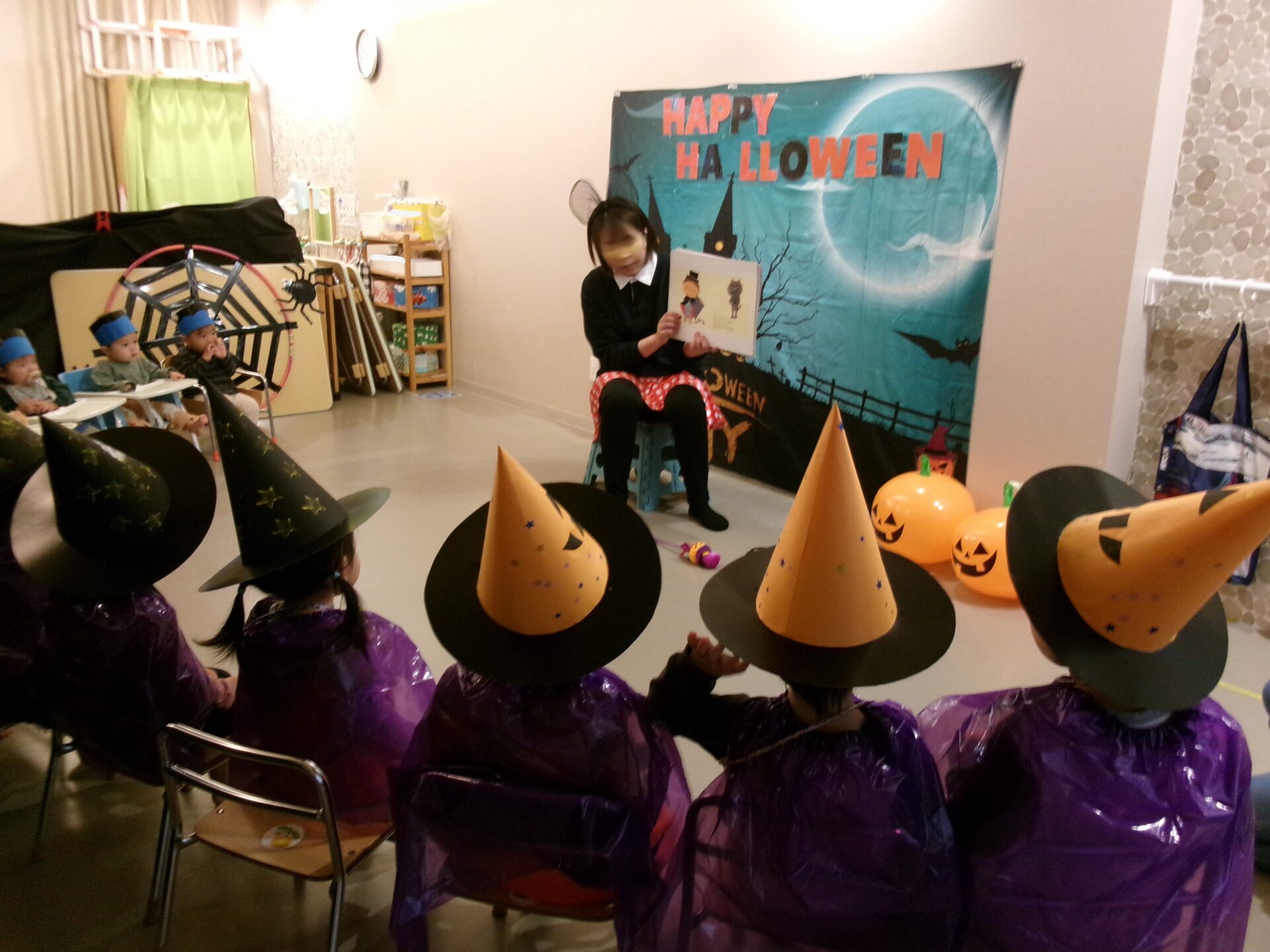 子どもたちには、他の国で、魔女やお化けに仮装して、近くの家々を訪れてお菓子をもらったりする日と言うことを絵本を通じて伝えました。