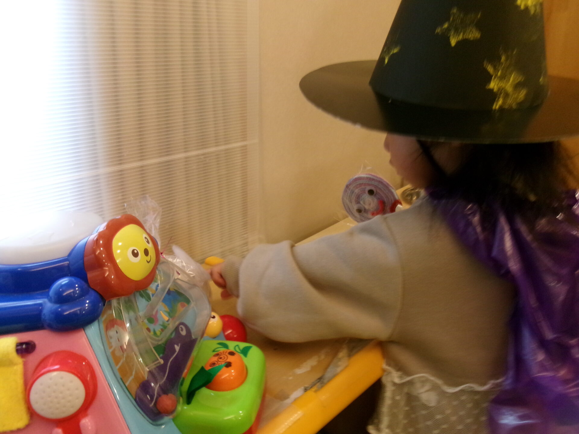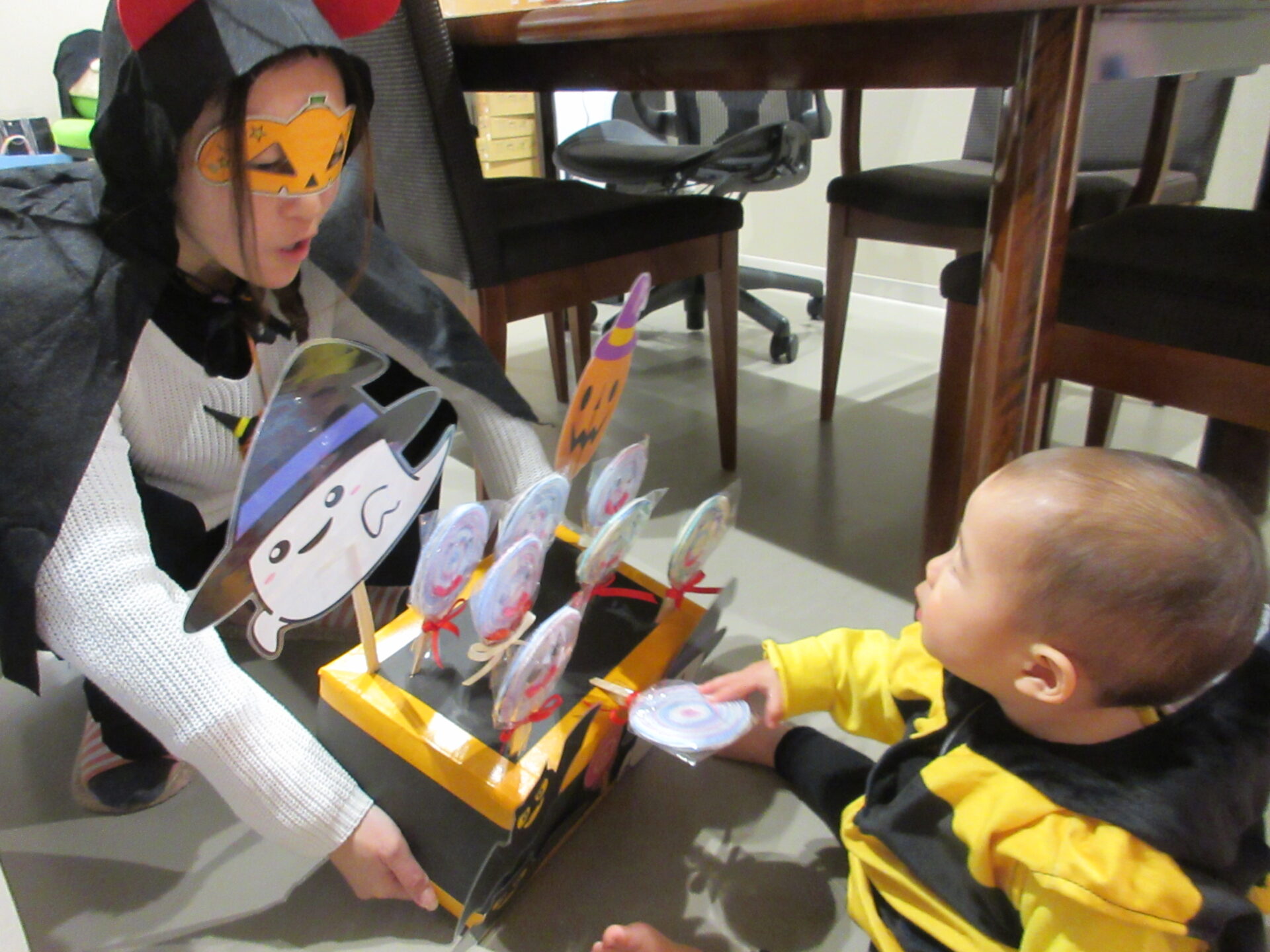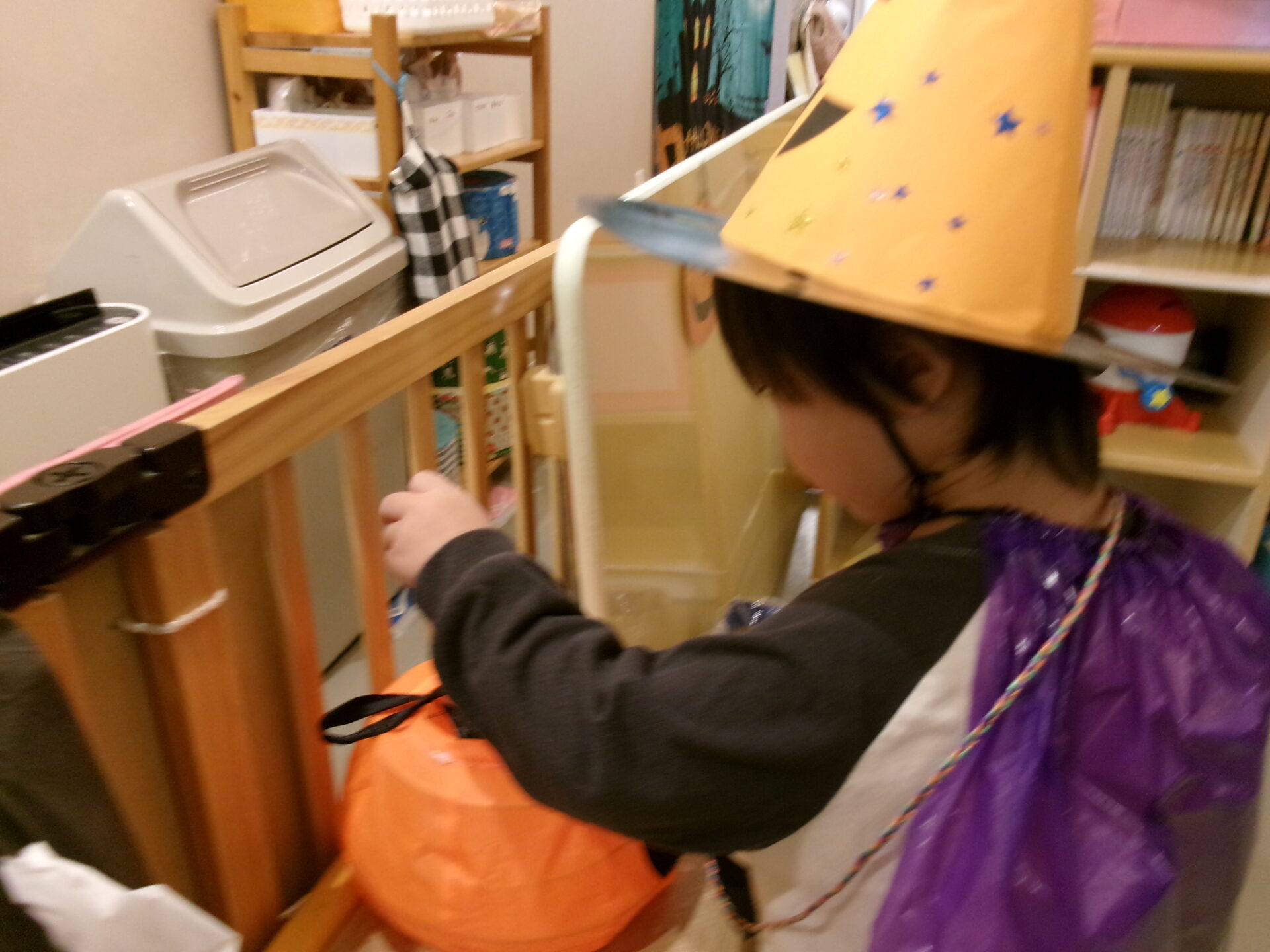 子どもたちには、他の国で、魔女やお化けに仮装して、近くの家々を訪れてお菓子をもらったりする日と言うことを絵本を通じて伝えました。