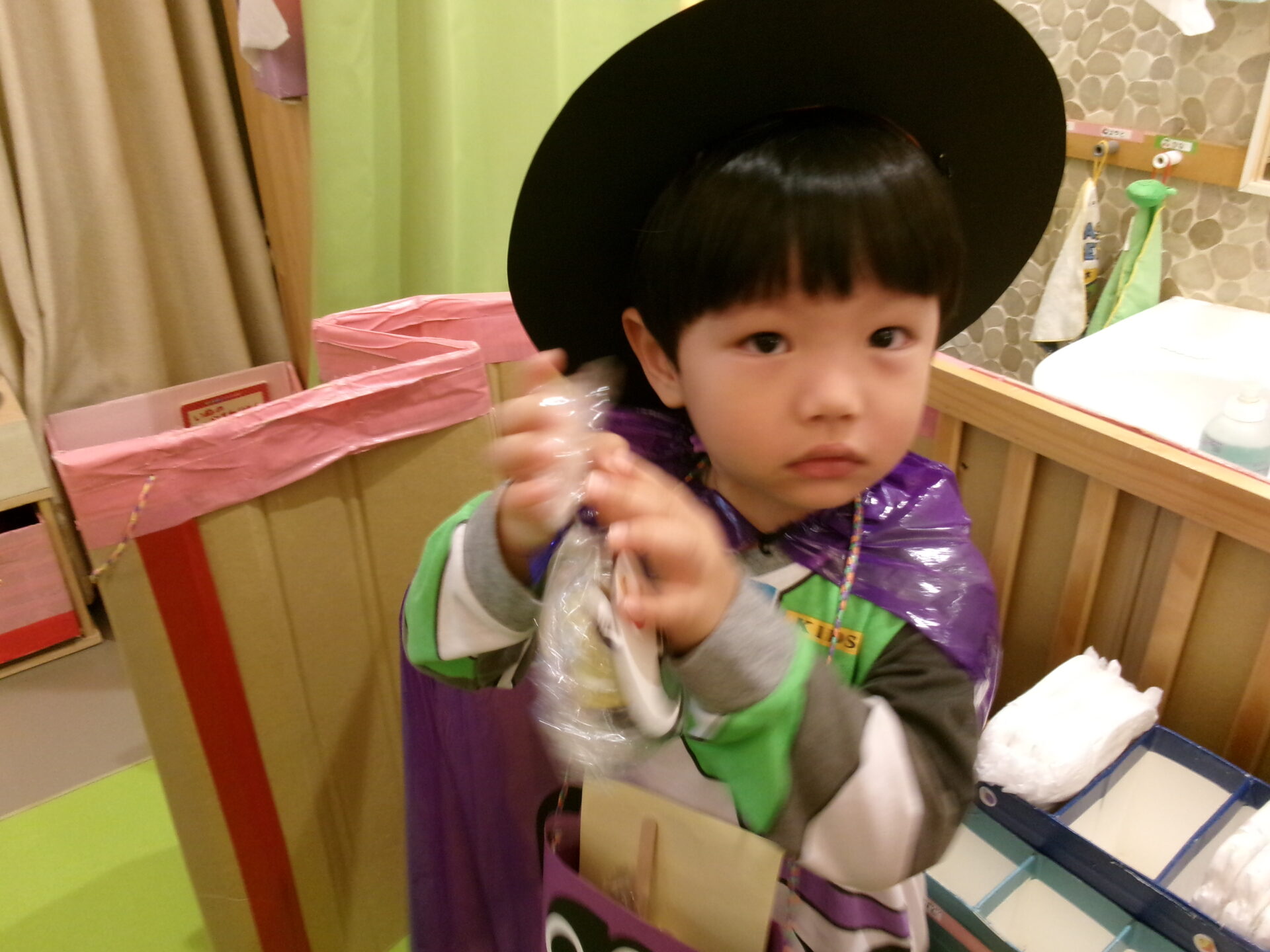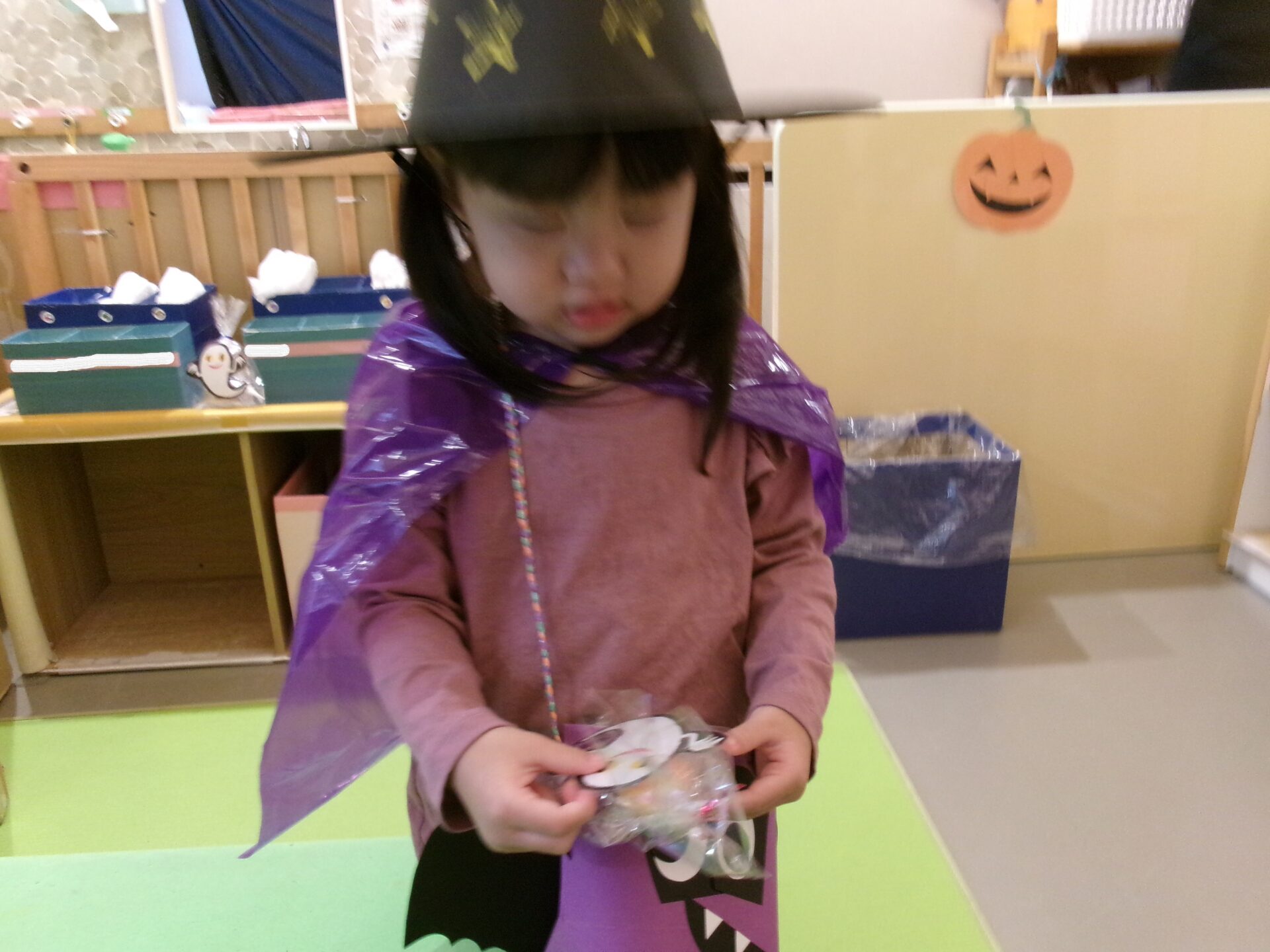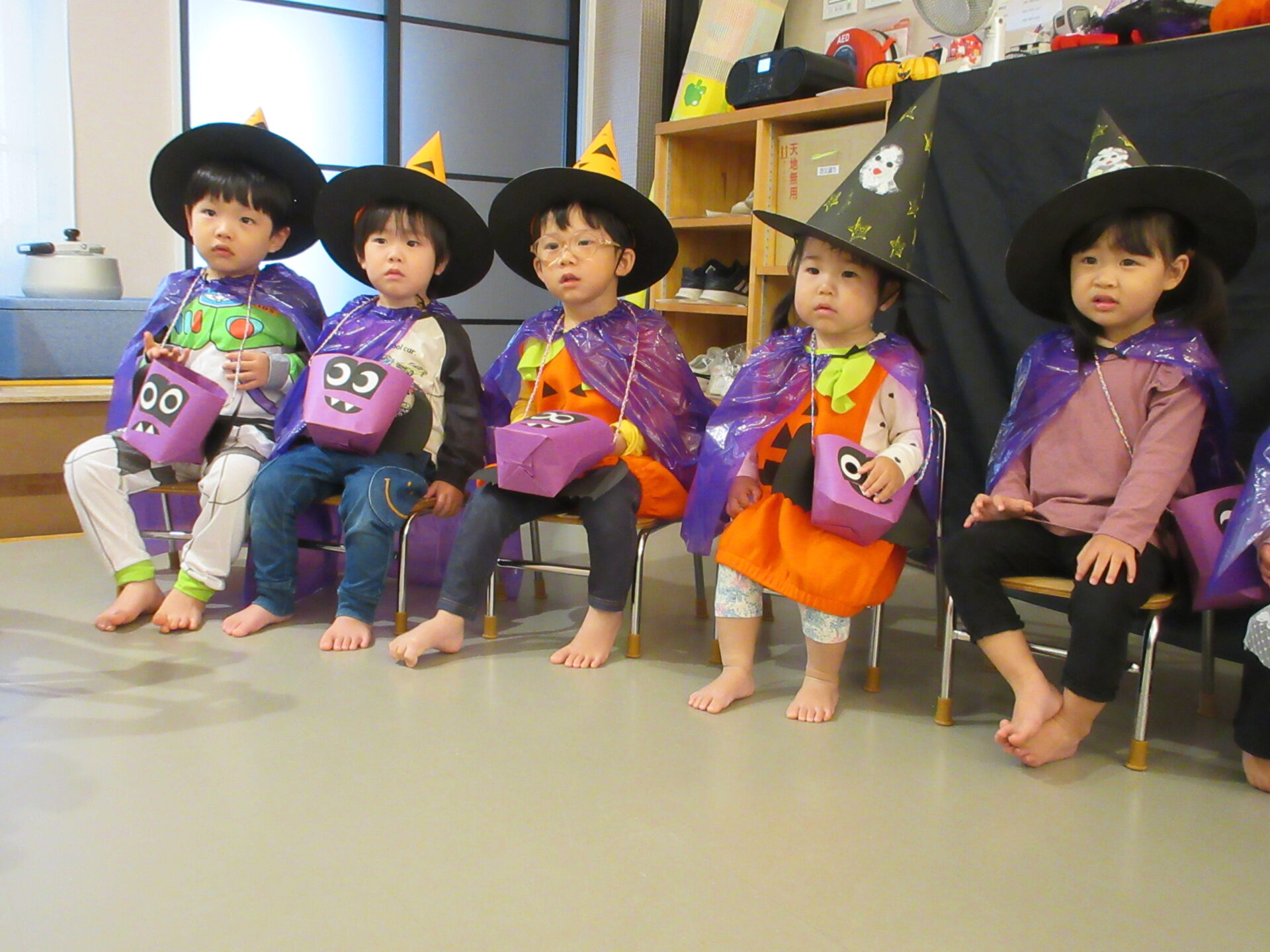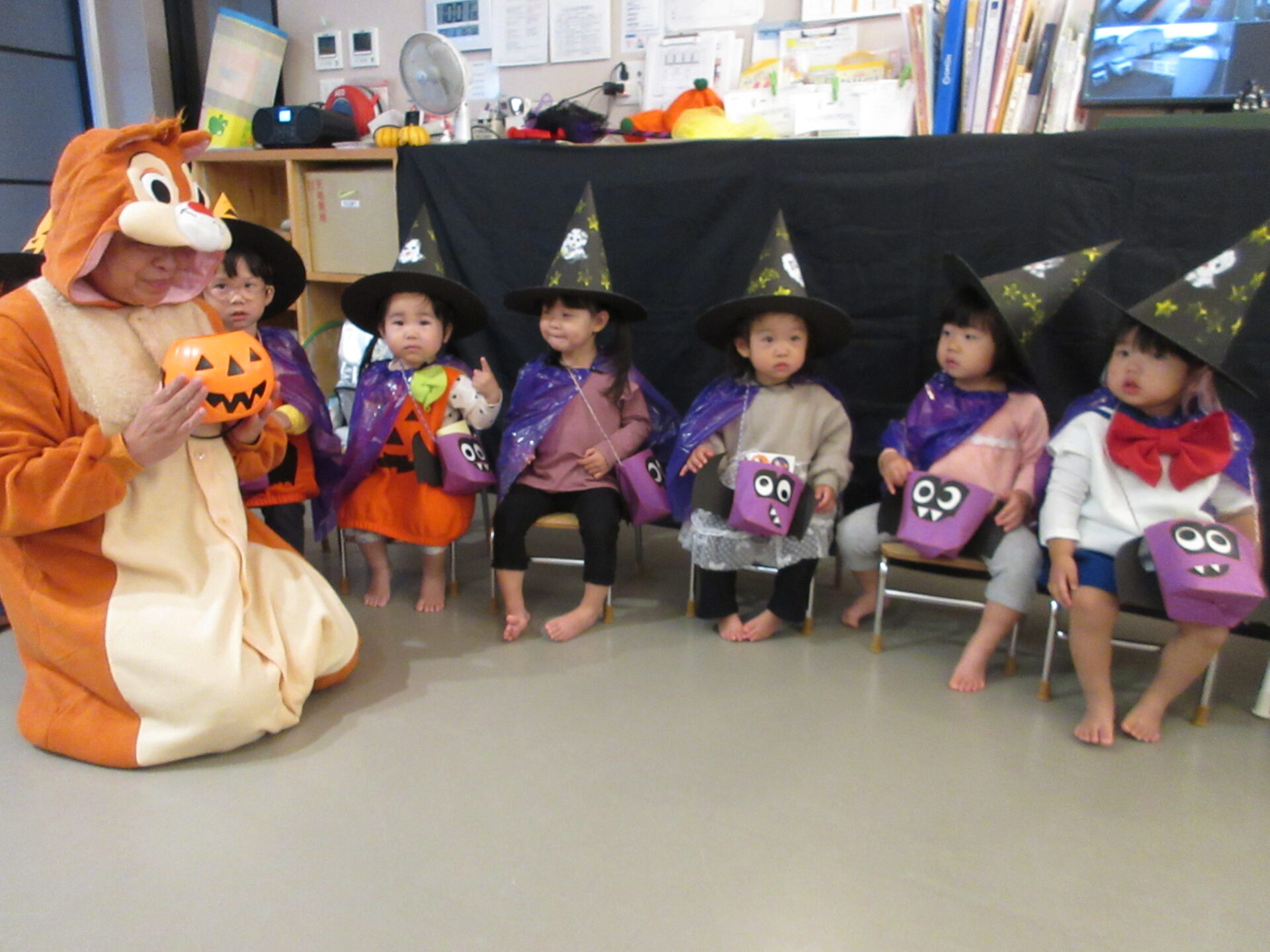 まんぼう組(2歳児)は、お菓子をもらう前に魔女からの質問に答えます。怖がって答えられない子もいましたが、ちゃんと質問に答えることができていました。