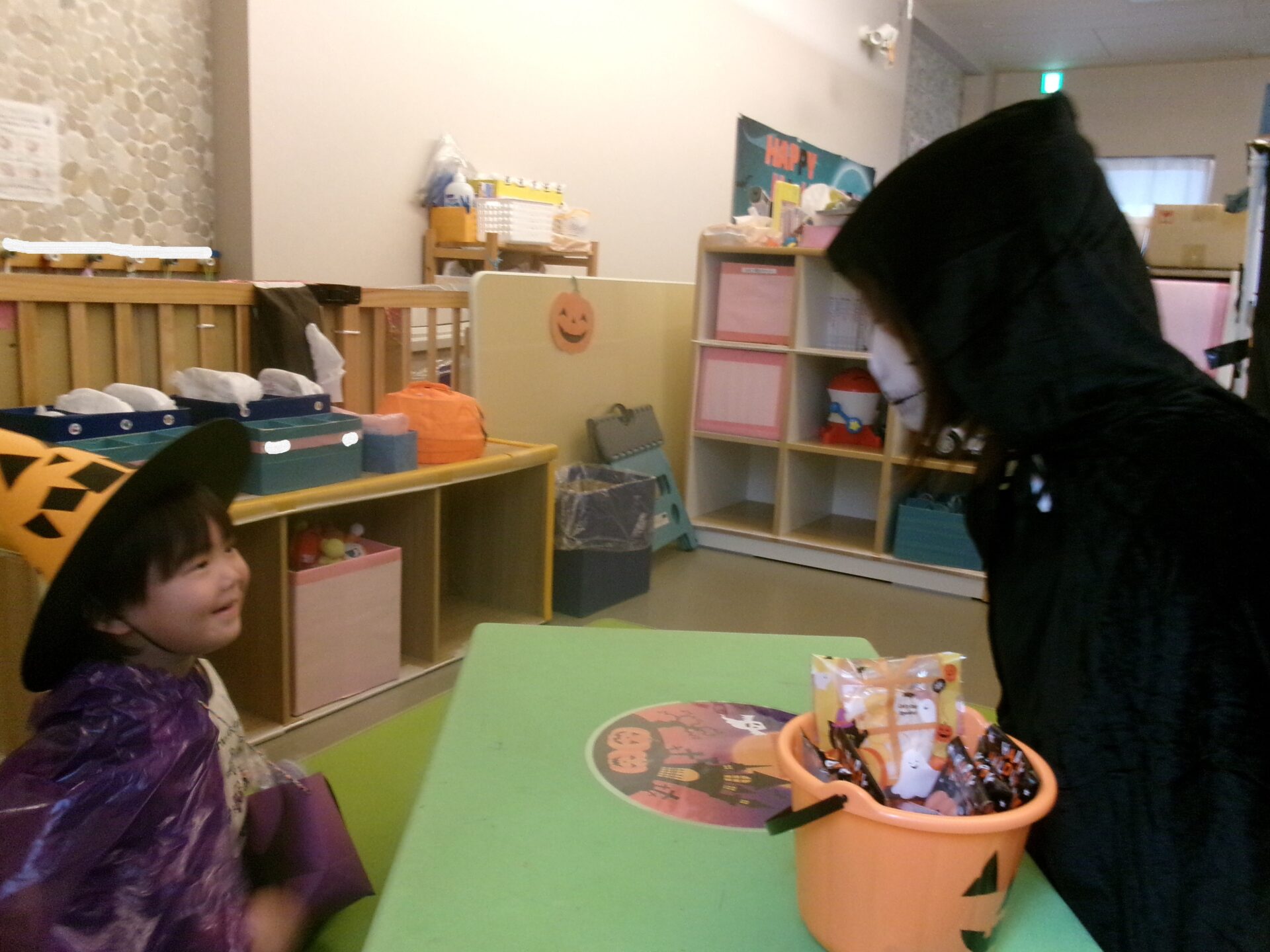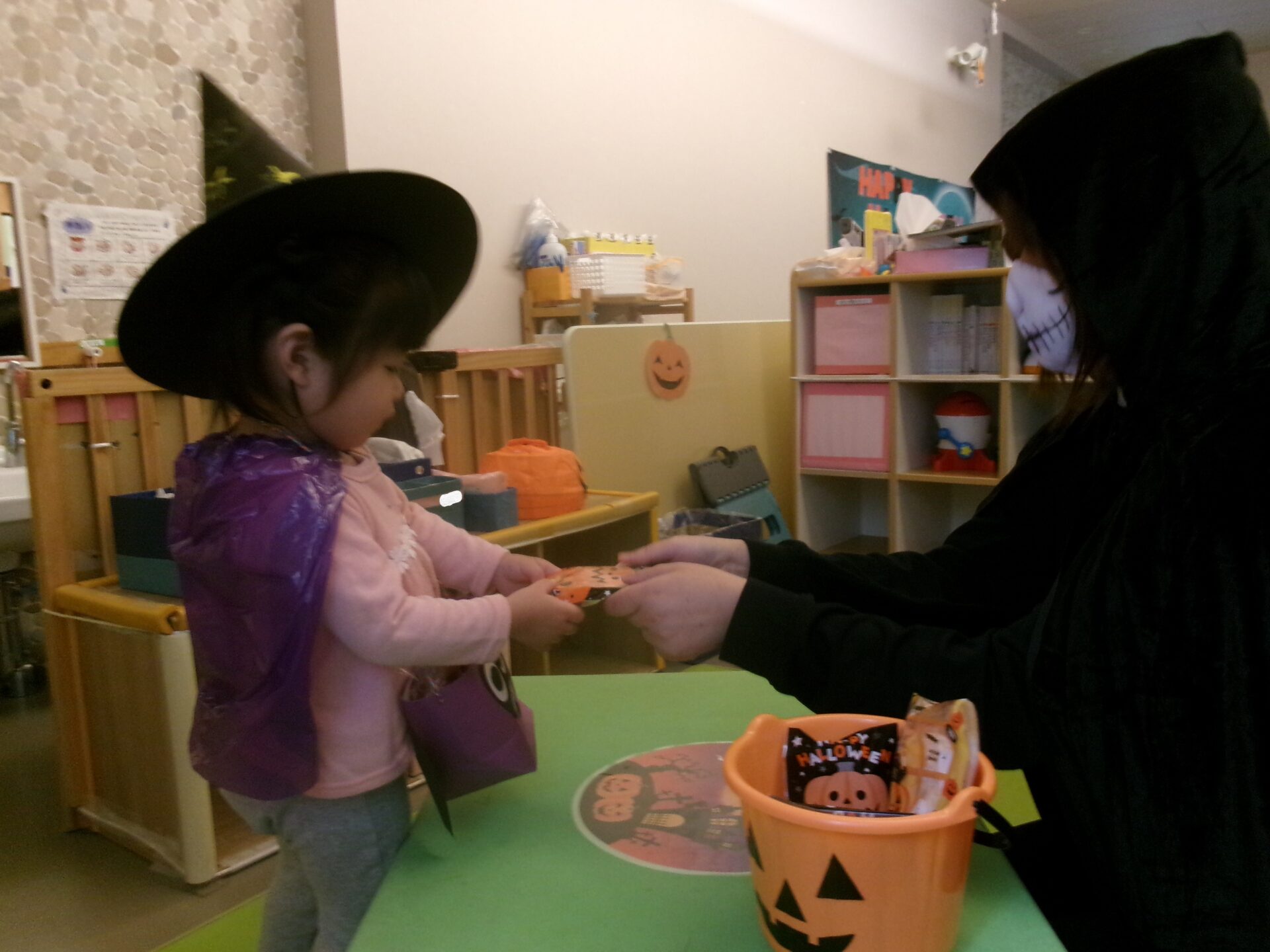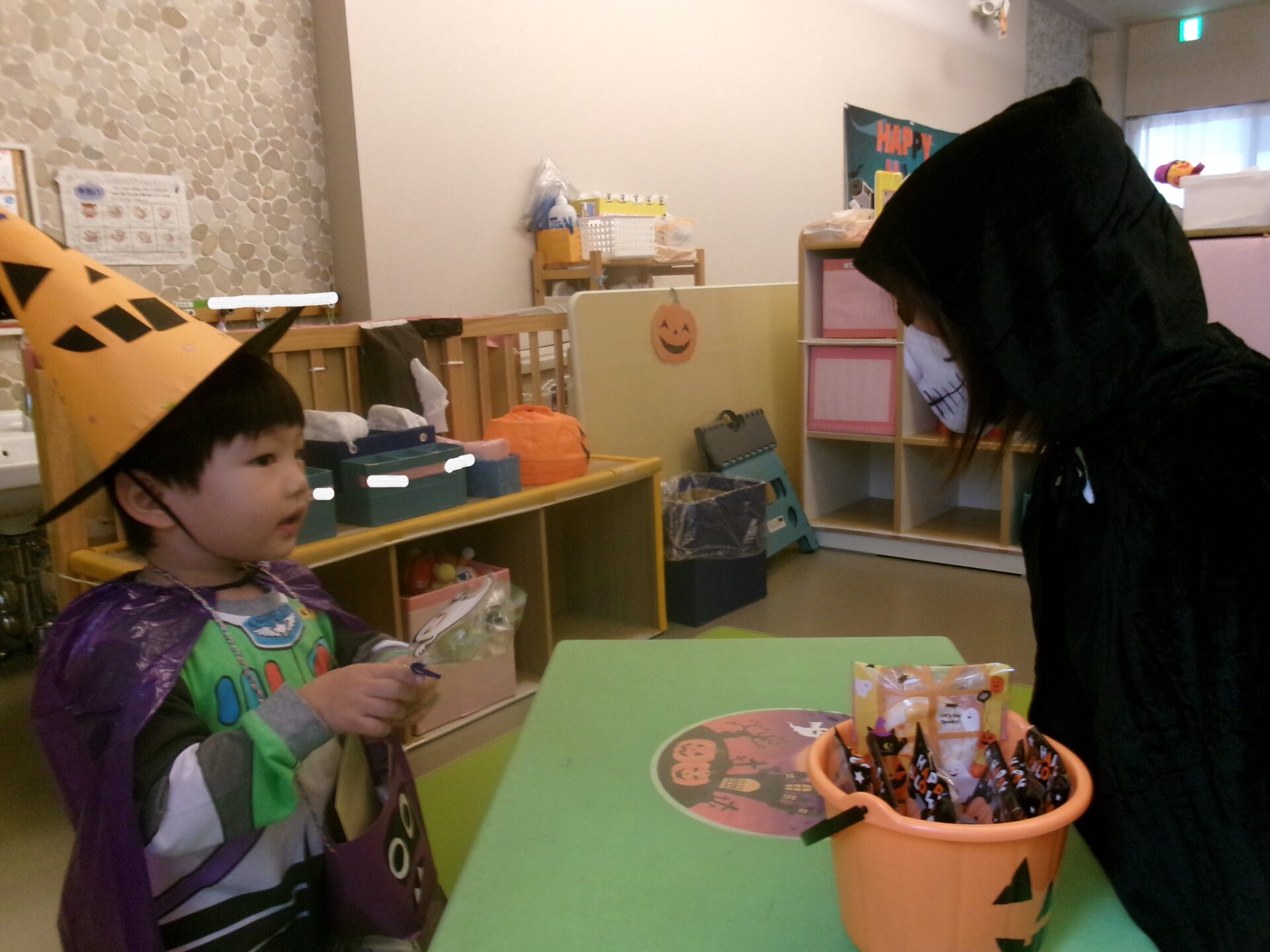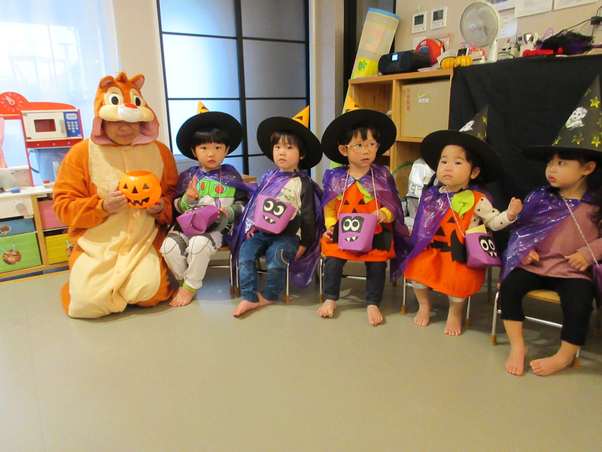 うみ組(0歳児)さんは、着ぐるみにビックリして泣く子もいましたが、そら組(1歳児)、まんぼう組(2歳児)は、「トリック オア トリート」と言ってお菓子をもらっていました。