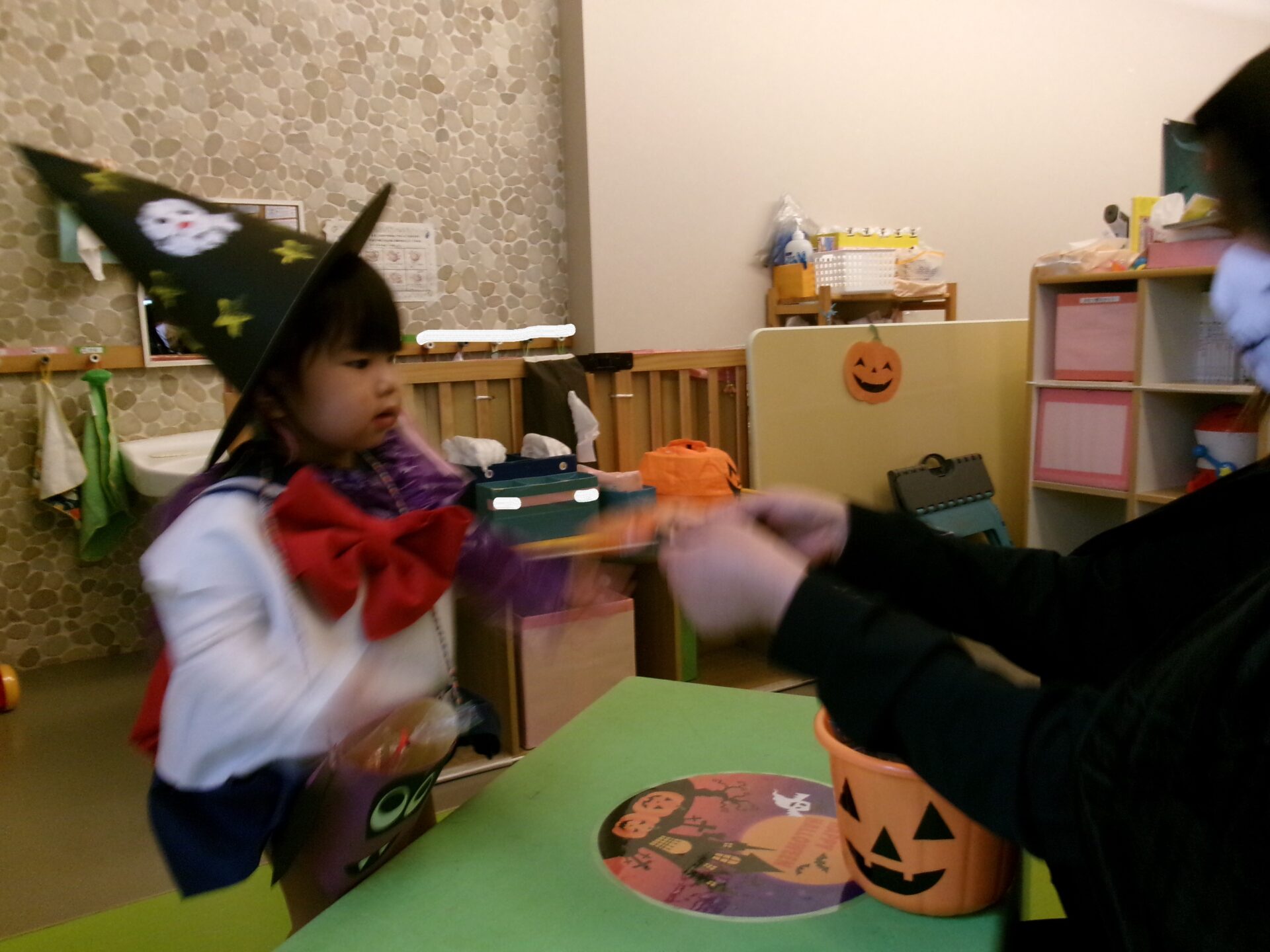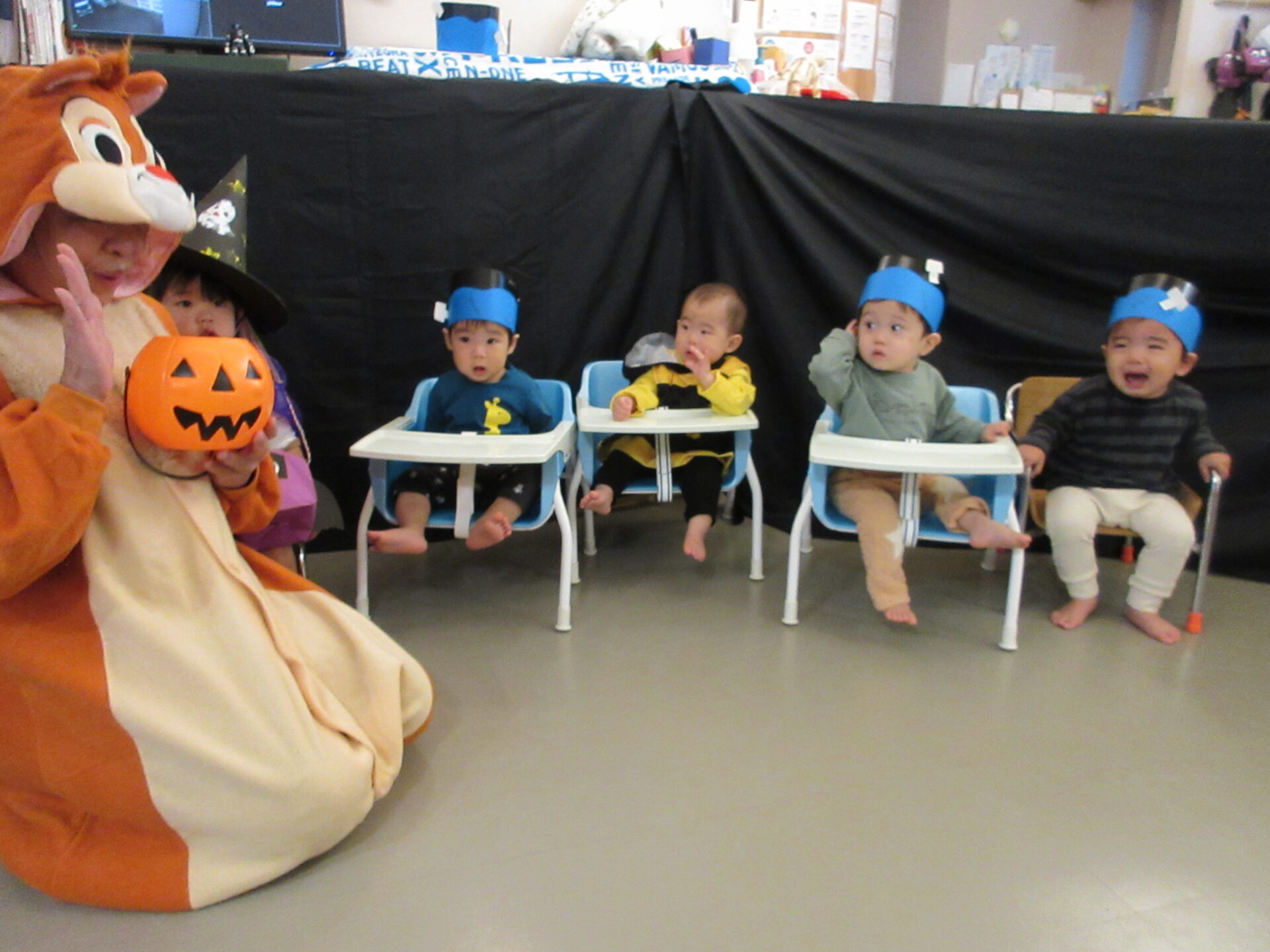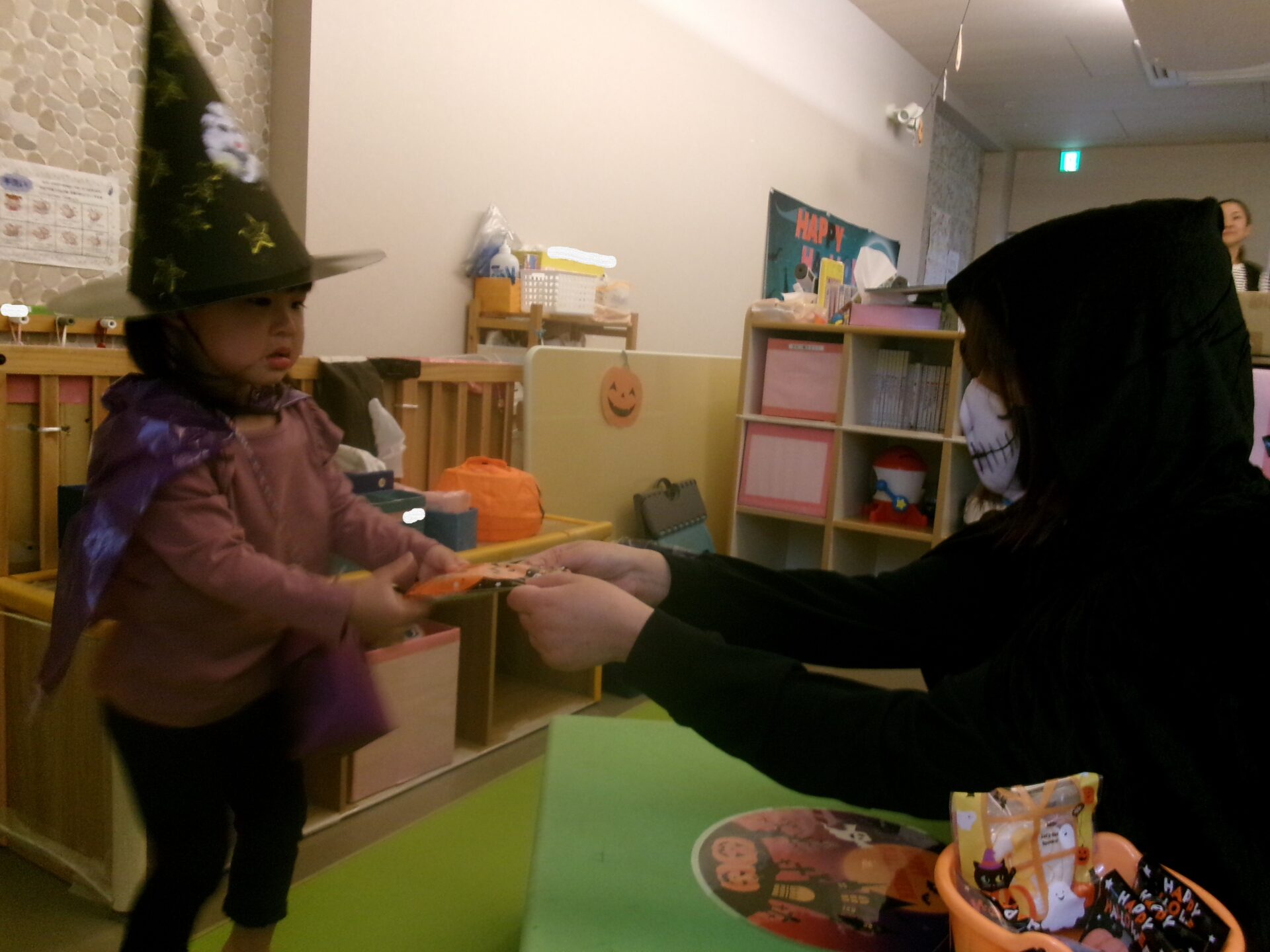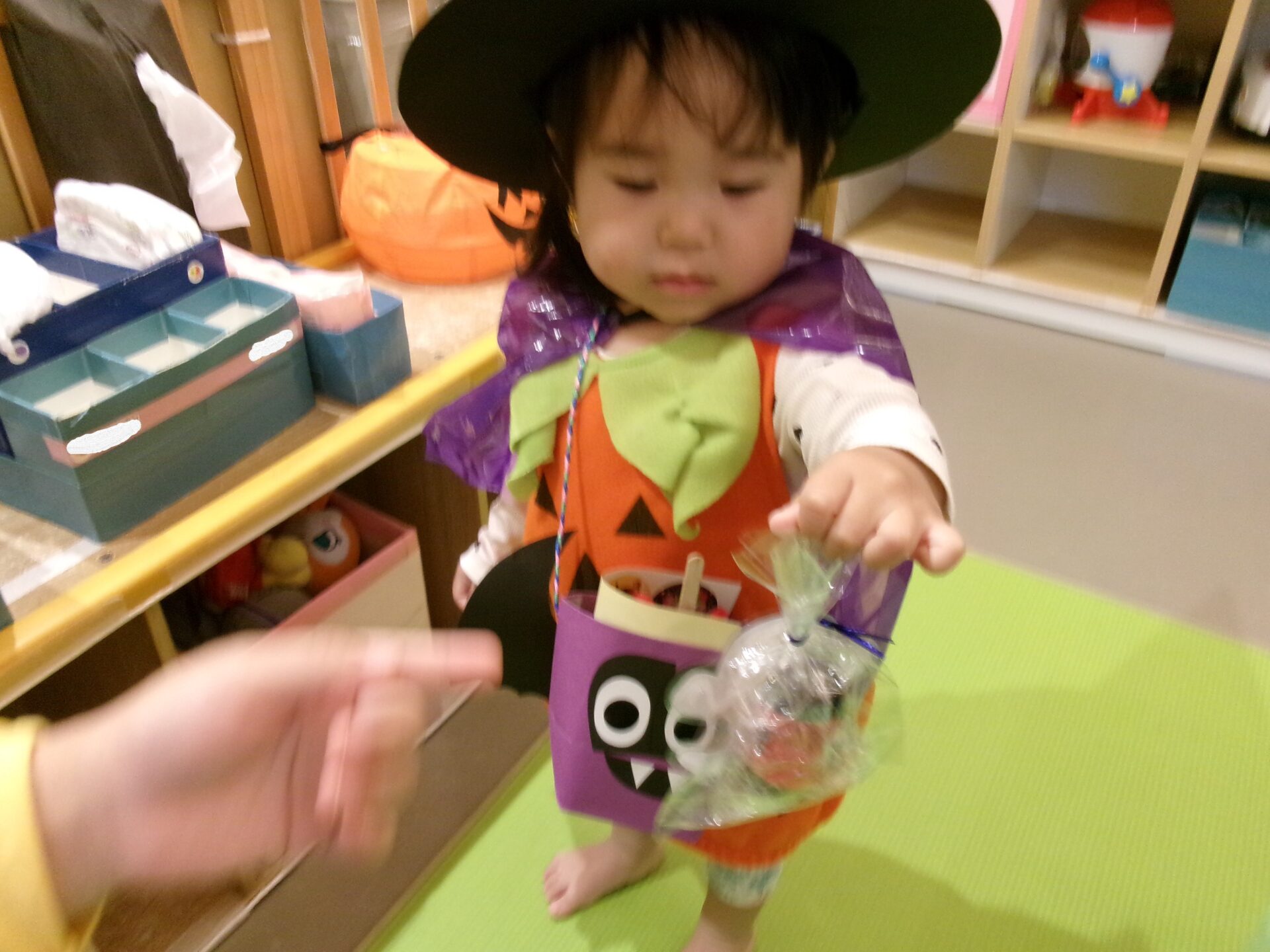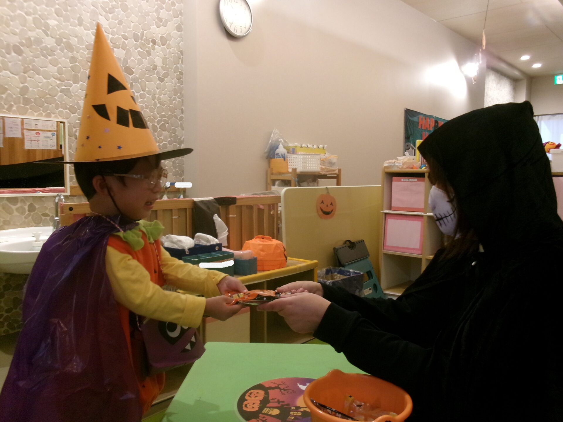 うみ組(0歳児)さんは、着ぐるみにビックリして泣く子もいましたが、そら組(1歳児)、まんぼう組(2歳児)は、「トリック オア トリート」と言ってお菓子をもらっていました。
