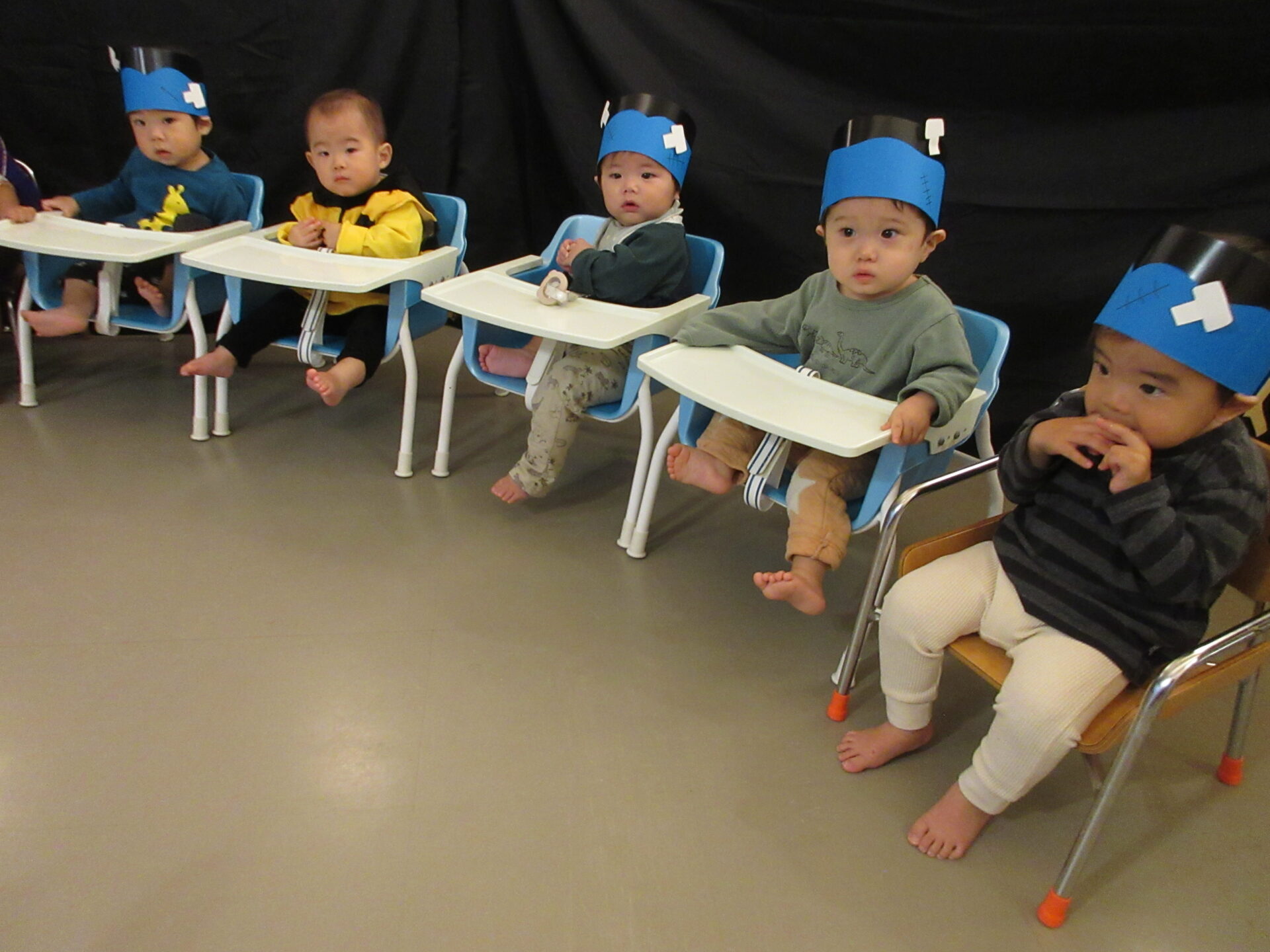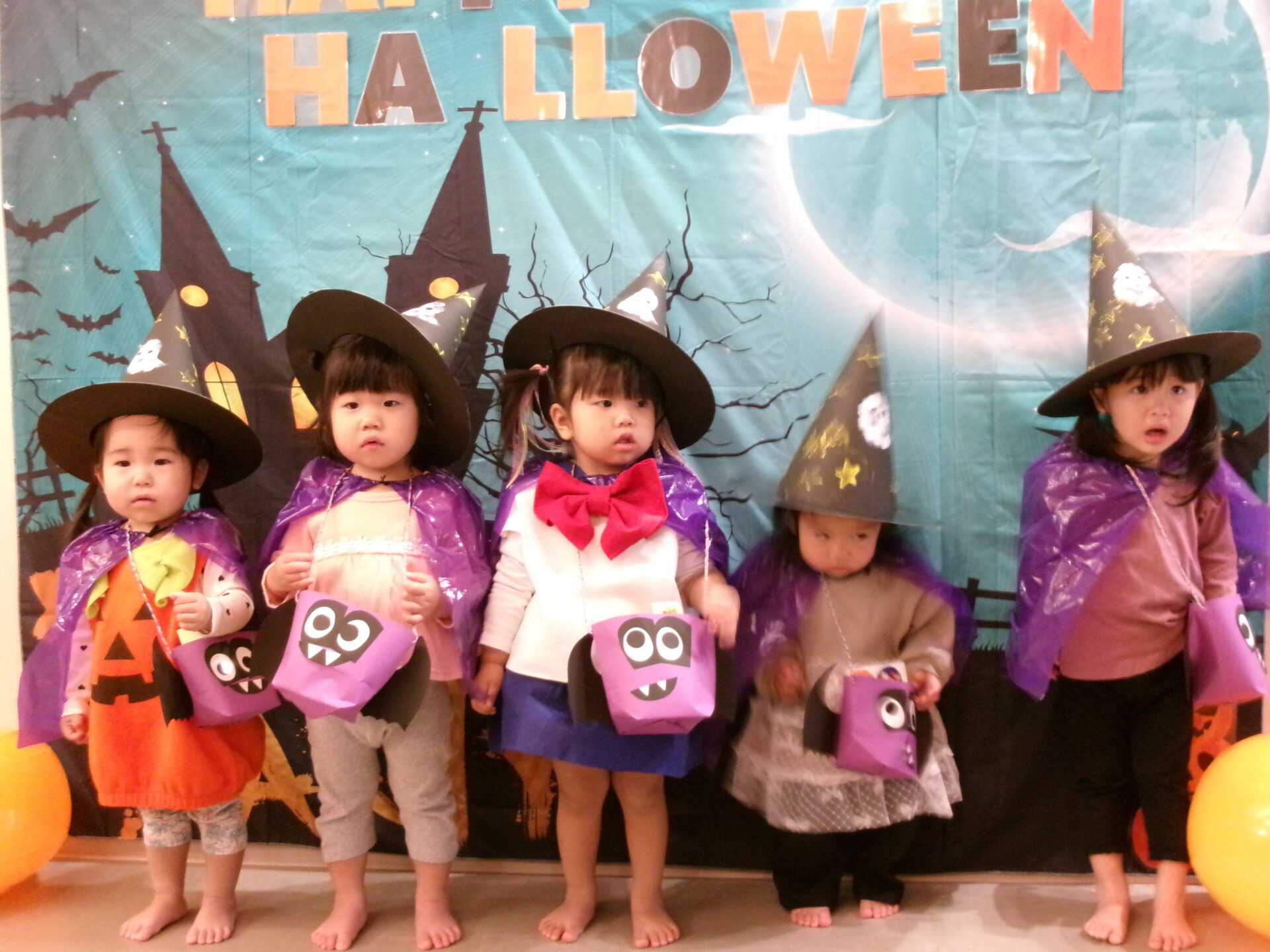 まんぼう小規模保育園のお友だちも、自分たちで作った帽子などを被り、魔女やフランケンシュタインに変身して参加しましたよ。
