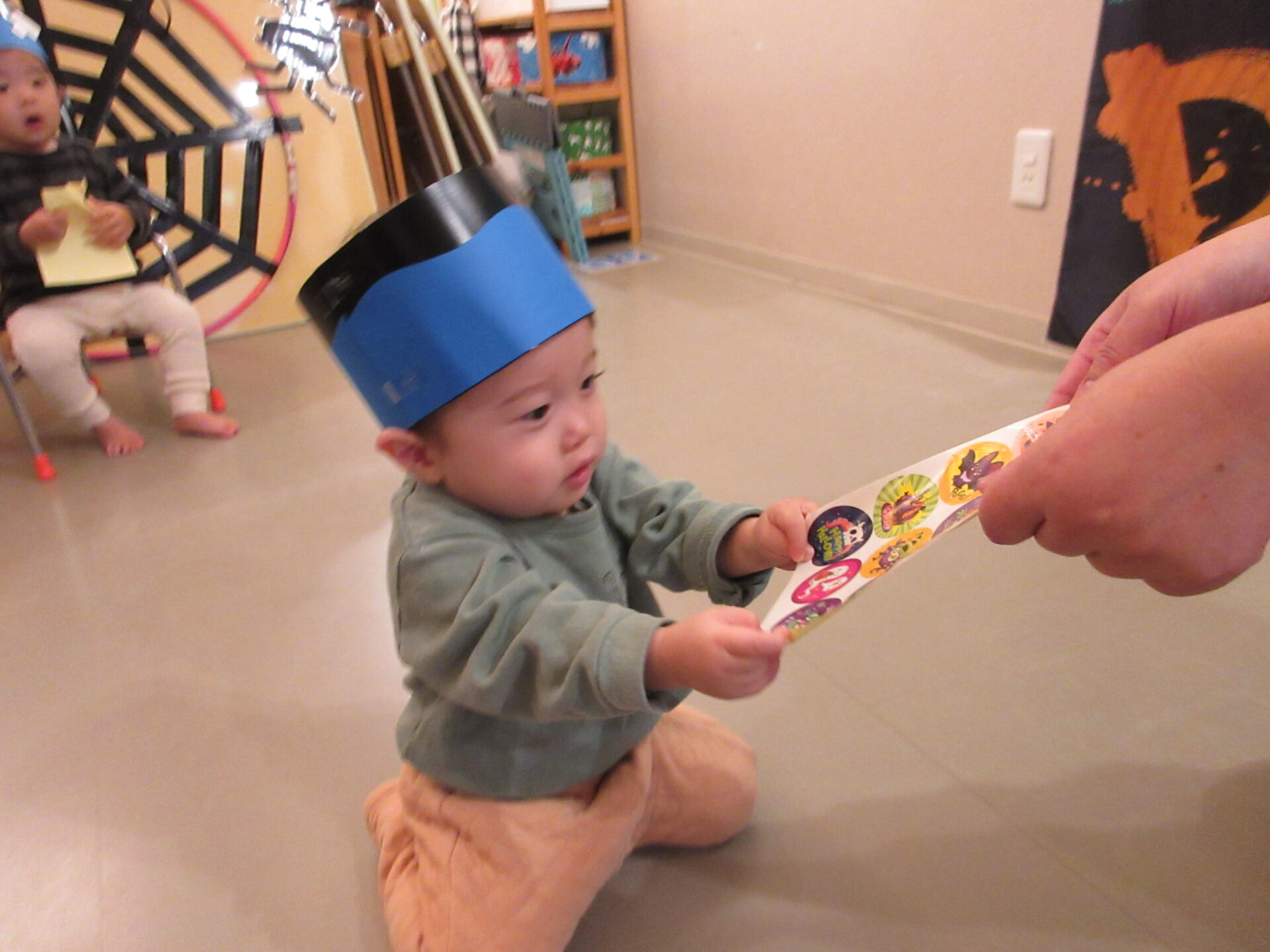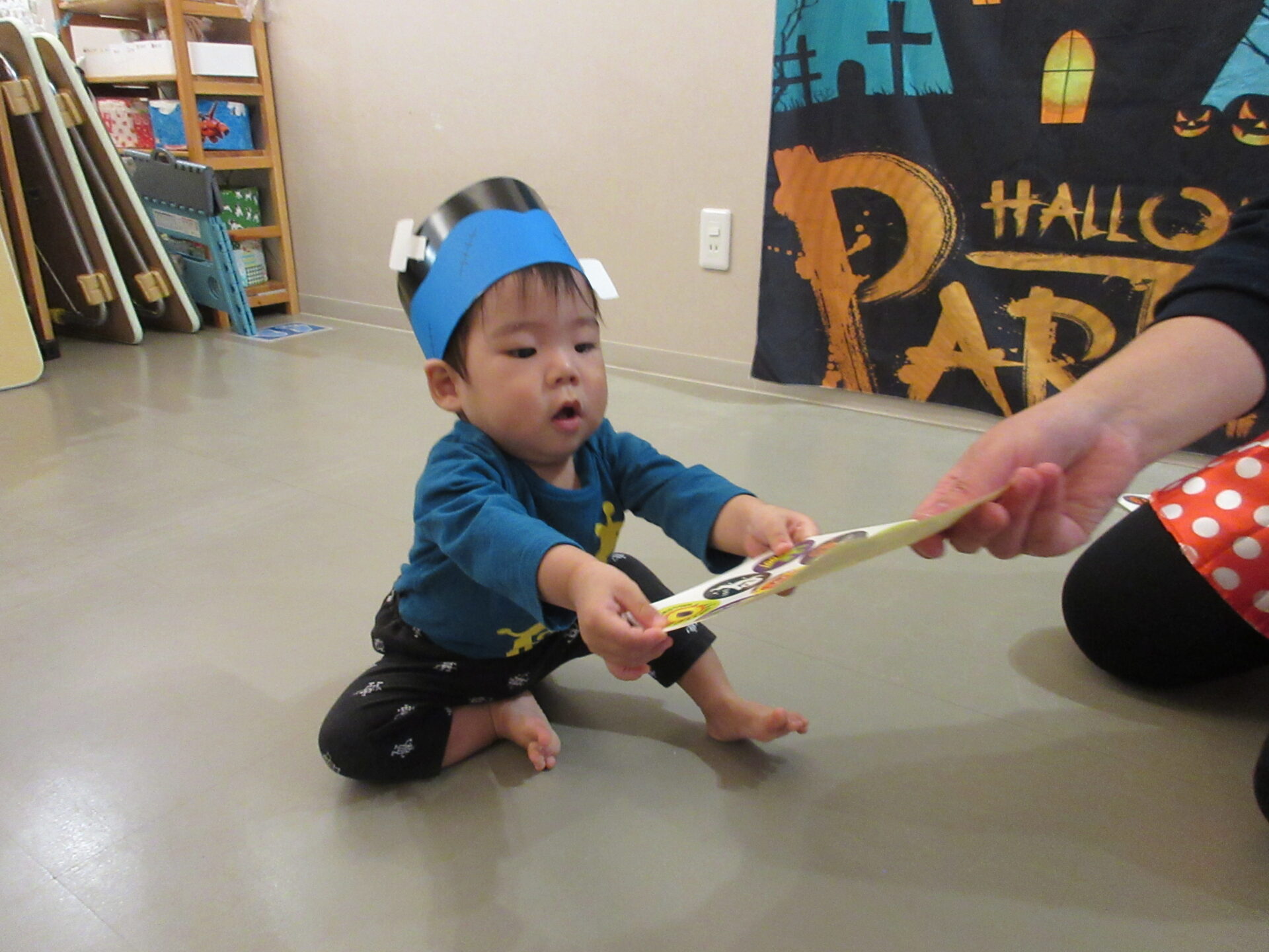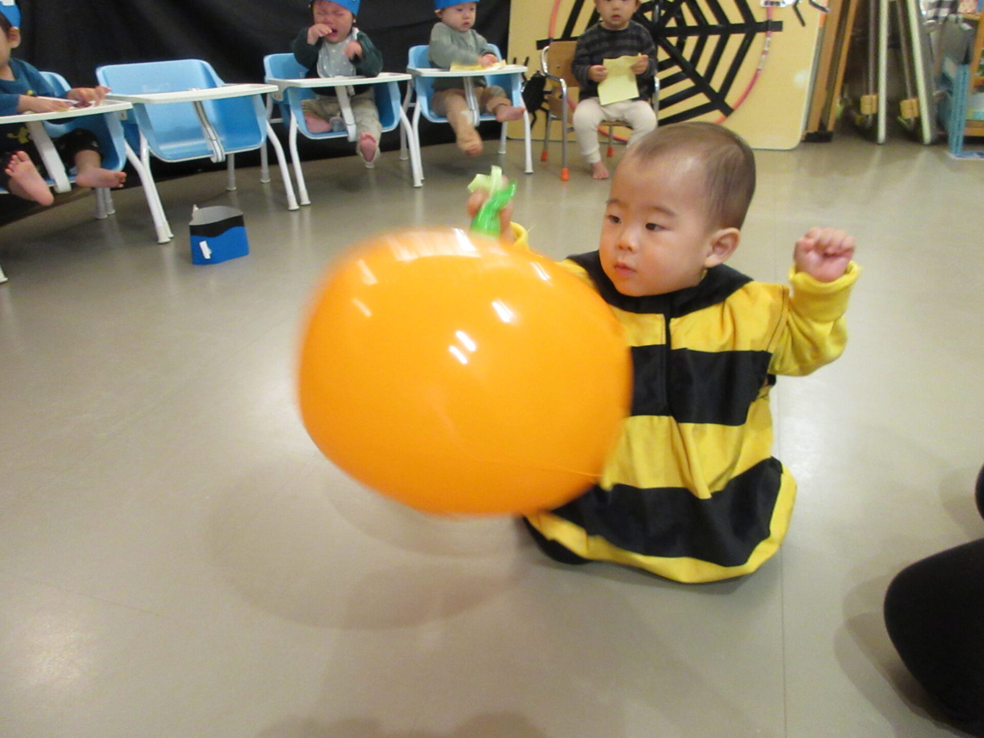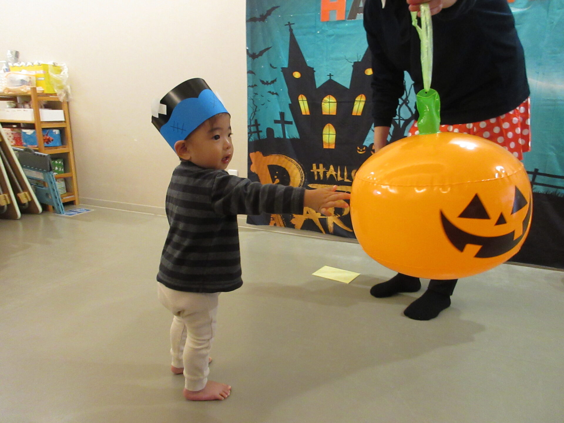 うみ組(0歳児)さんは、かぼちゃおばけにタッチをしに行きました。