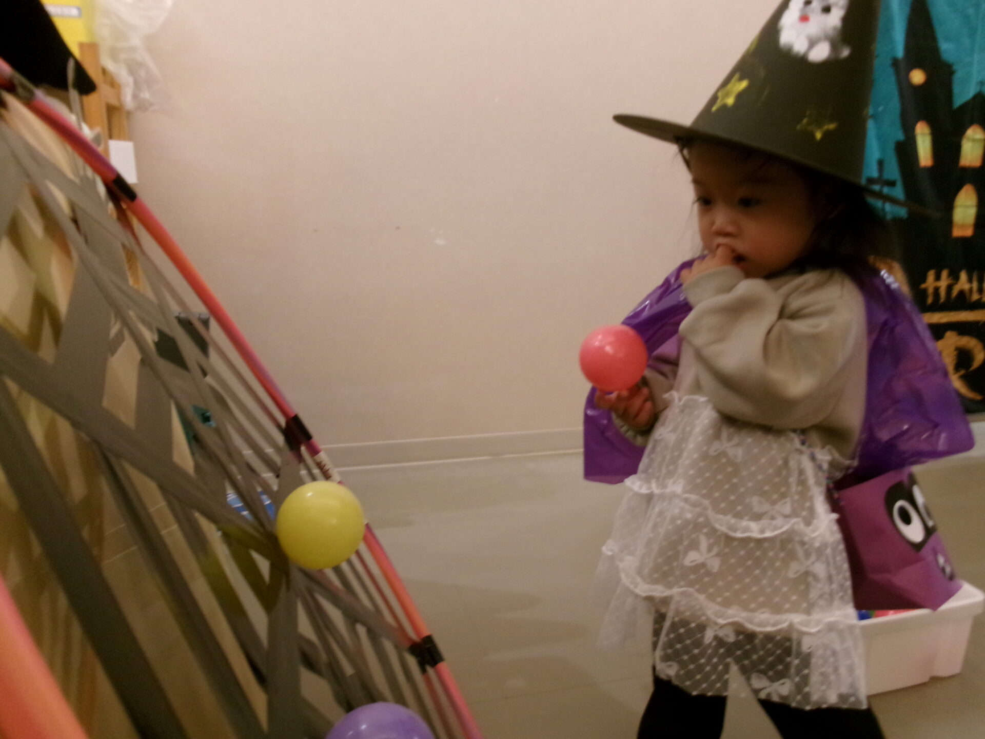 そら組(1歳児)、まんぼう組(2歳児)さんは、蜘蛛の巣めがけてボール投げをしました。上手に投げて、蜘蛛の巣にボールがくっつく子もいれば、自分でくっつけに行く子もいました。