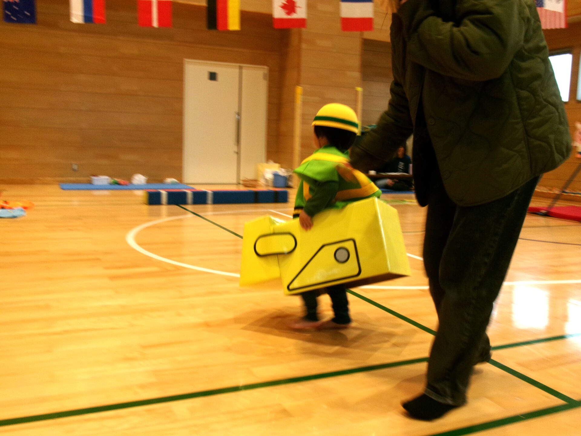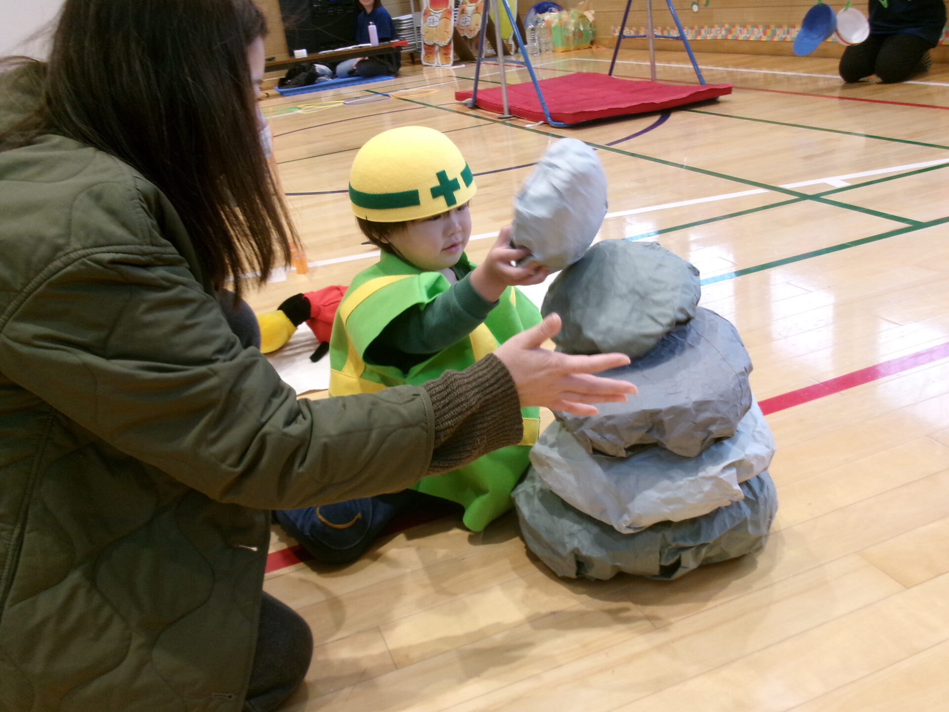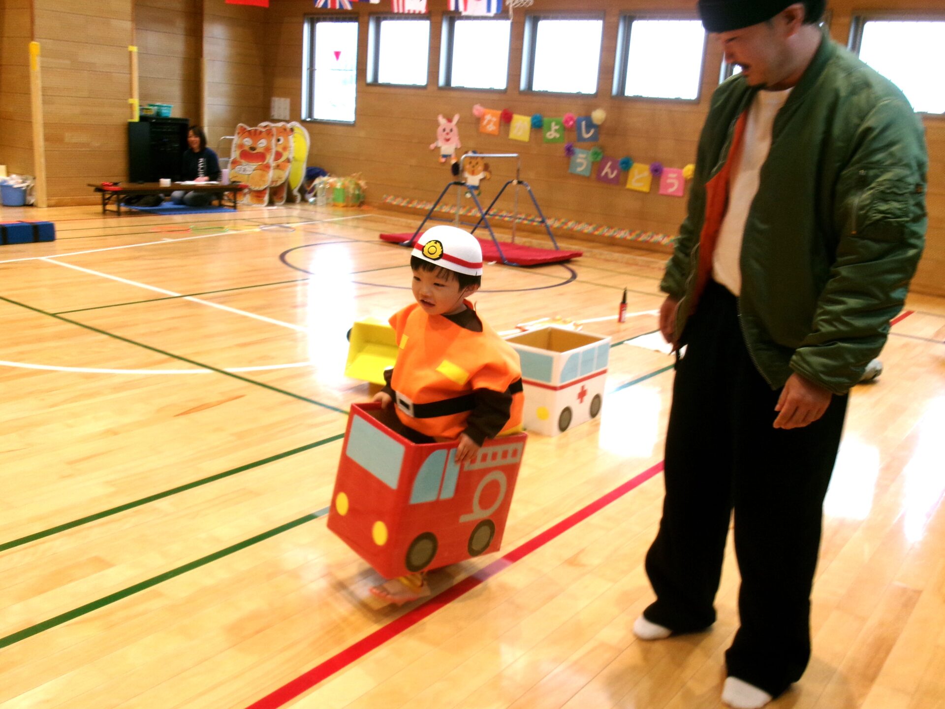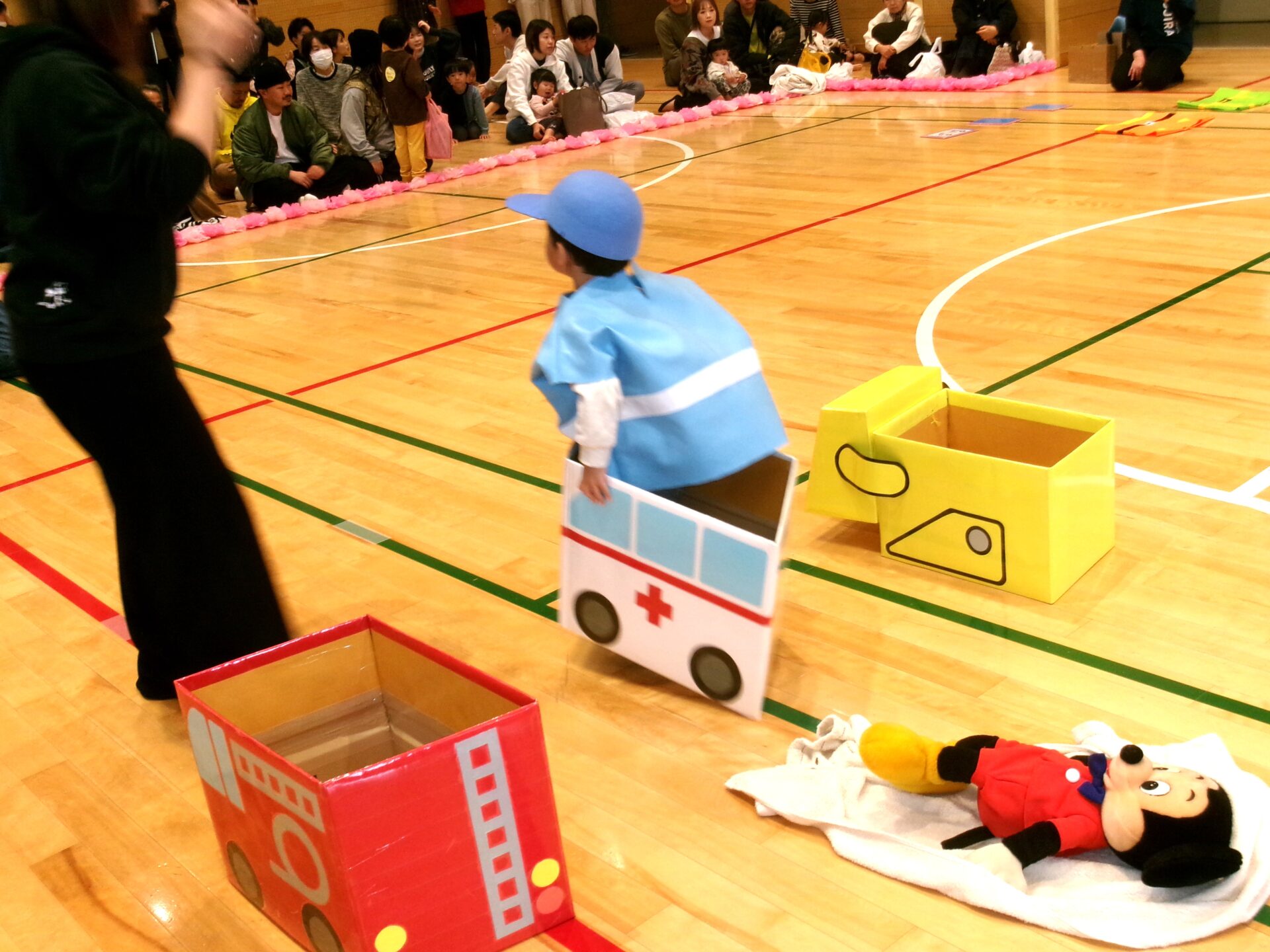 まんぼう組さんは、「はたらくくるま」の衣装に着替え、平均台、フープ飛び、鉄棒などの筋トレをし、それぞれの仕事(火を消したり、人を運んだり、岩を積んだり・・・)をしてから車に乗って出動です。