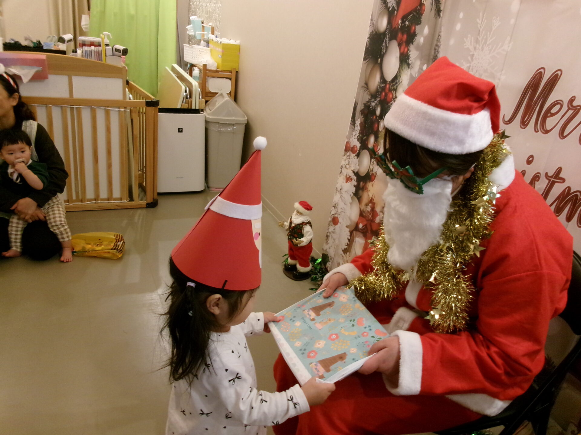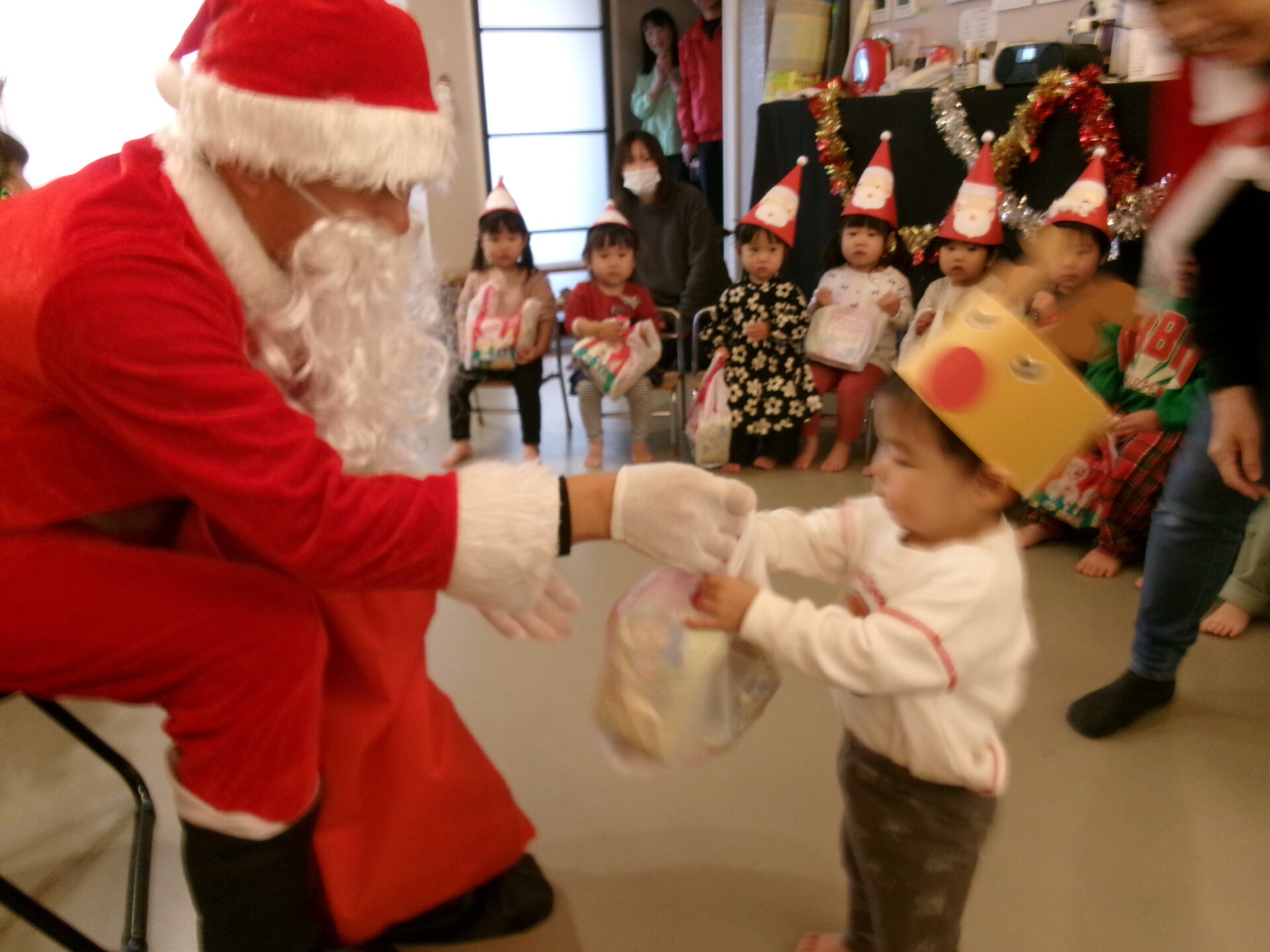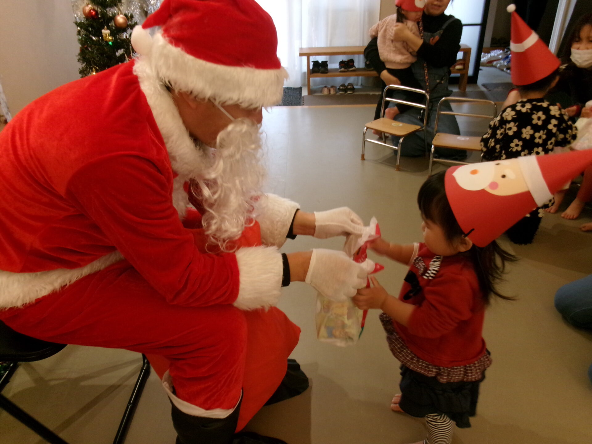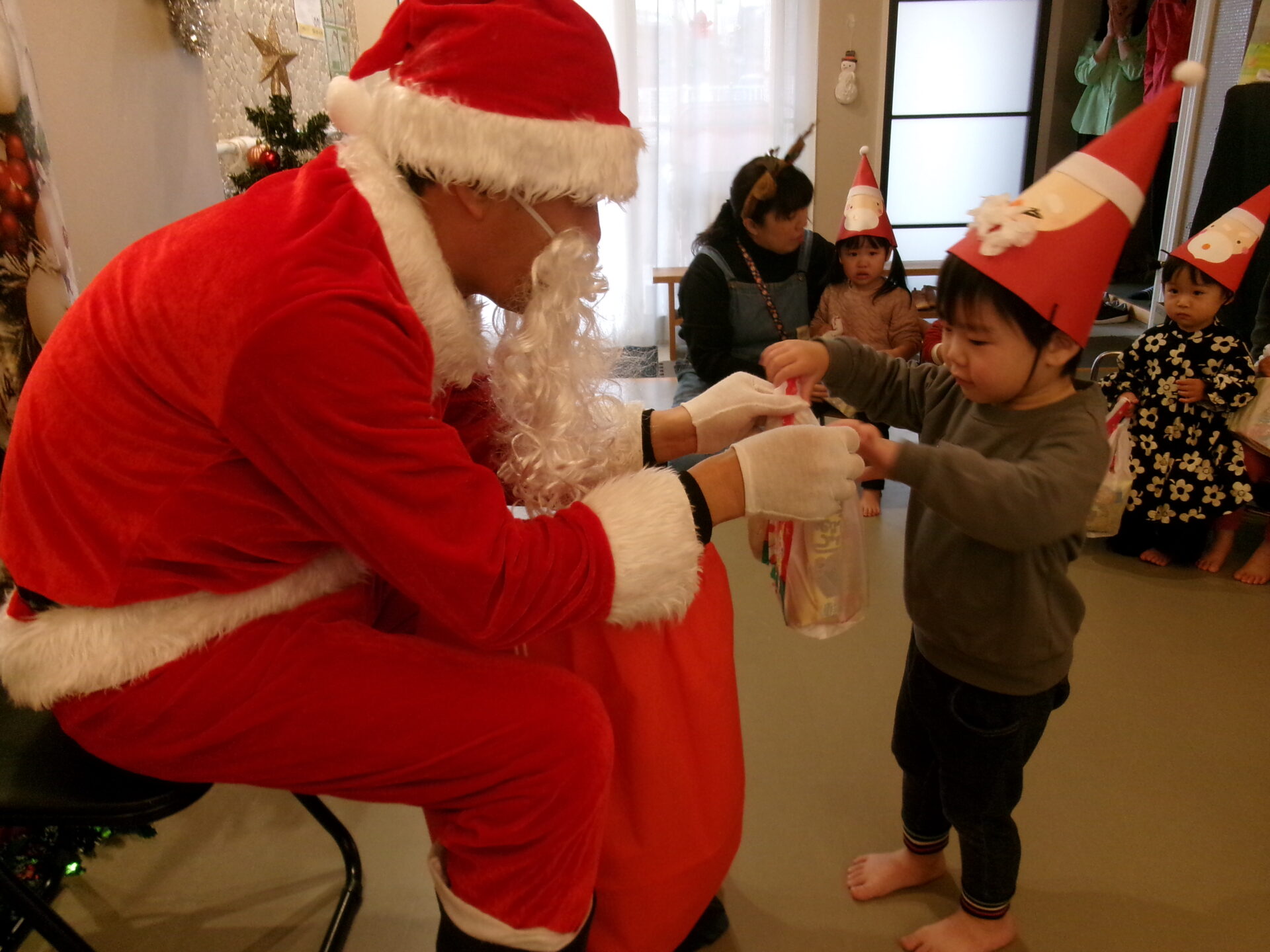 突然のサンタさん登場で、驚いて泣いてしまった子どももいましたが、赤い袋の中を見せてくれることになり、サンタさんの近くまで行くこともできました。