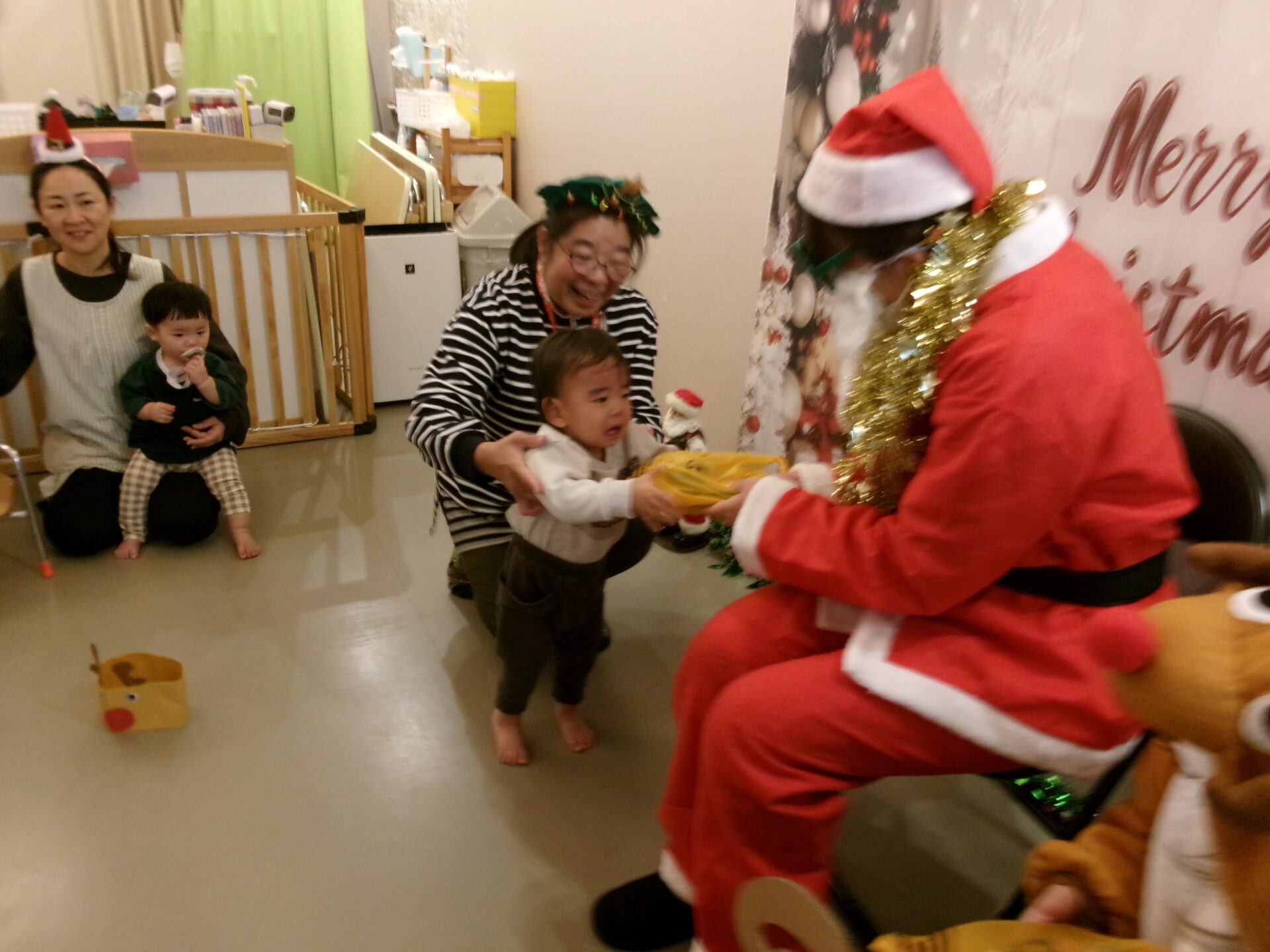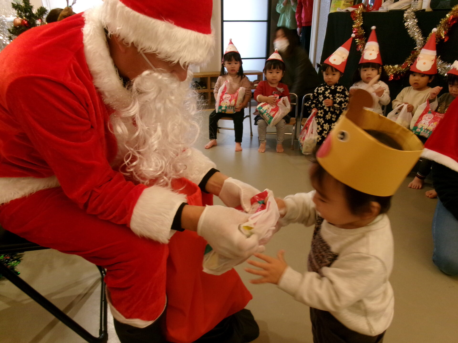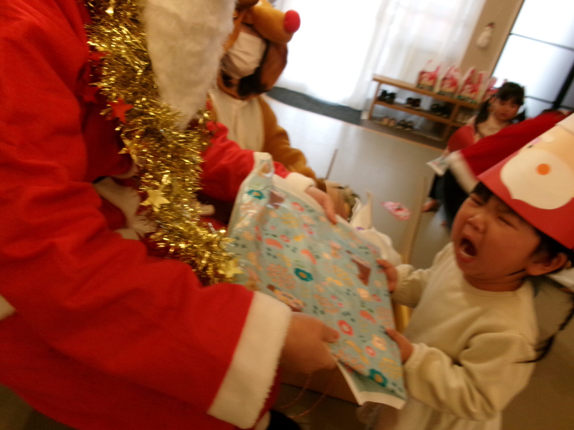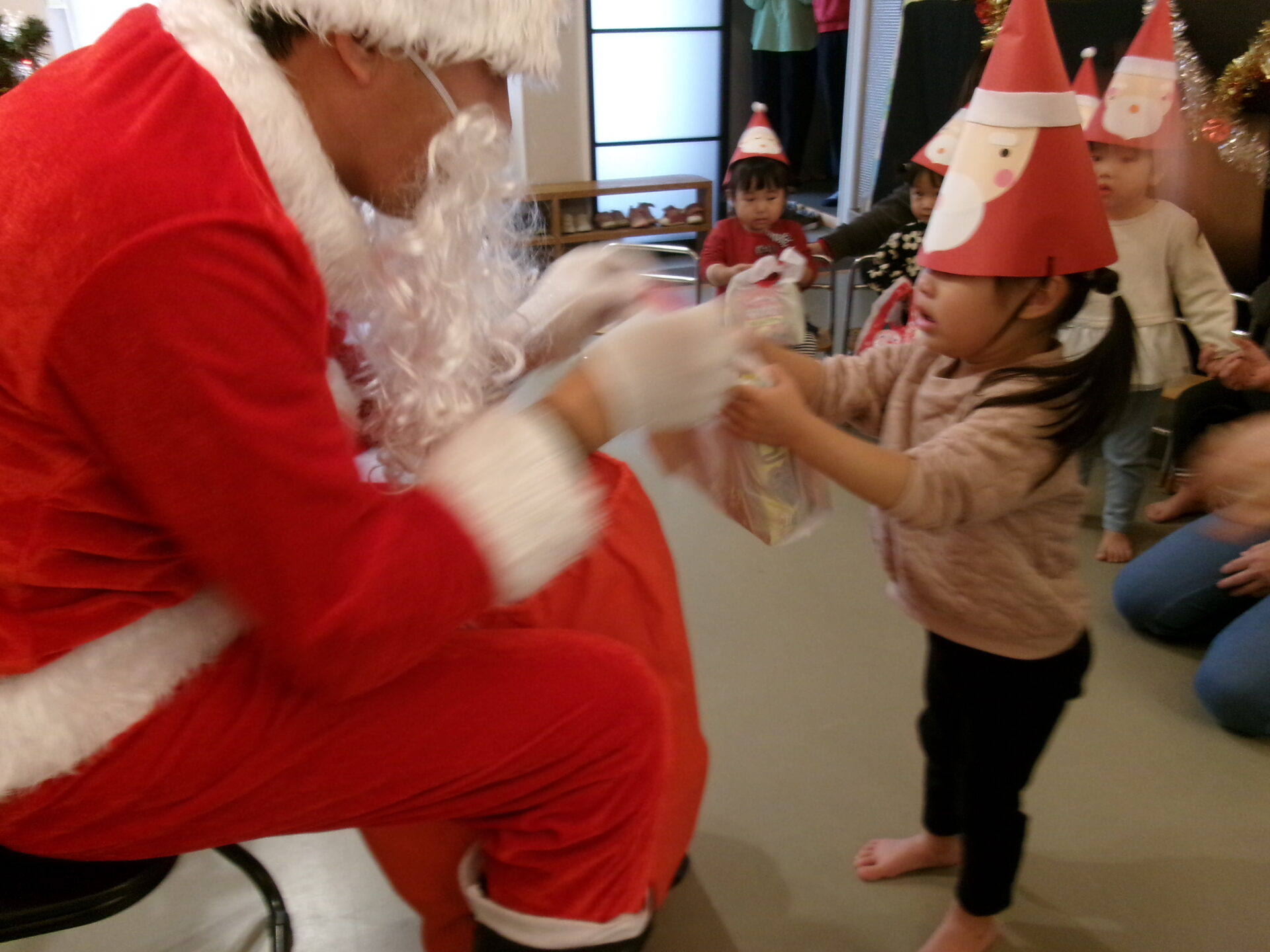 突然のサンタさん登場で、驚いて泣いてしまった子どももいましたが、赤い袋の中を見せてくれることになり、サンタさんの近くまで行くこともできました。