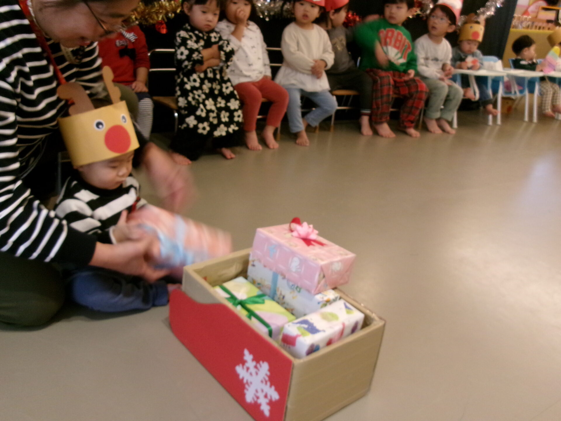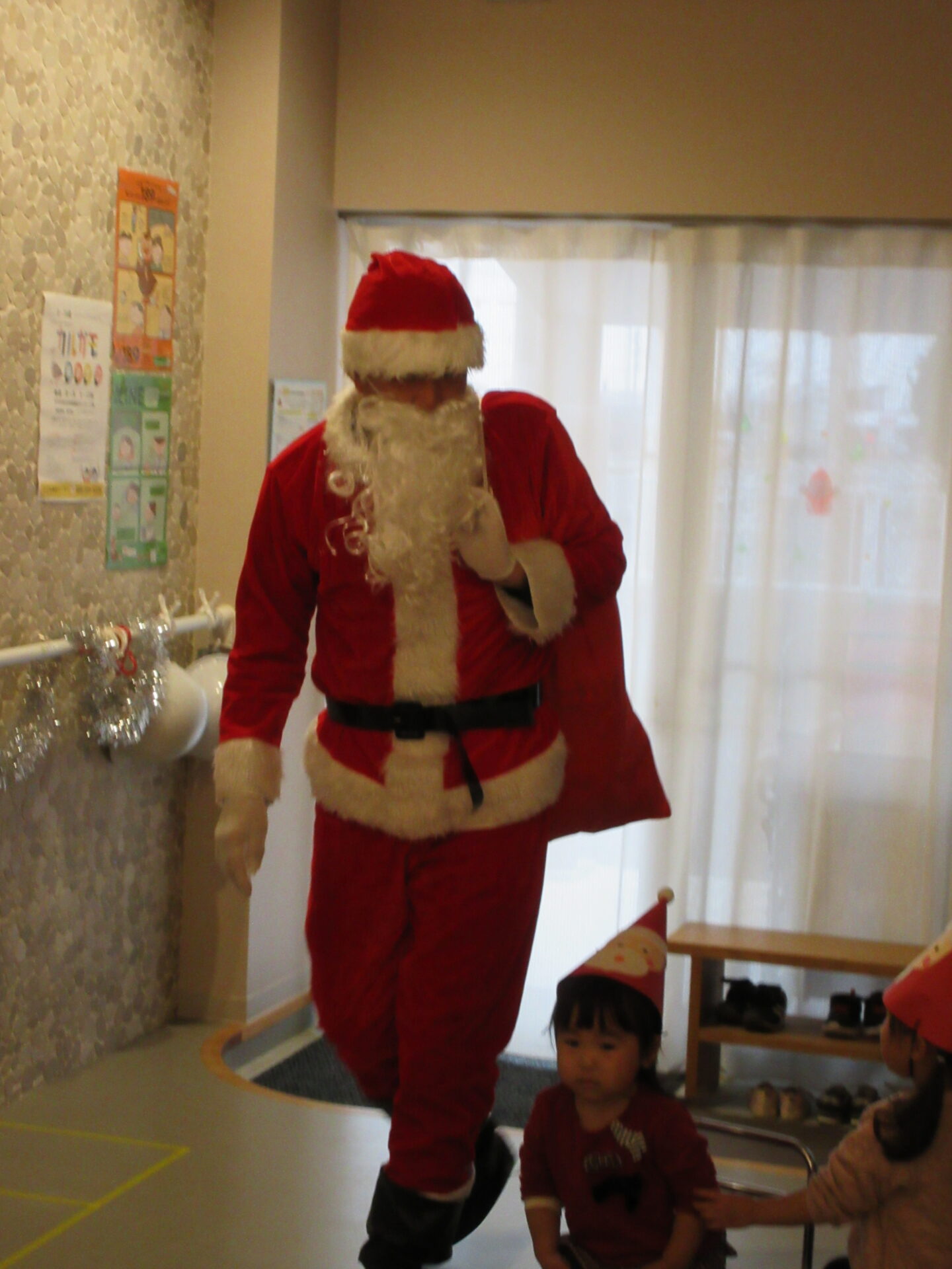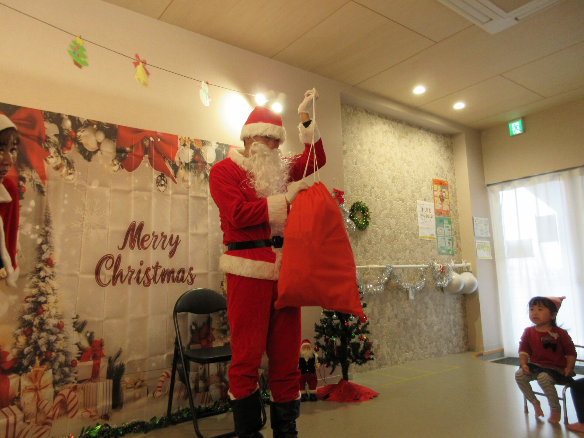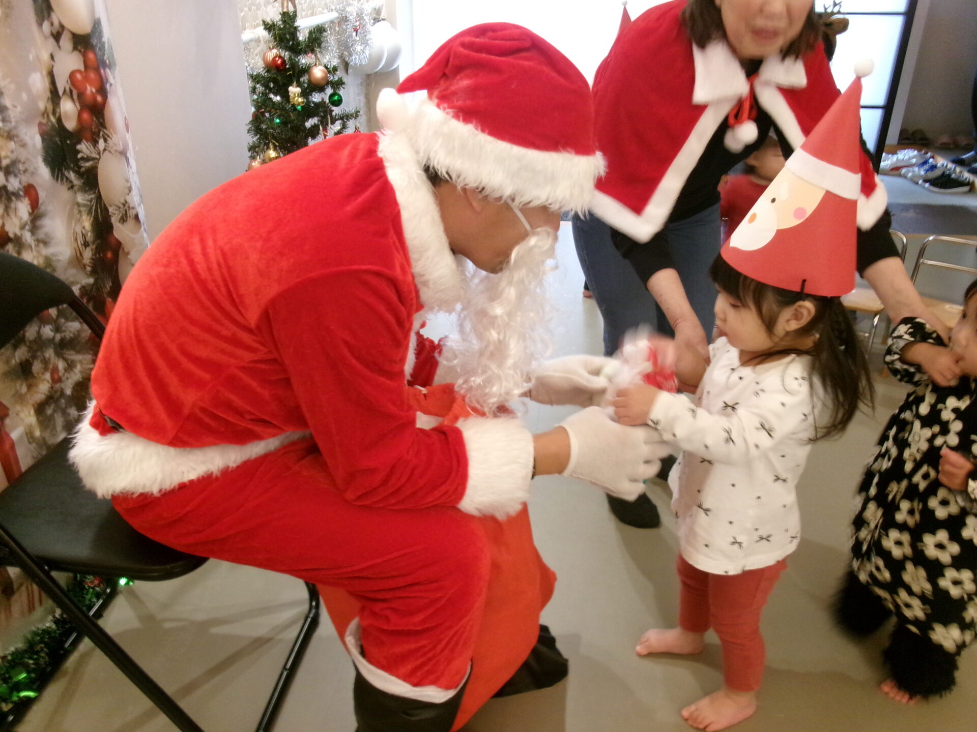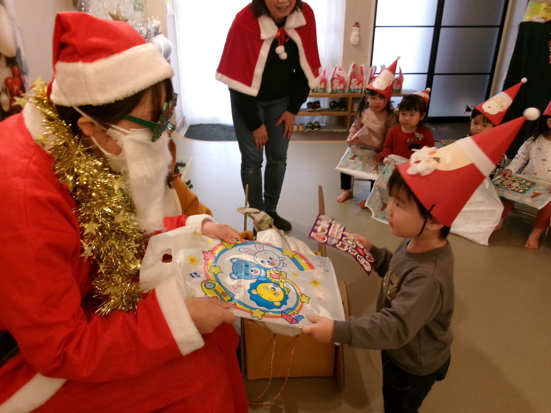 突然のサンタさん登場で、驚いて泣いてしまった子どももいましたが、赤い袋の中を見せてくれることになり、サンタさんの近くまで行くこともできました。