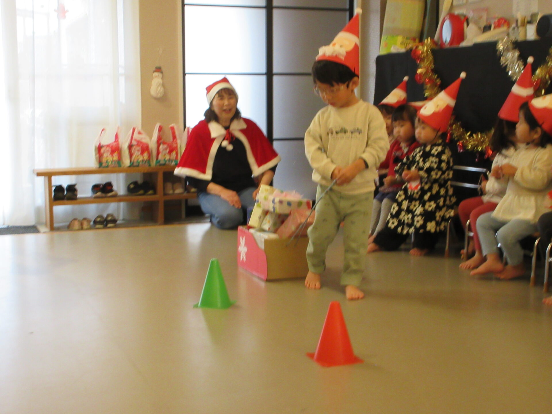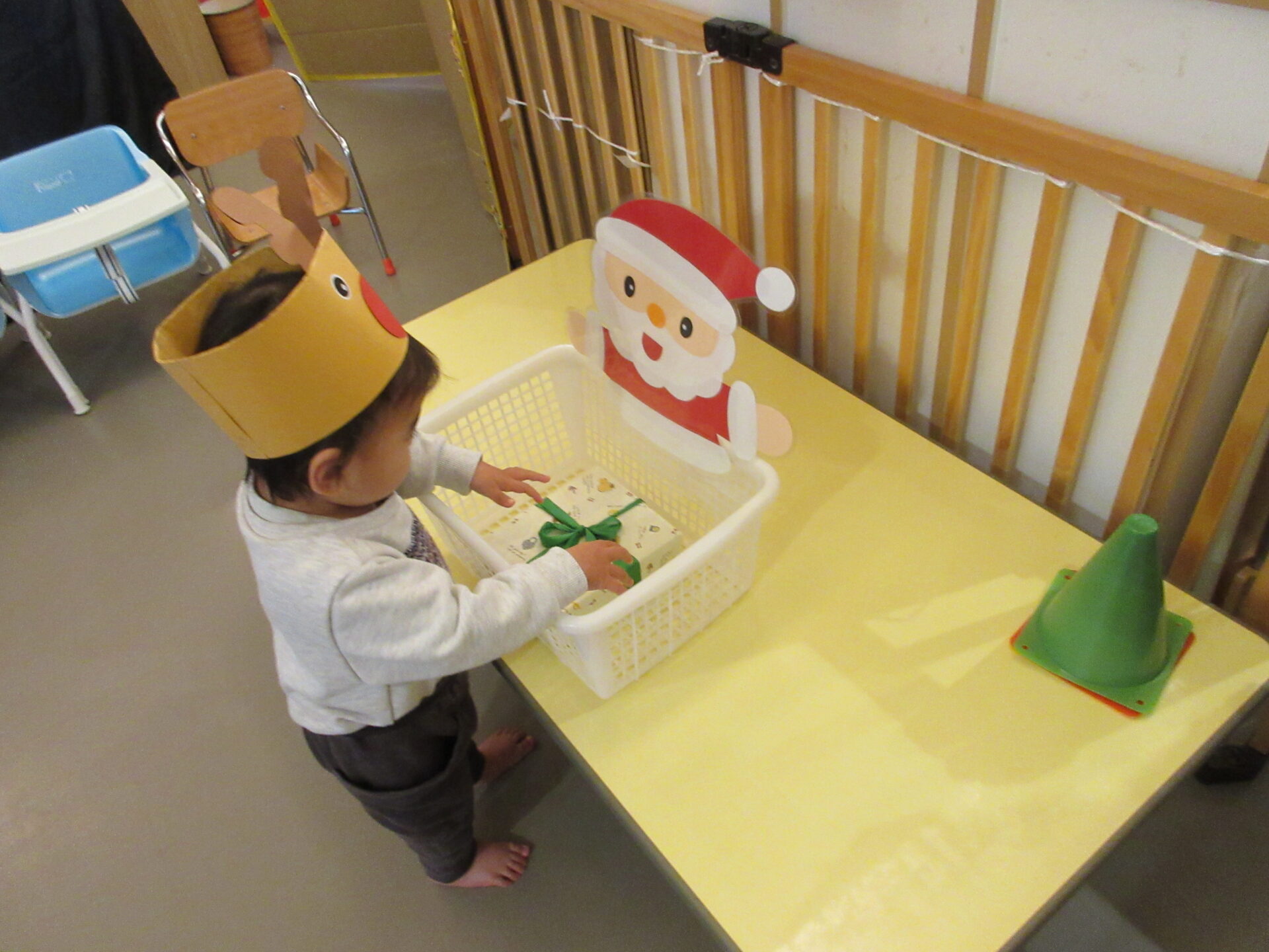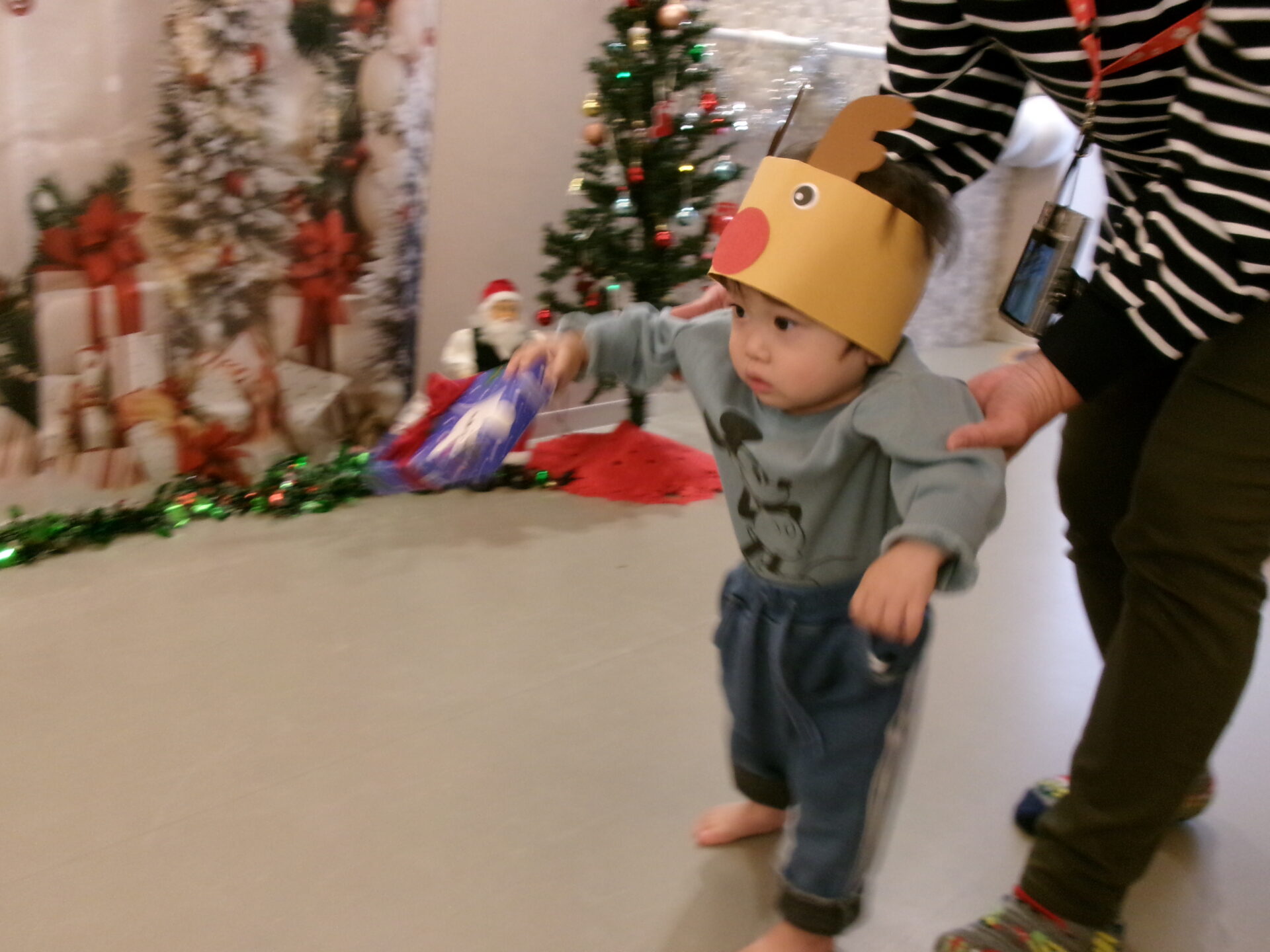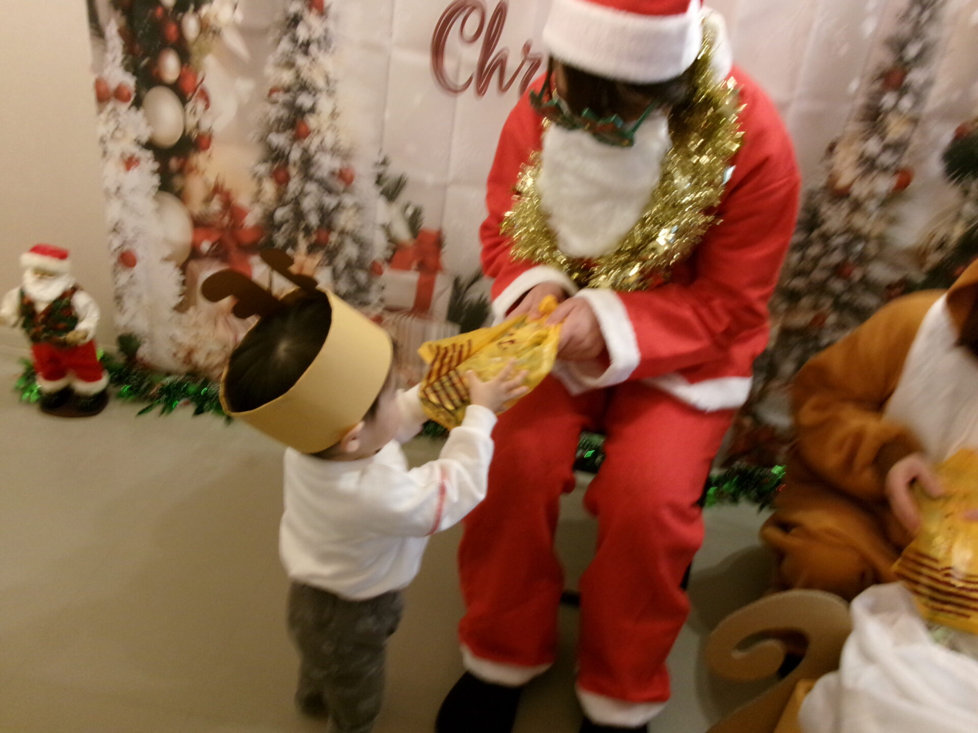 突然のサンタさん登場で、驚いて泣いてしまった子どももいましたが、赤い袋の中を見せてくれることになり、サンタさんの近くまで行くこともできました。