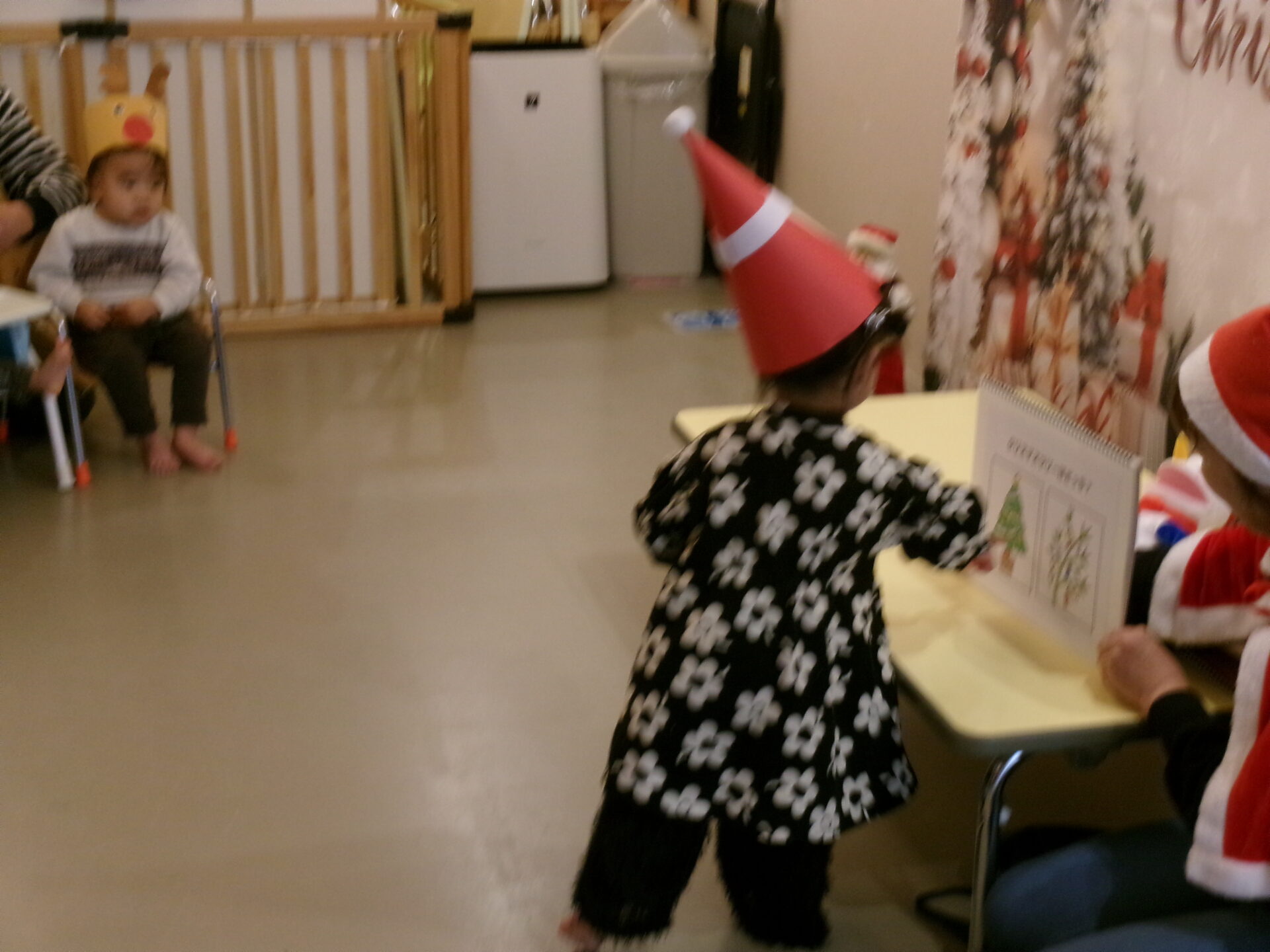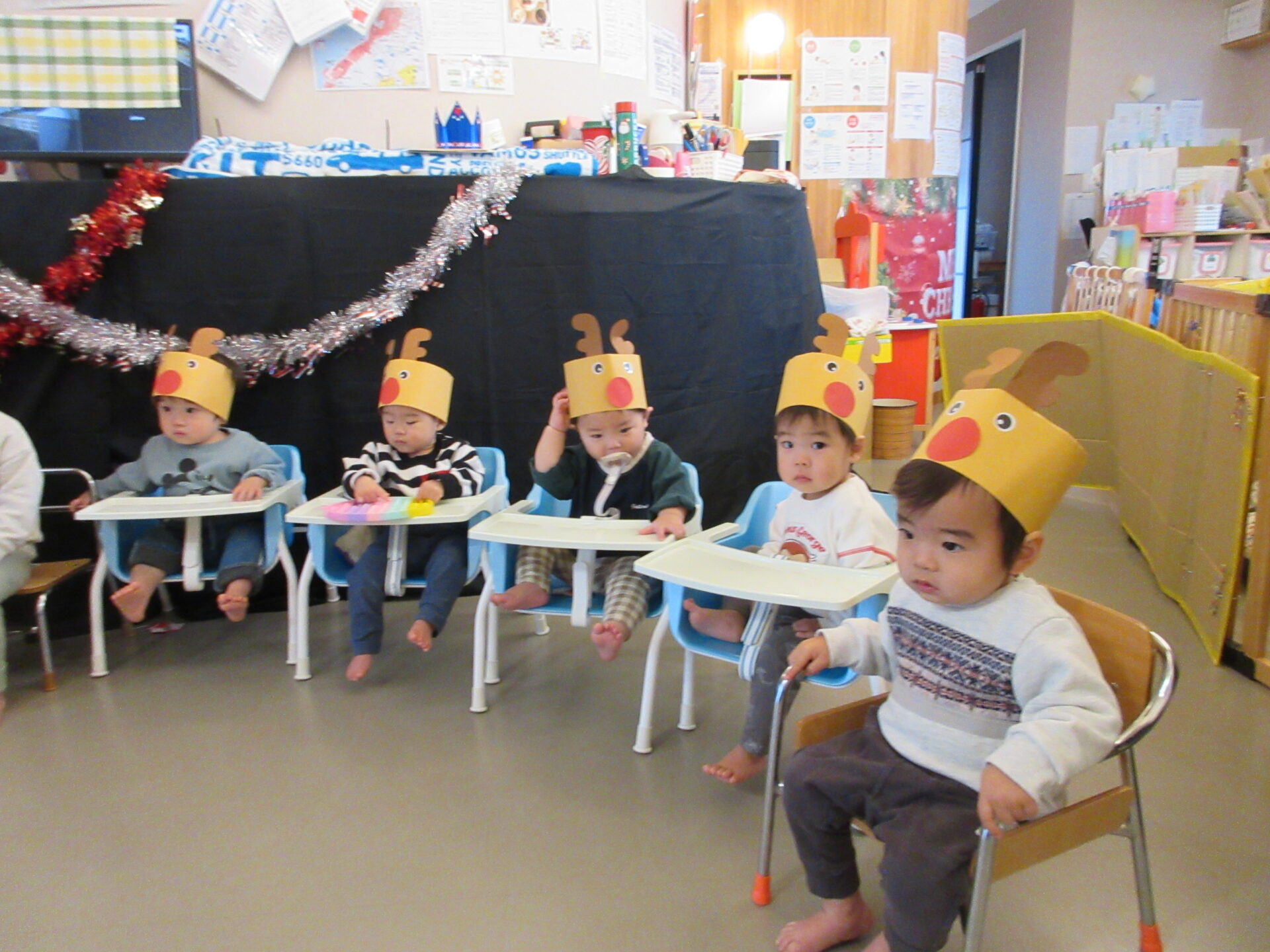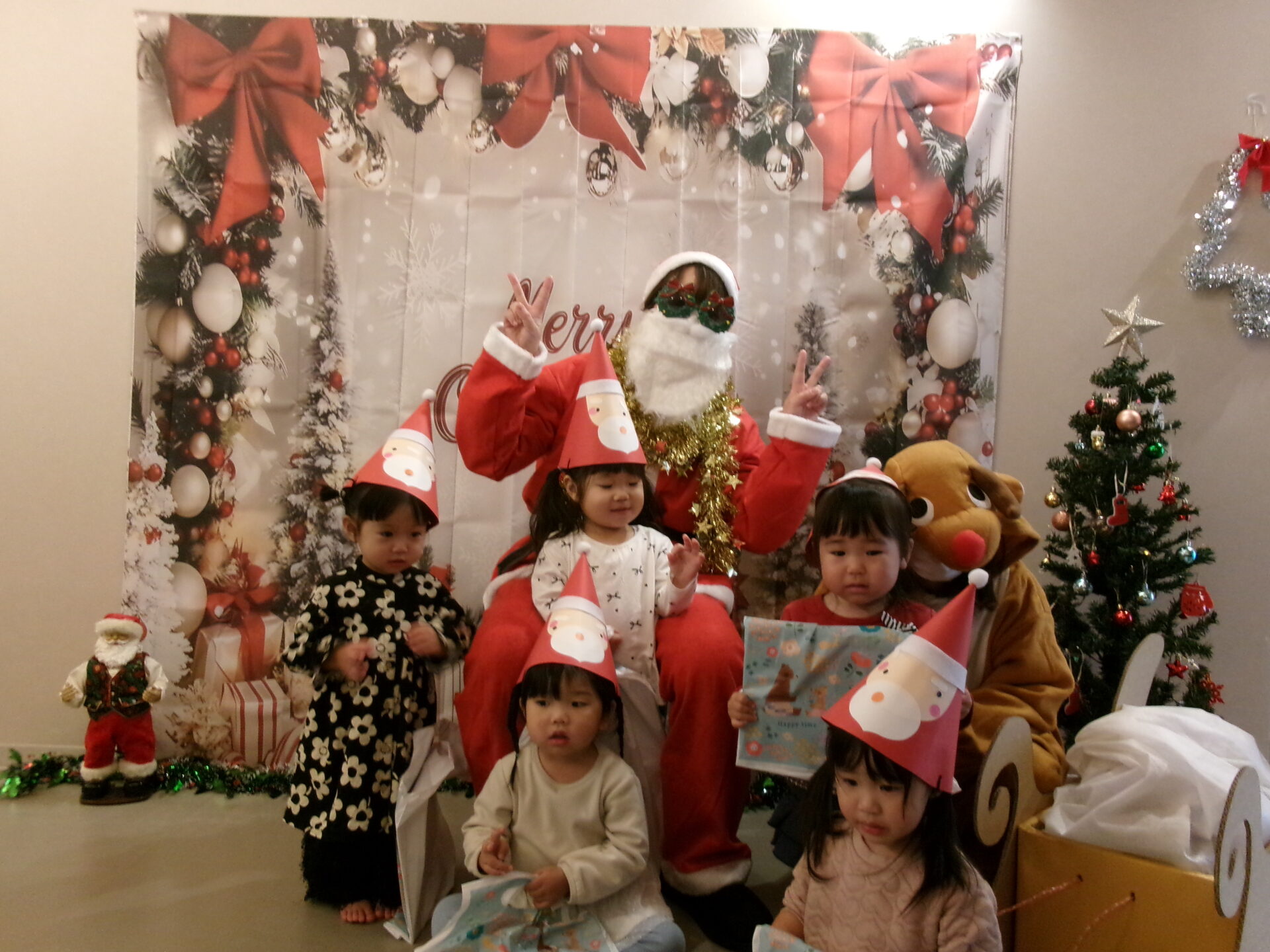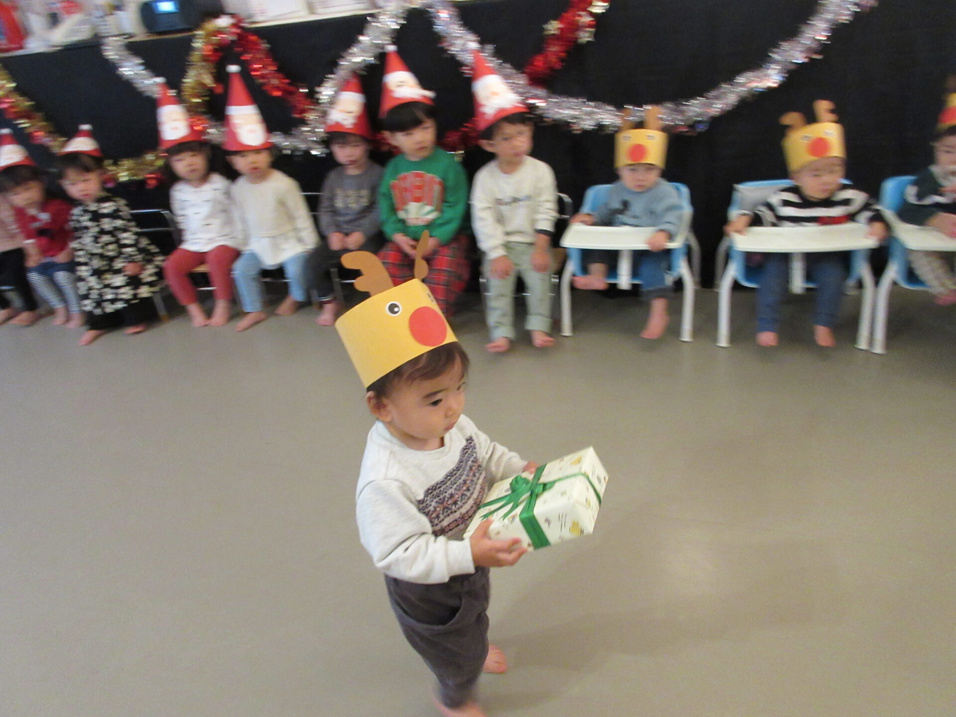 作ったサンタさんの三角帽子やトナカイのお面をつけて集まりました。