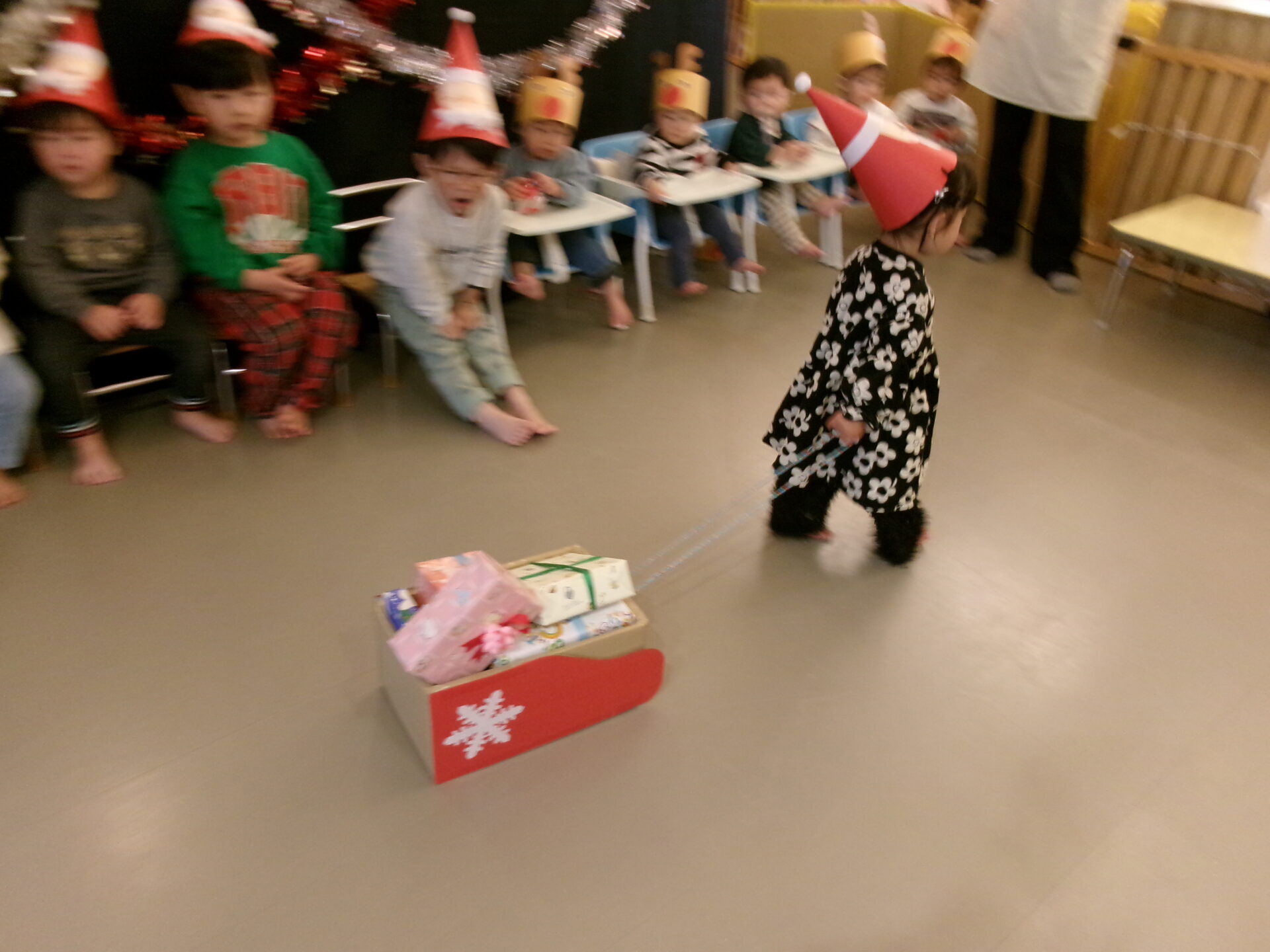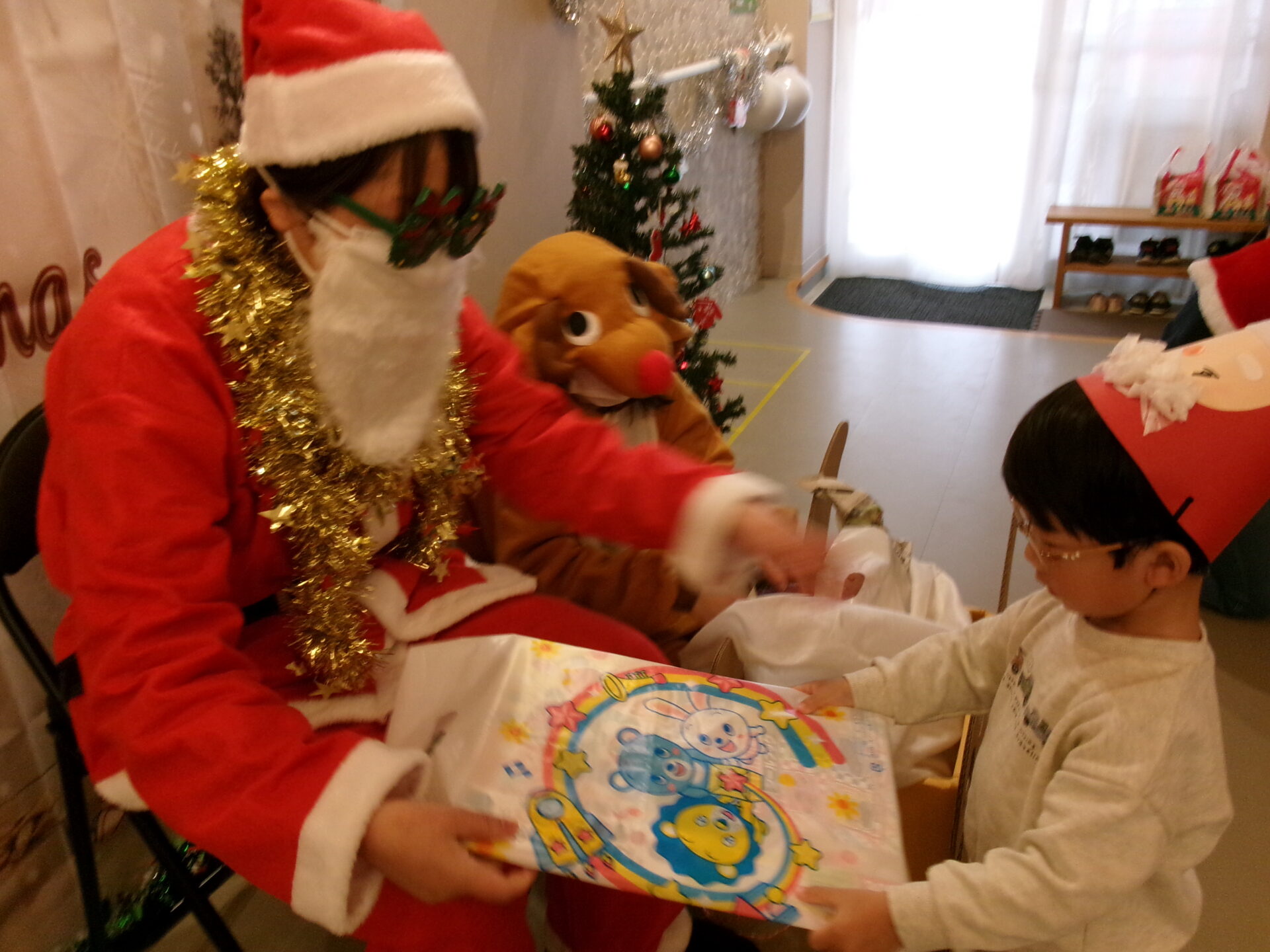 その後ろからは、かわいいトナカイさんがプレゼントを運んで来てくれました。