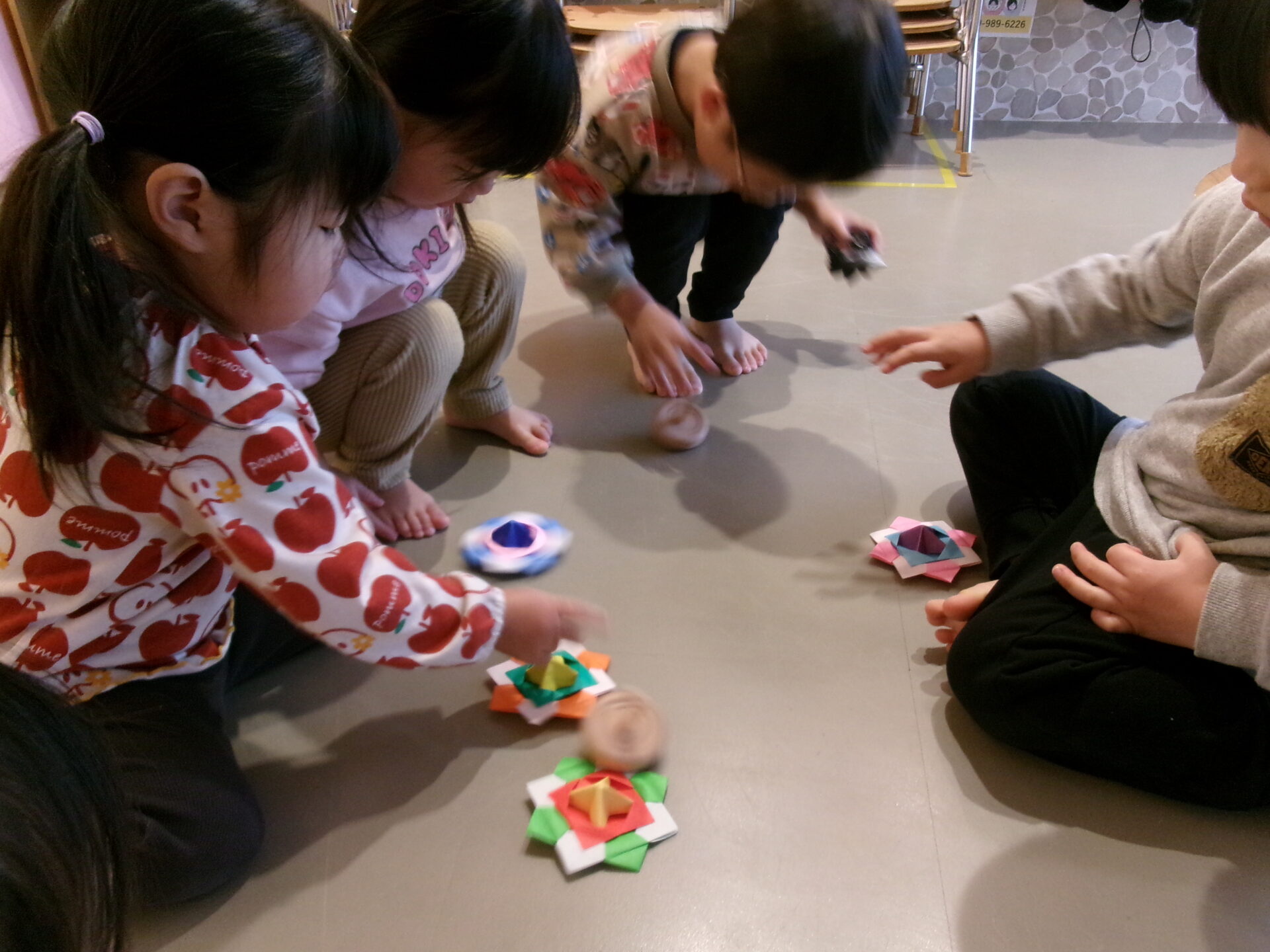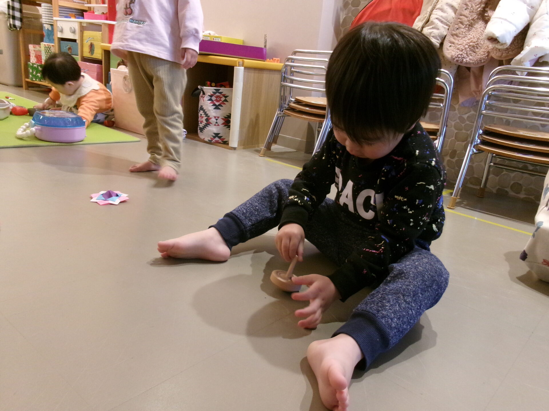 コマは、初めて見る子がほとんどのようで、回して見せると真似をして上手に回して遊び始めました。