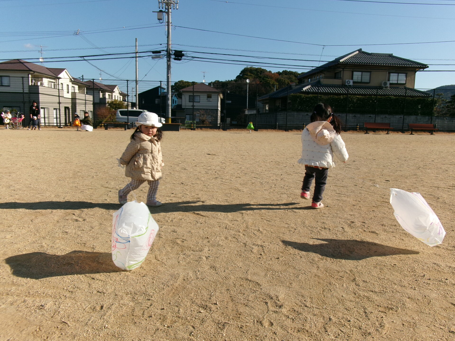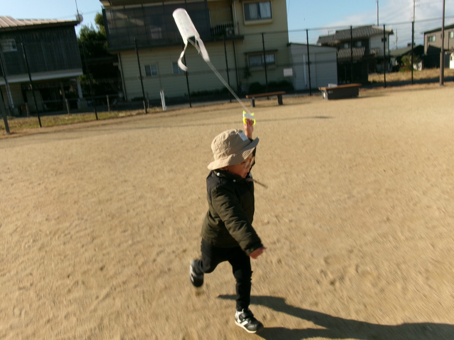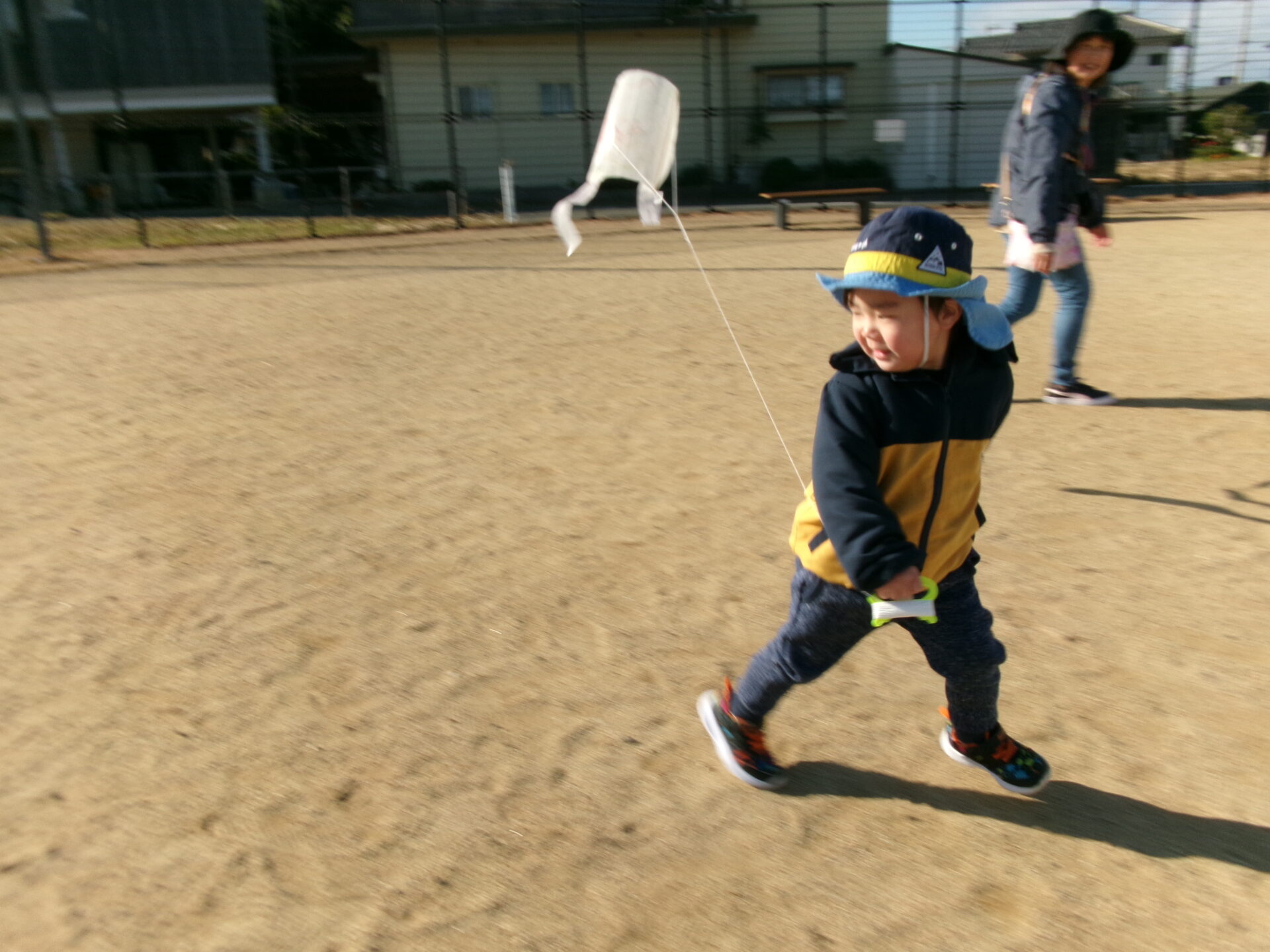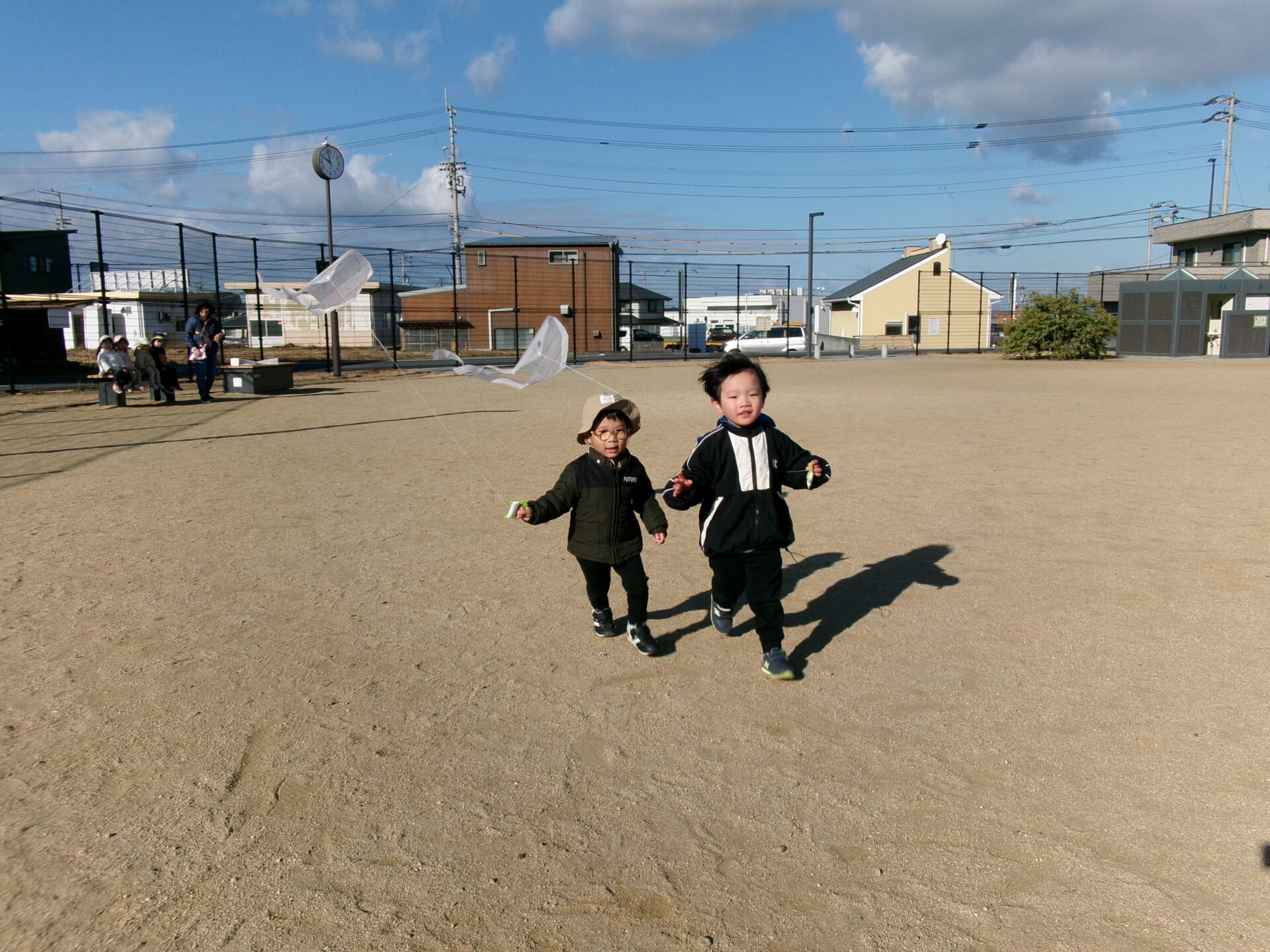 広い広場を走り回って、上手に凧揚げをすることができました。