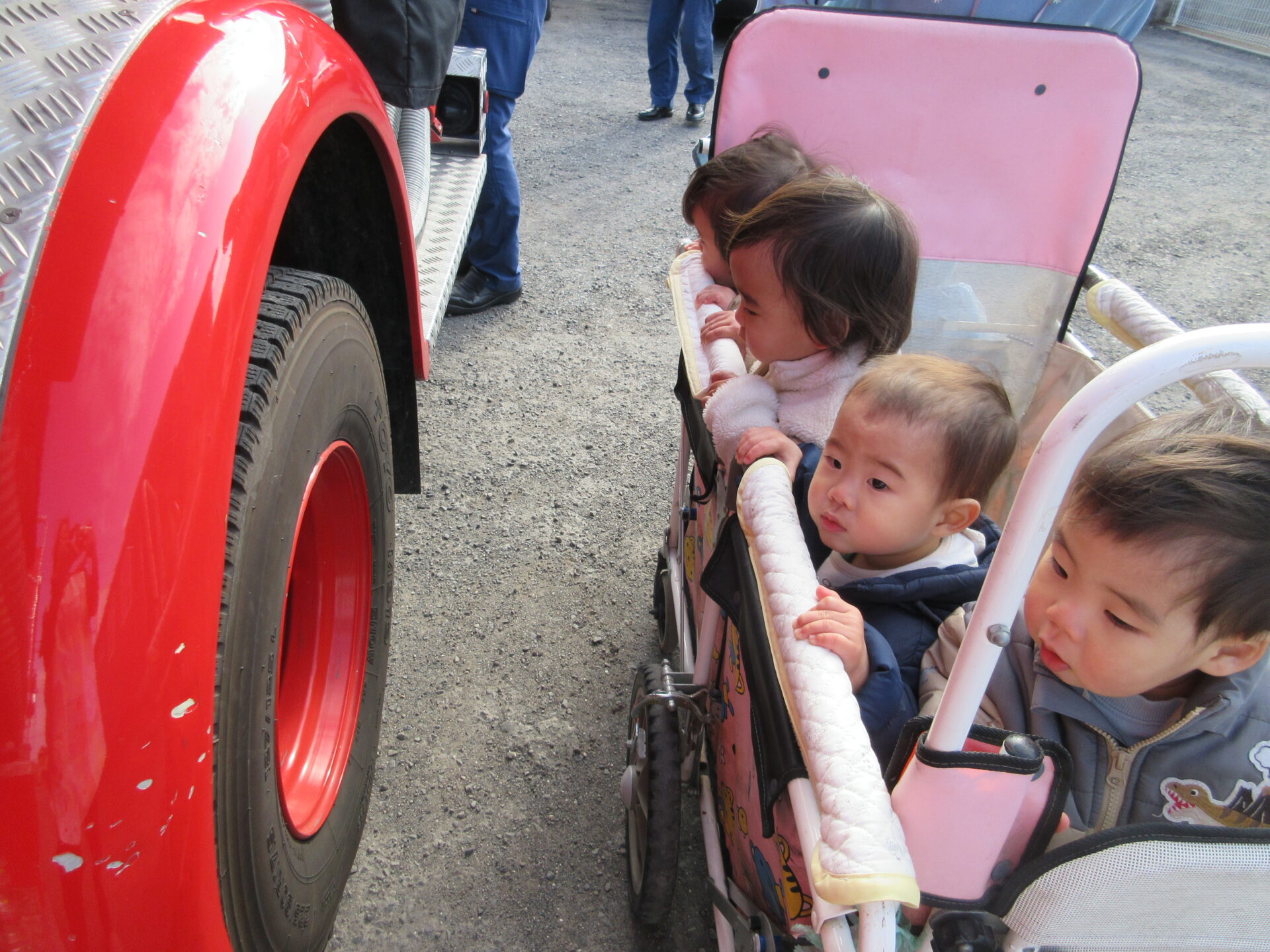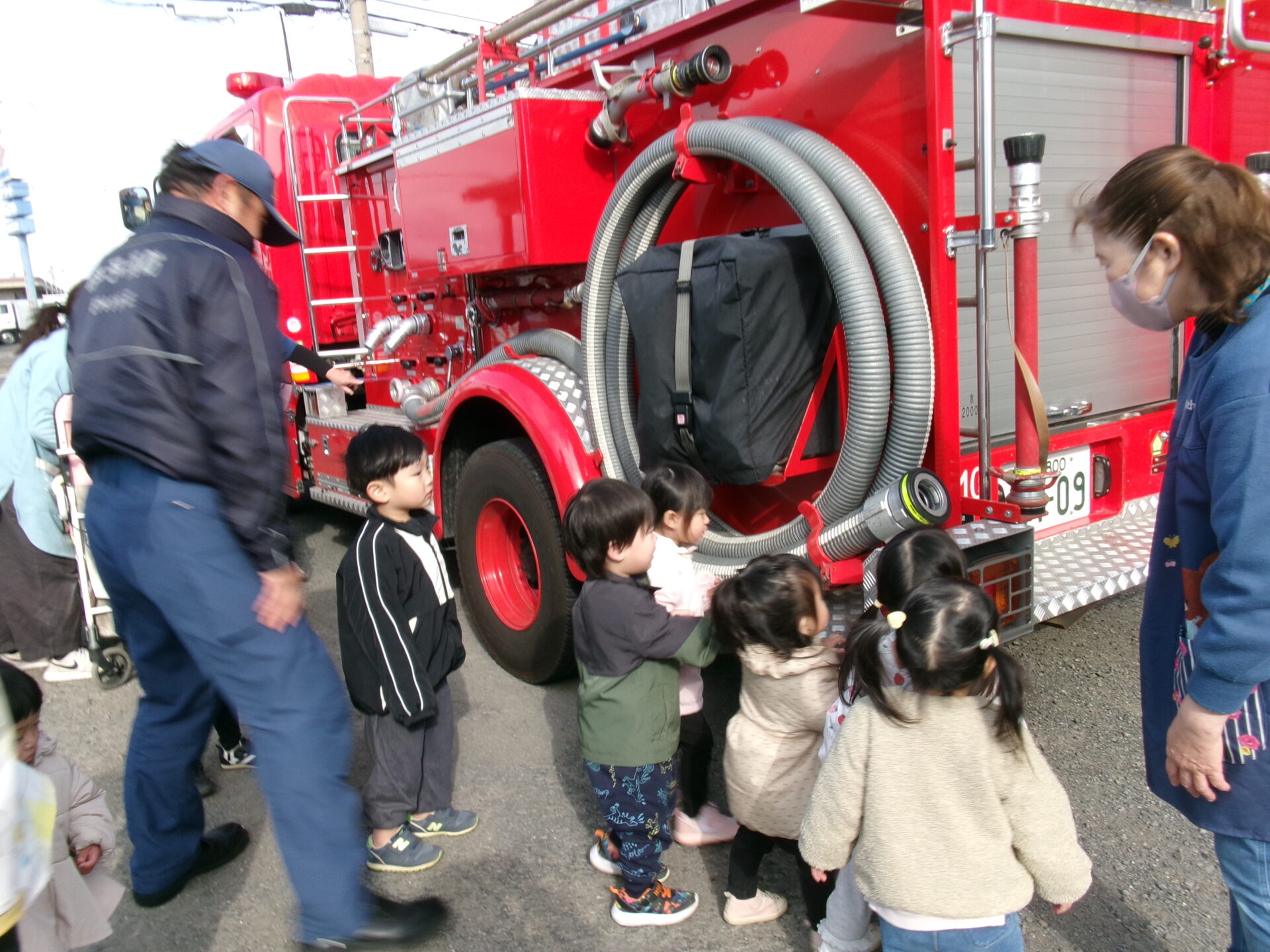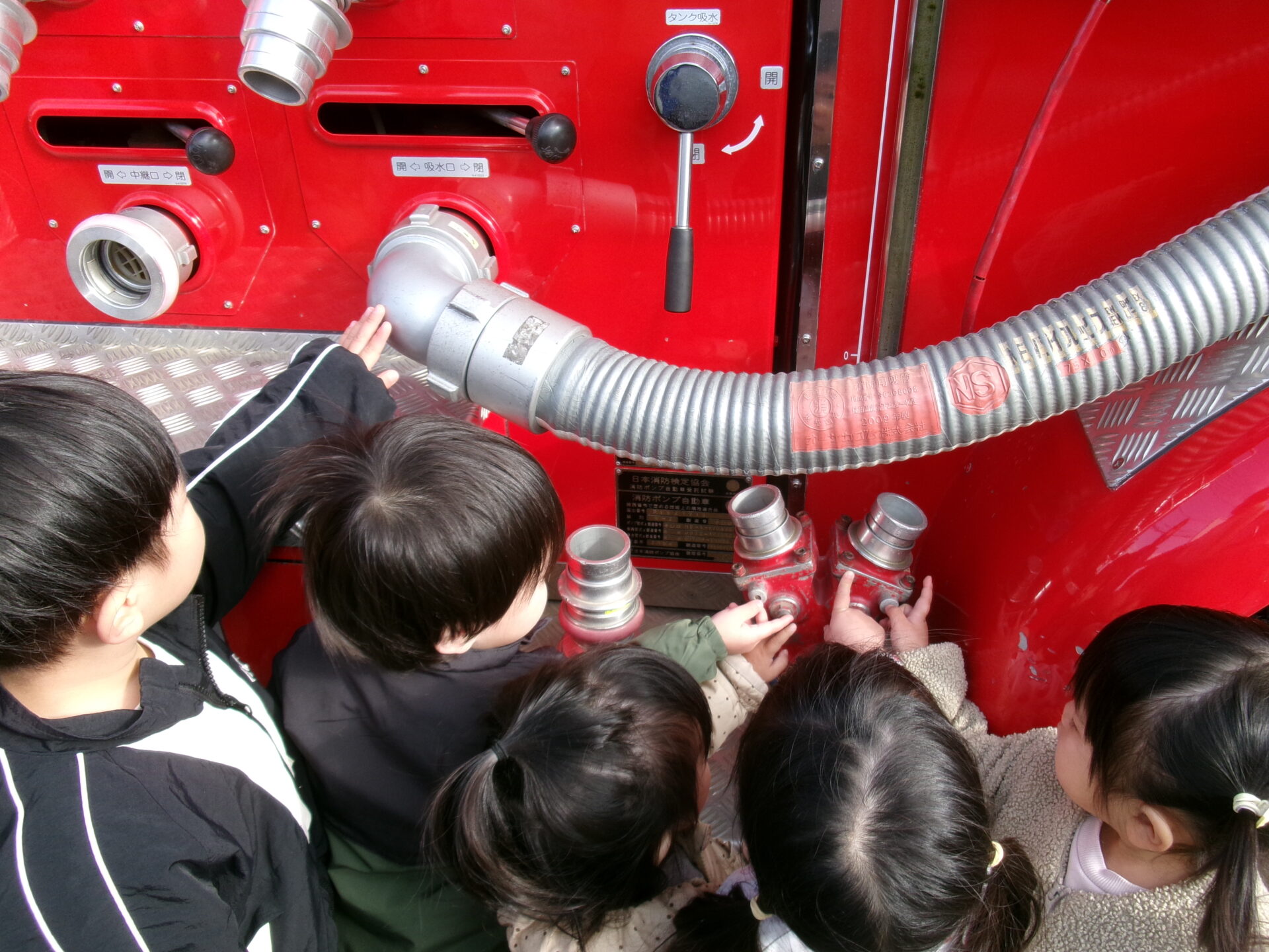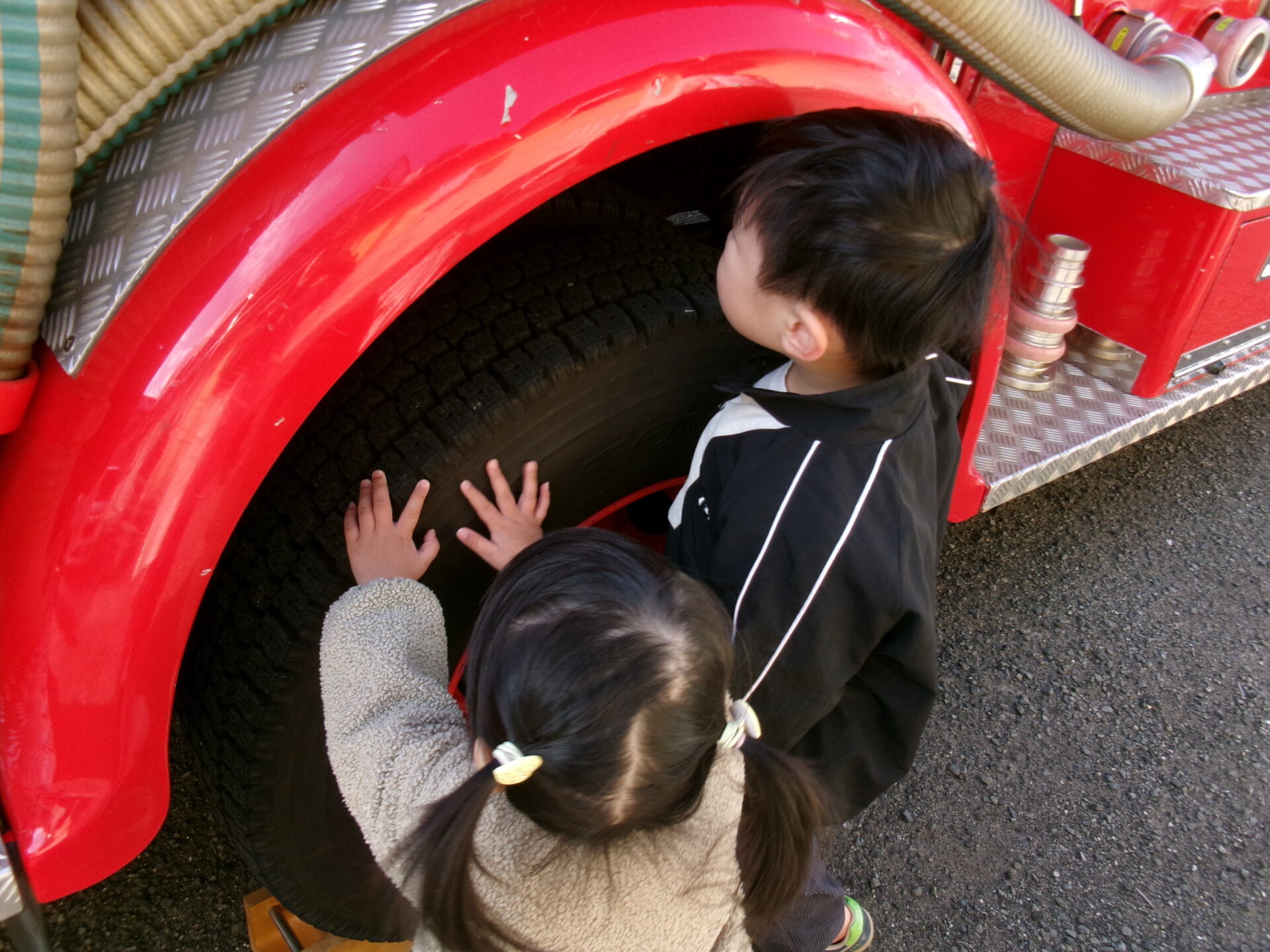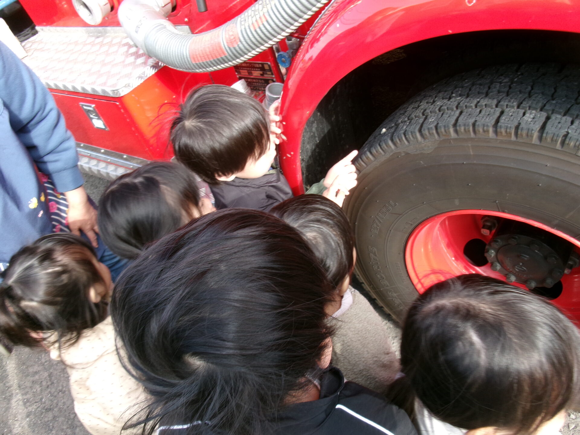 興味津々で、大きなタイヤを触ったり、ホースの先を持たせてもらったり、シャッターの中を見せてもらったりして、いい体験ができました。