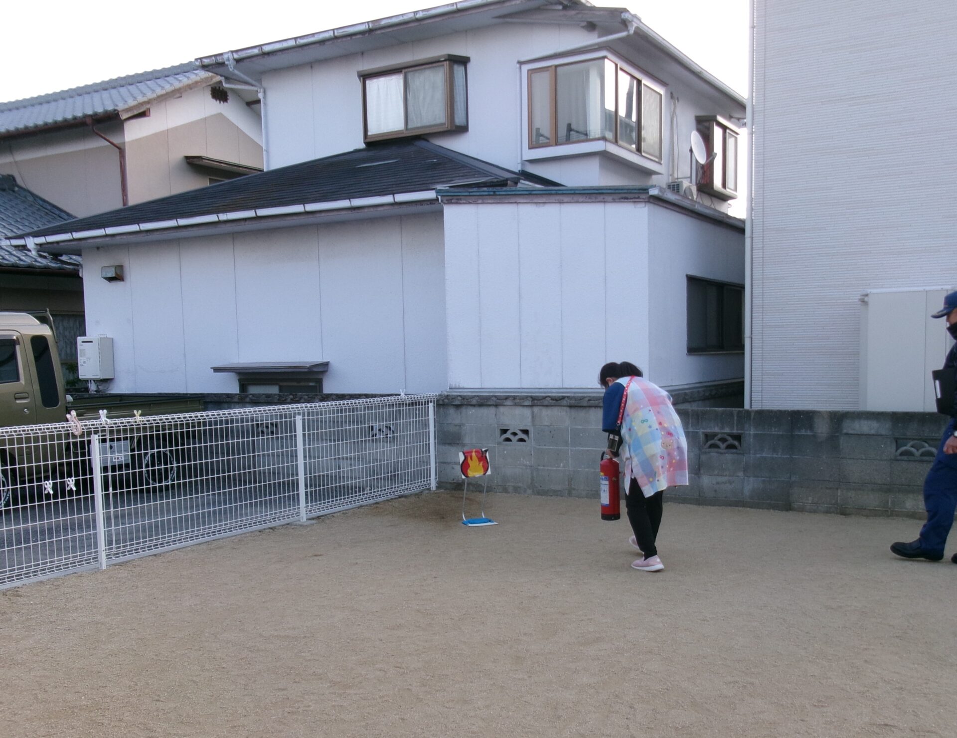 「火事よ~!!」の声に、子どもたちは職員の周りに集まってから、外に避難しました。