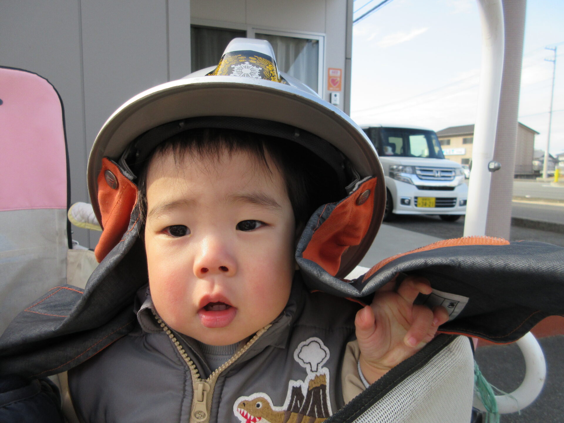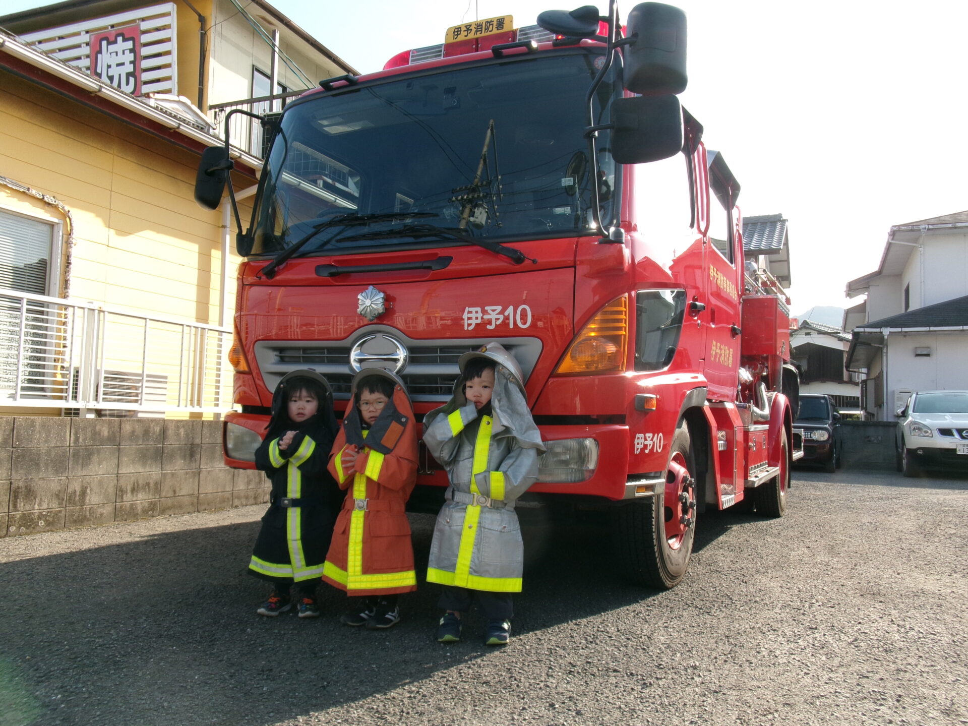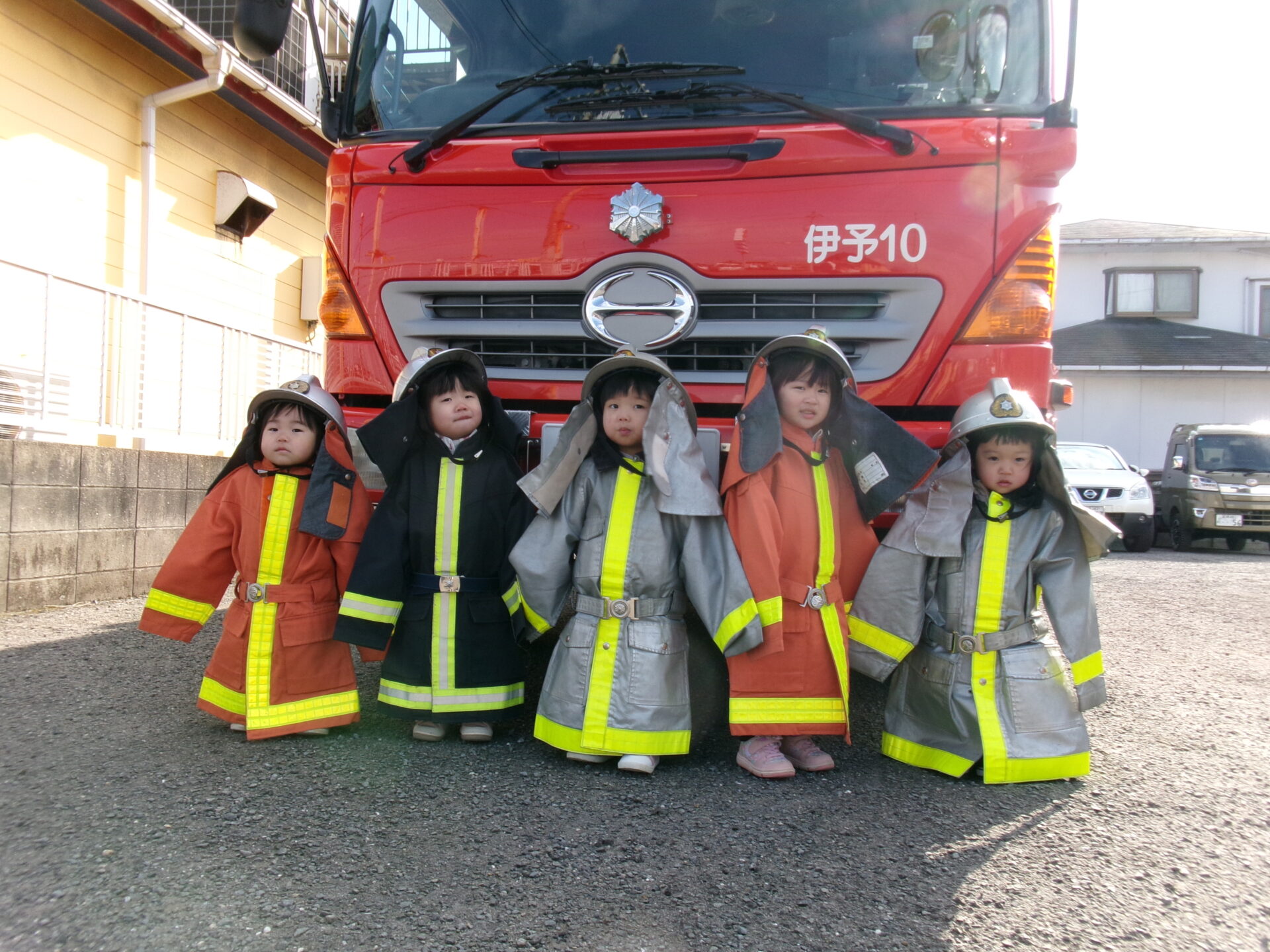 子どもたちは、消防服とヘルメットを着させてもらい、小さな消防士さんに変身です😊