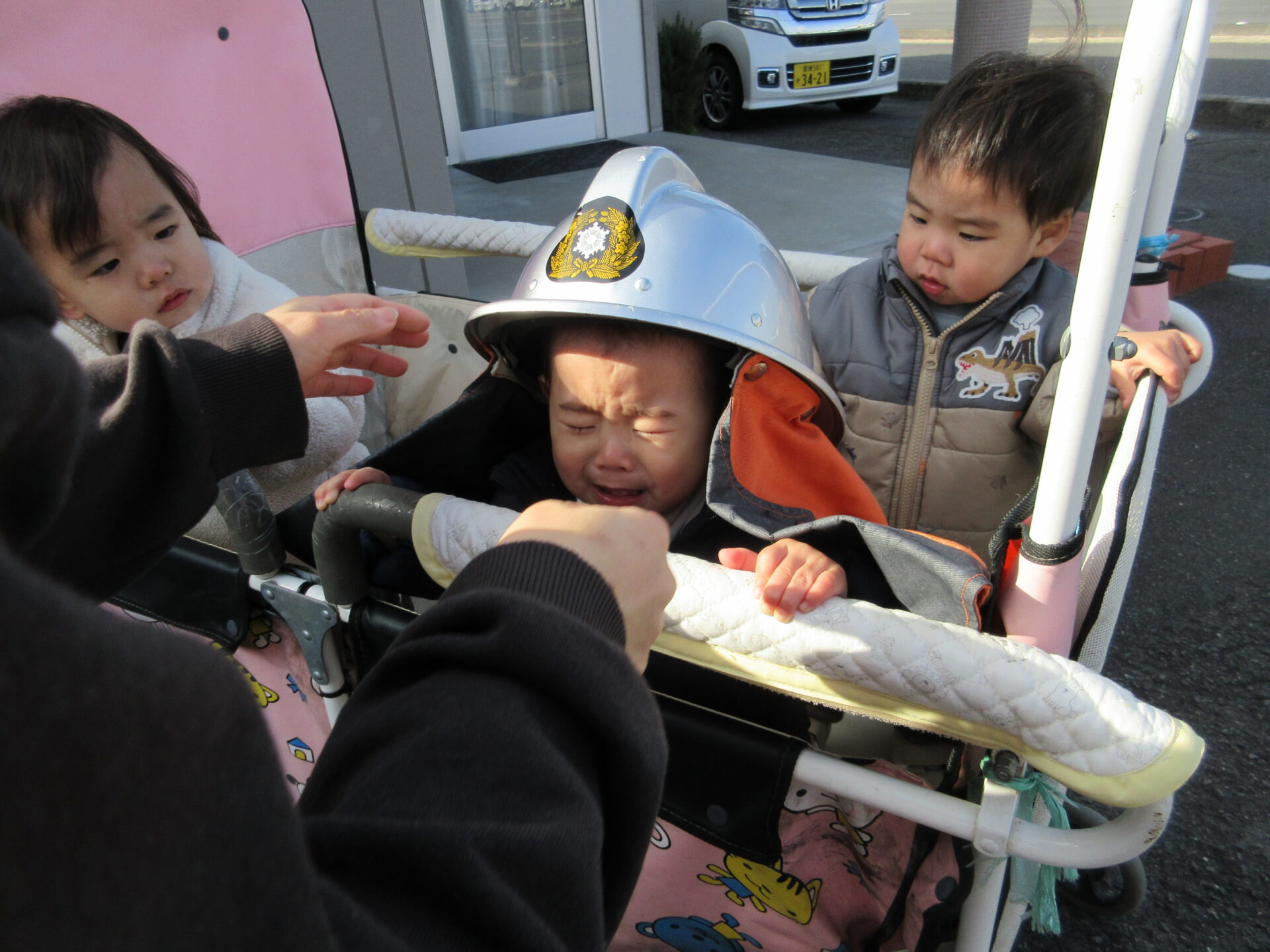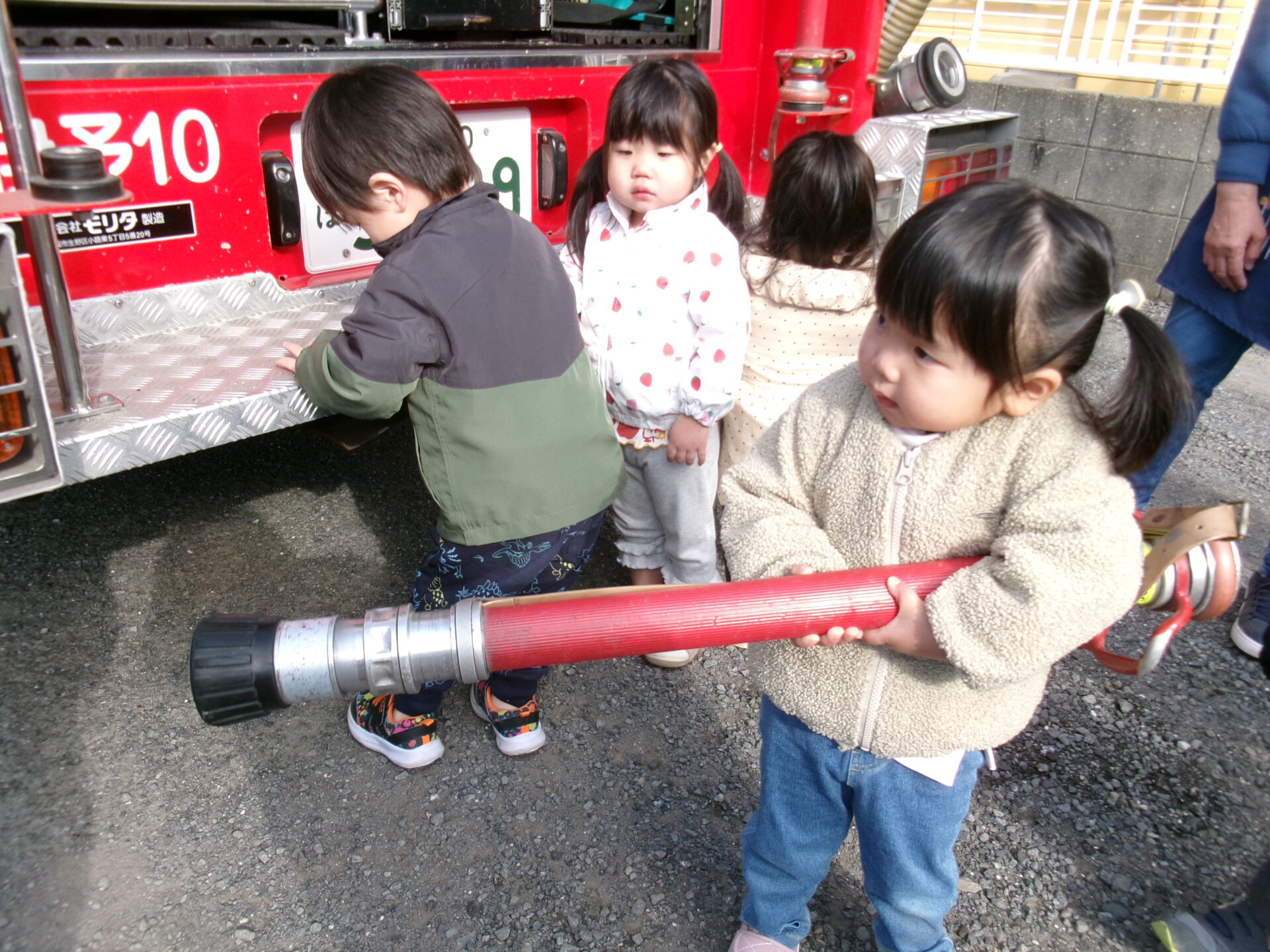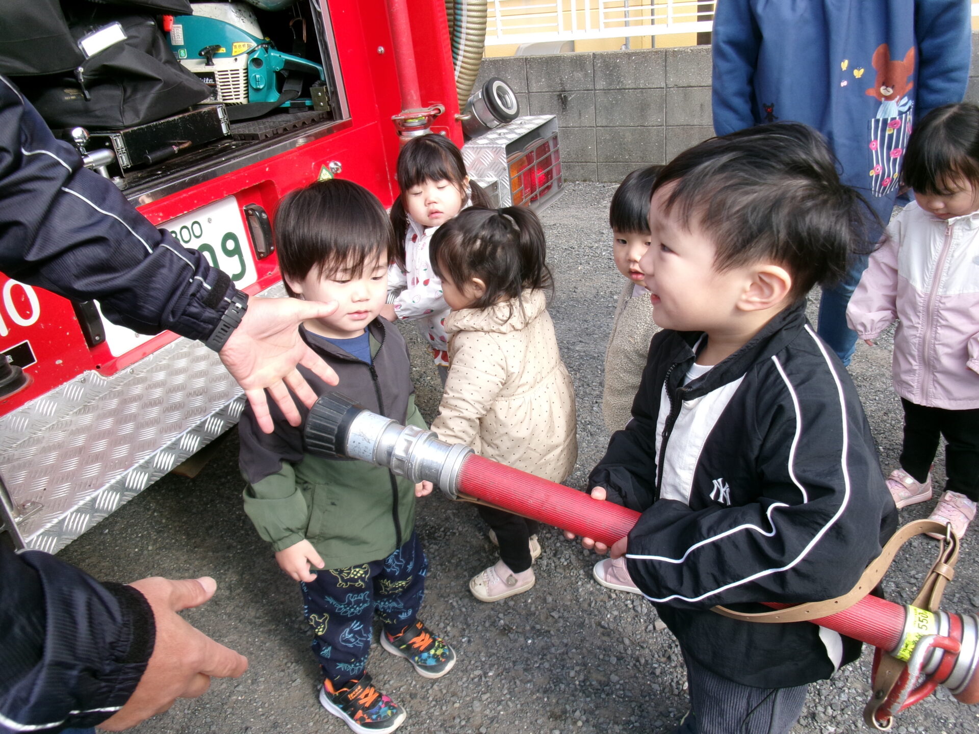 まんぼう組(2歳児)の男の子たちは、憧れの消防士さんになった気分を味わいました。