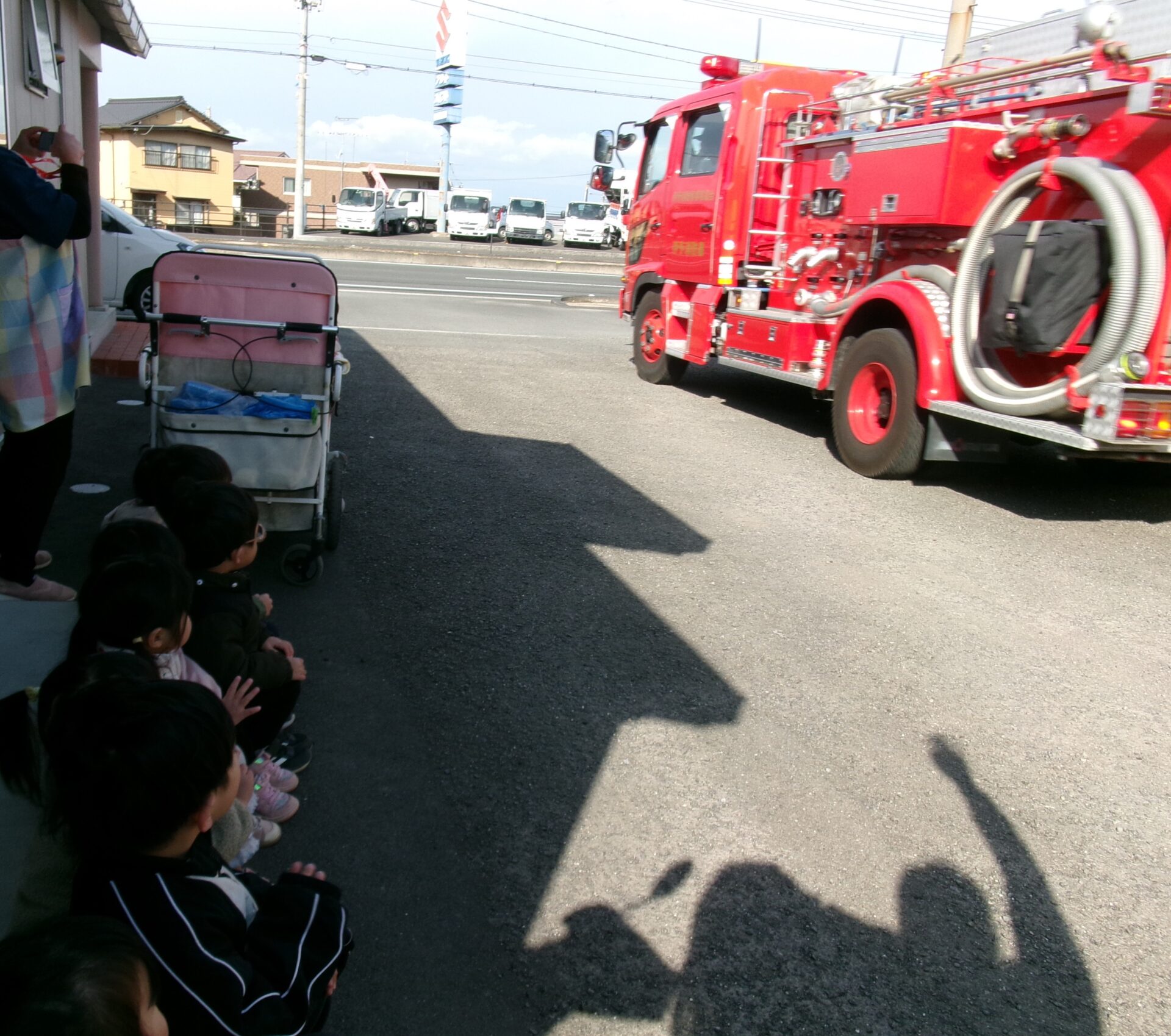 最後はみんなでお礼を言って、消防車を見送りました。