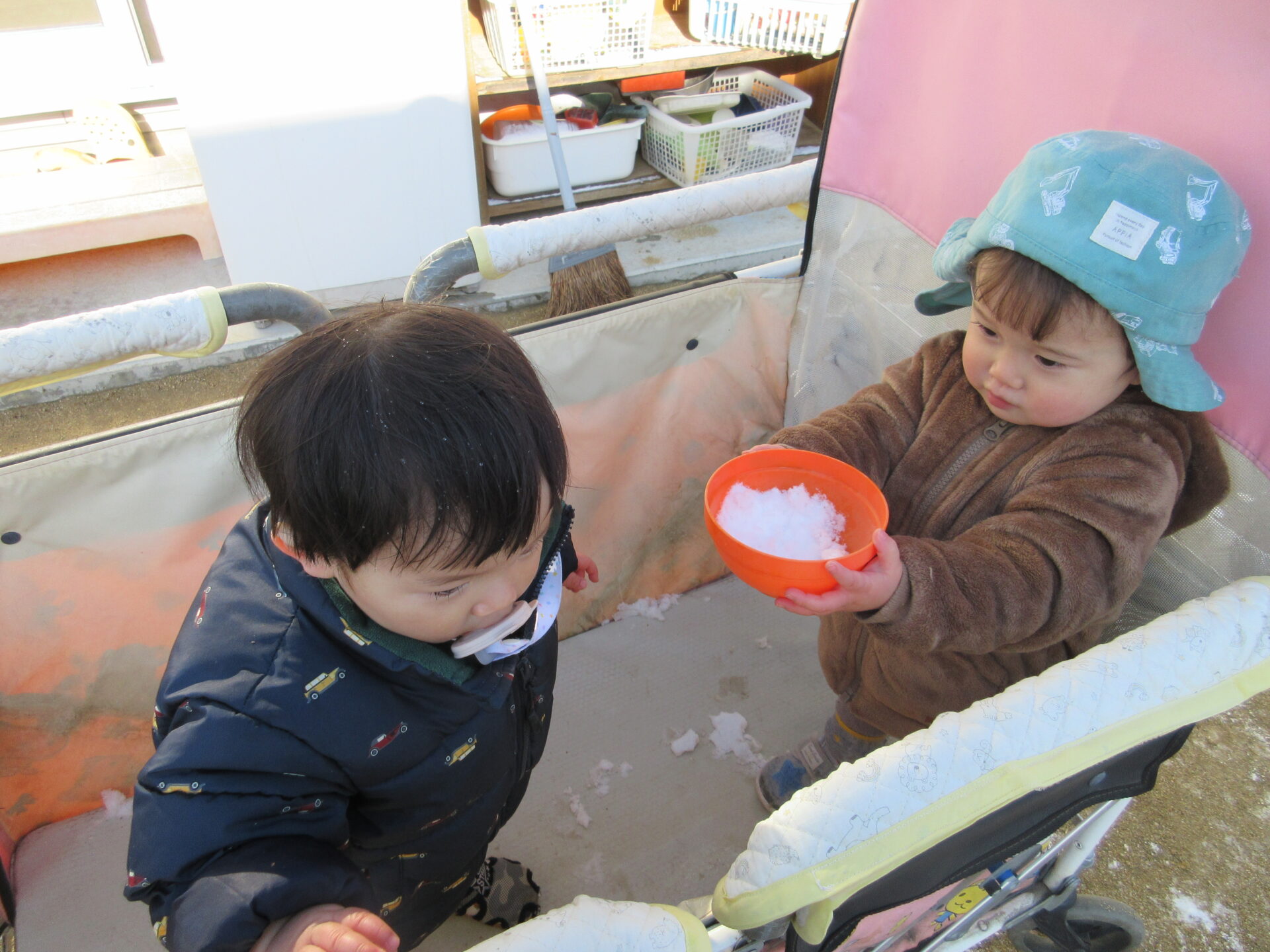 ブロック塀に積もった雪を触ったり、地面に積もった雪をカップに入れてかき氷に見立てたりして楽しんでいました。