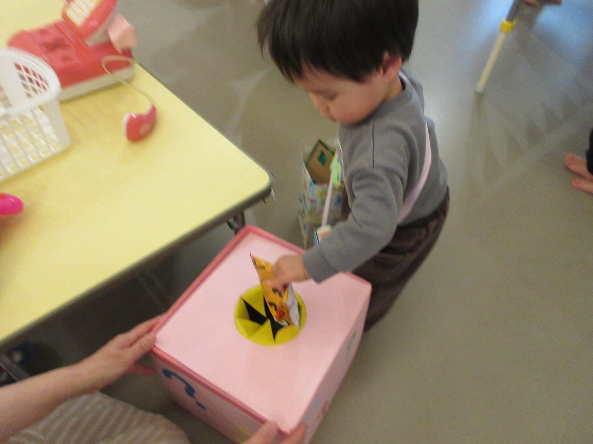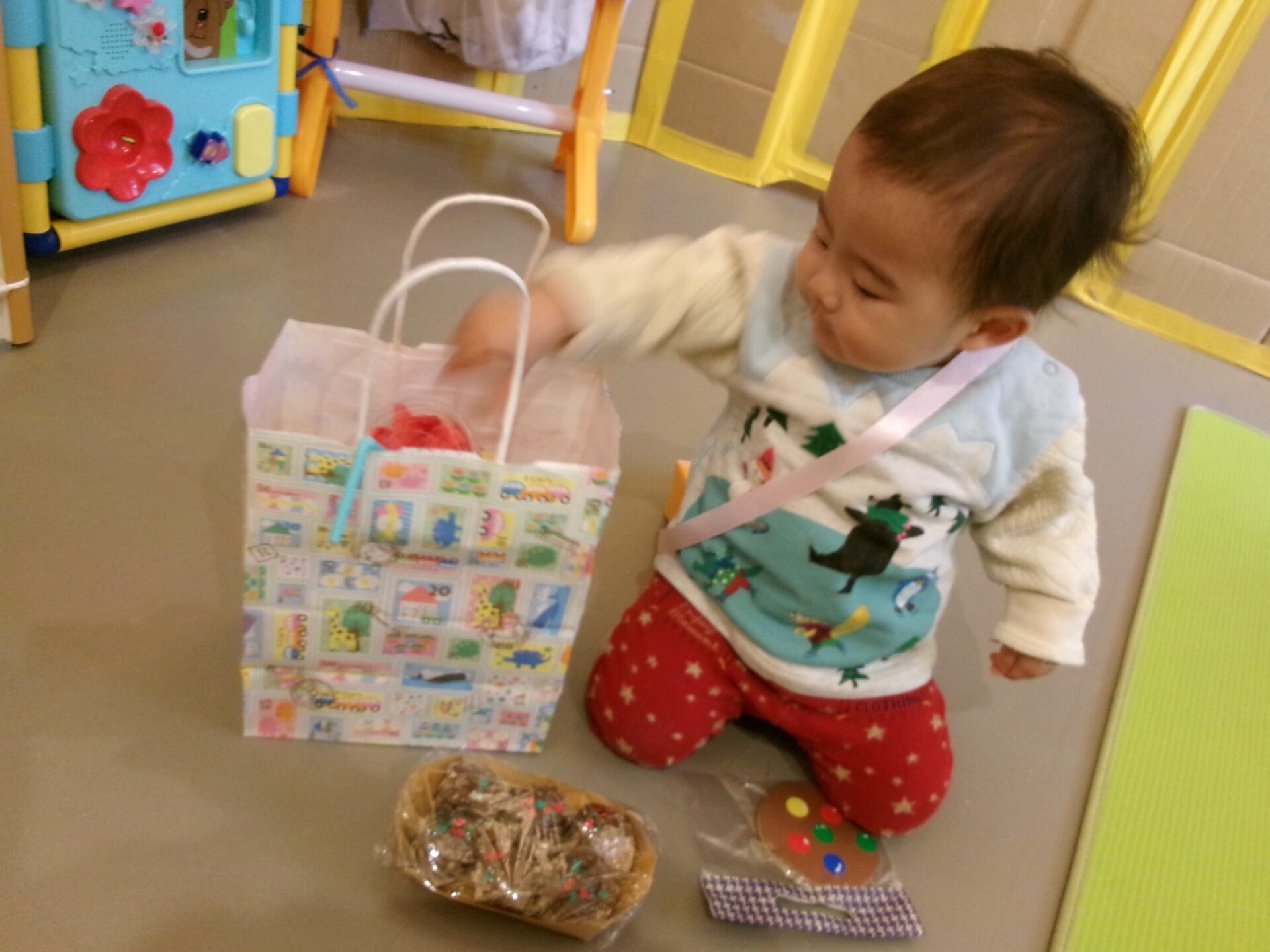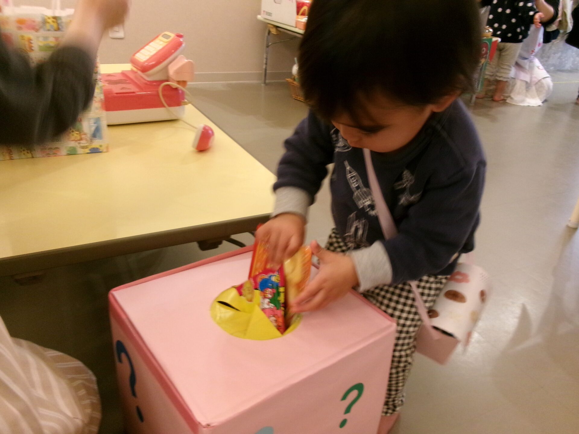 お楽しみボックスに手を入れて、良い物をもらって嬉しそうでした。
