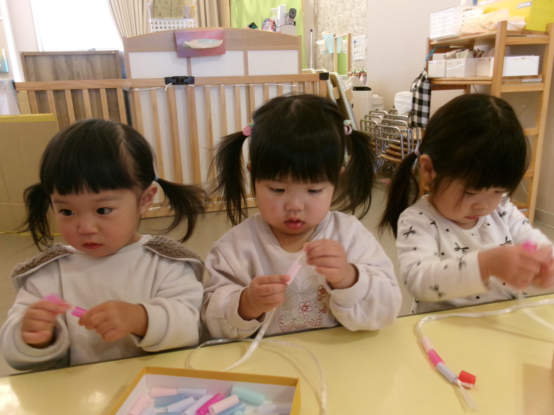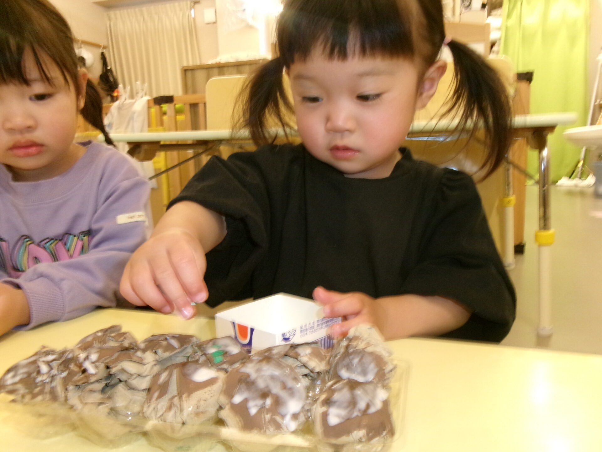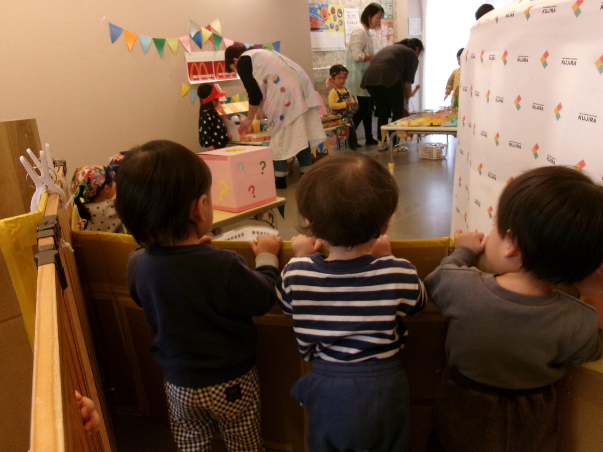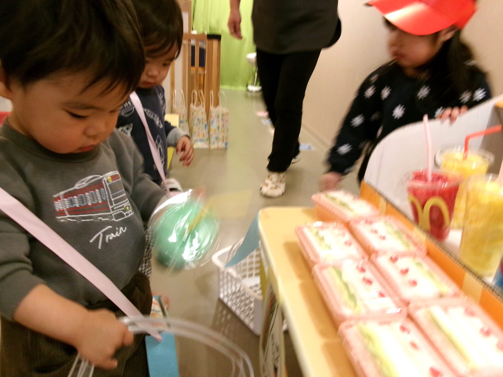 そら組(1歳児)、まんぼう組(2歳児)は、「たこ焼き屋さんになりたいなあ」等と自分たちでなりたいお店を決め、お買い物ごっこに期待を膨らましていました。