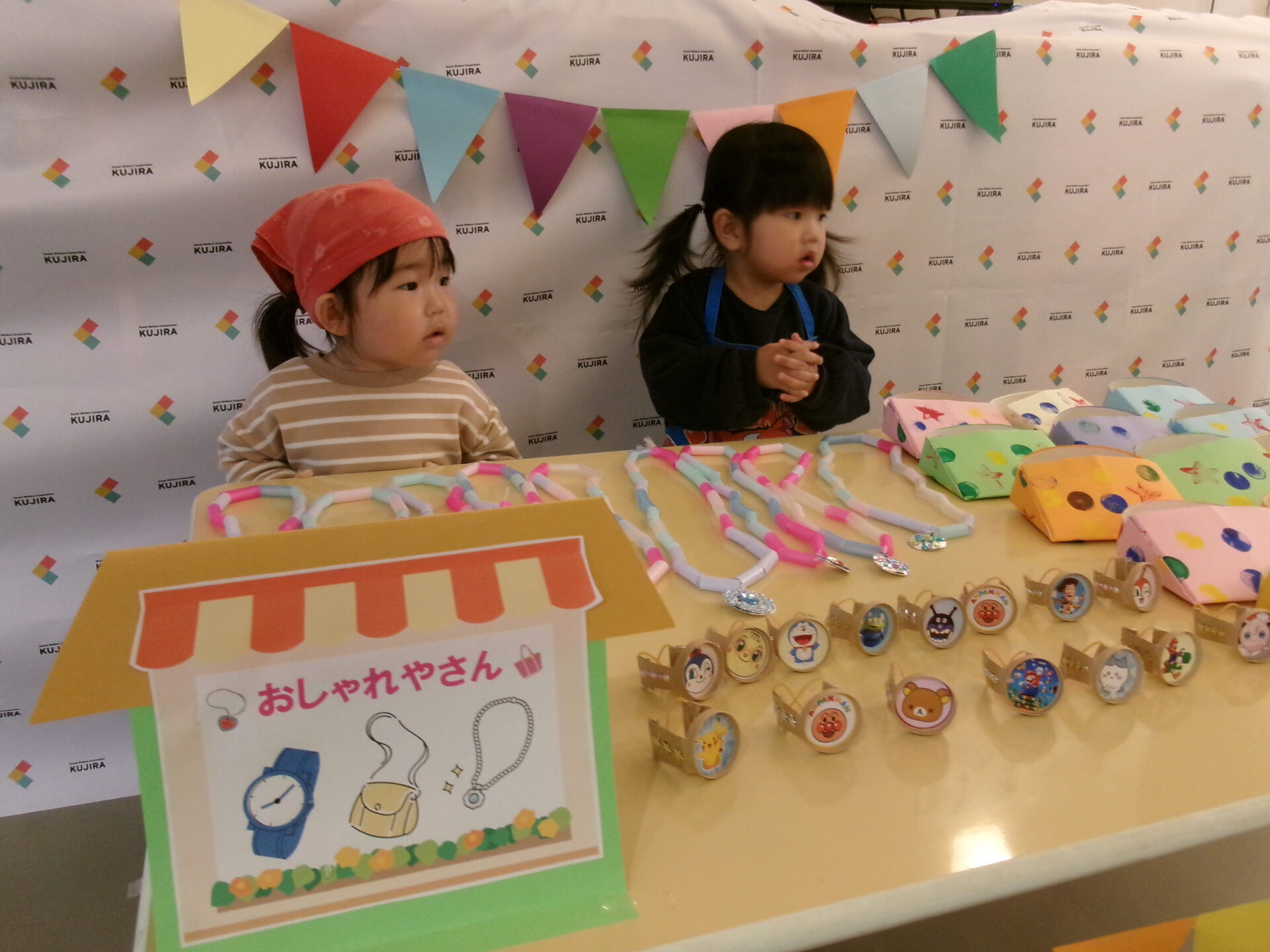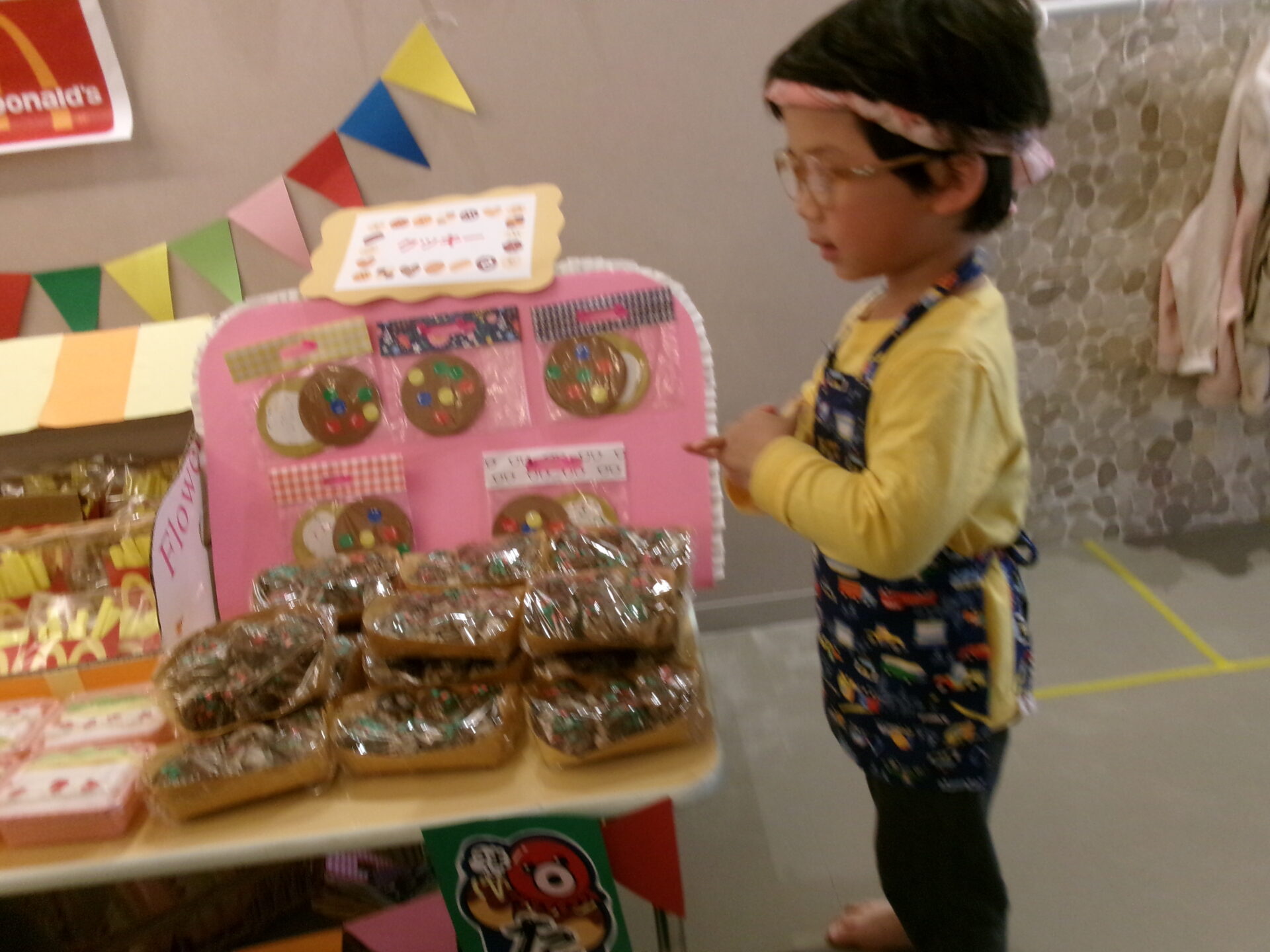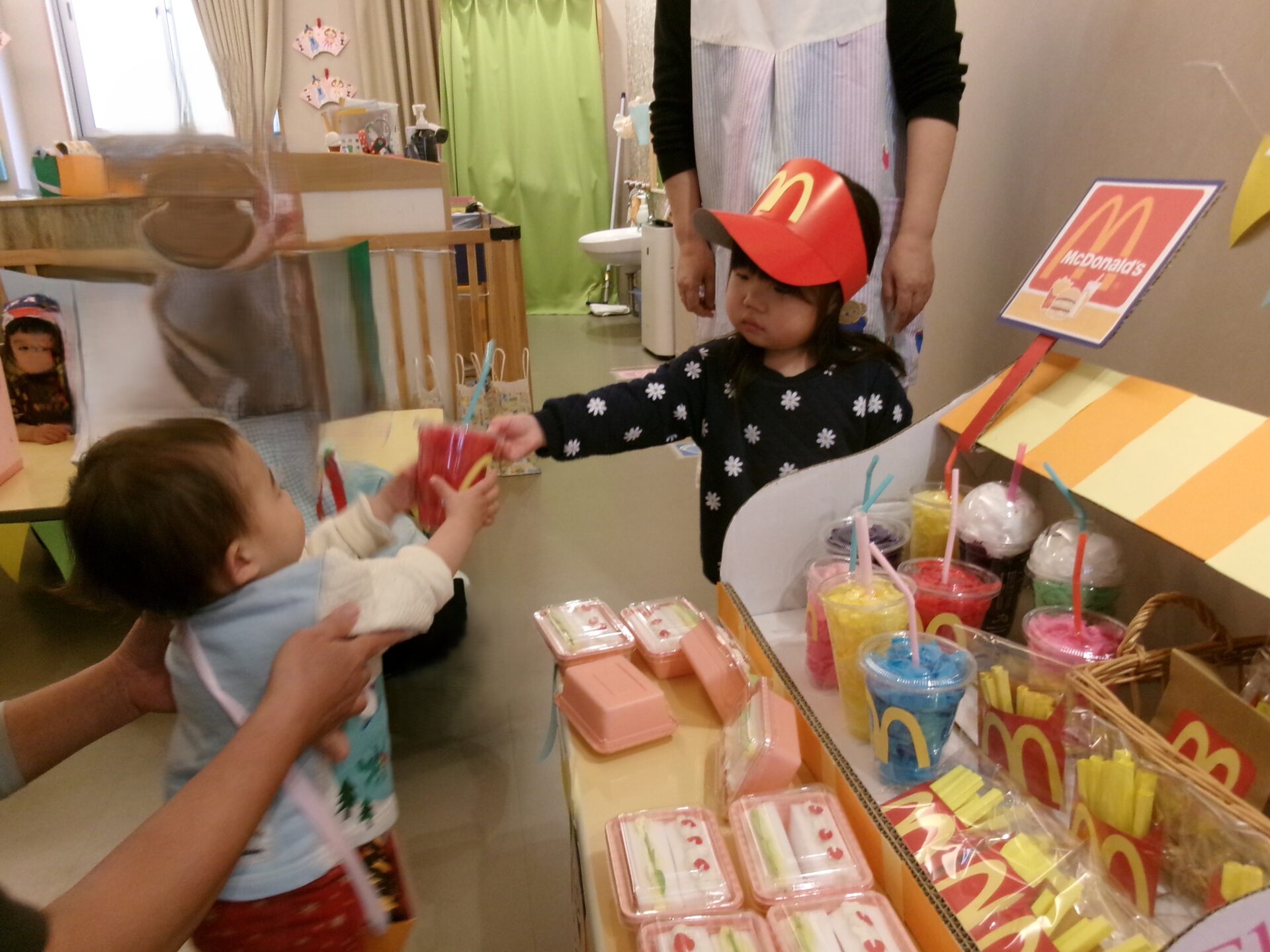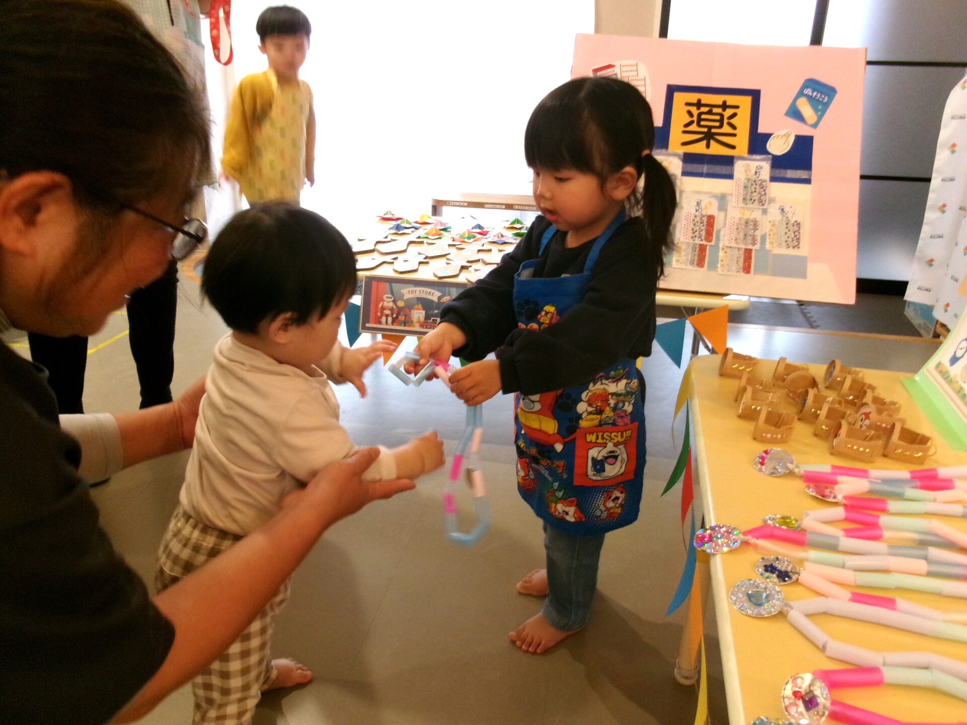 そら組(1歳児)、まんぼう組(2歳児)は、エプロンや三角巾など着けて、お店に立ち、準備完了です!