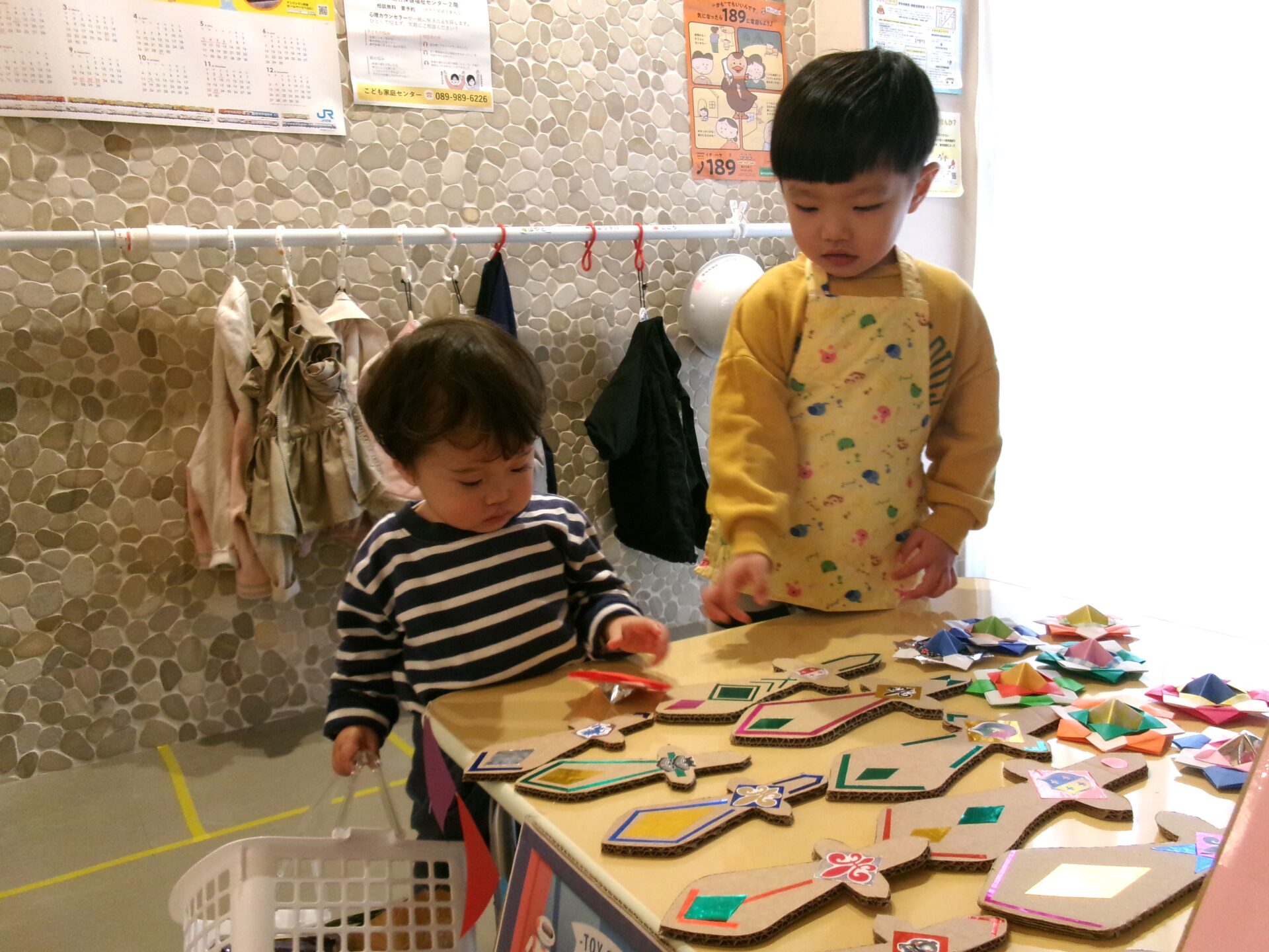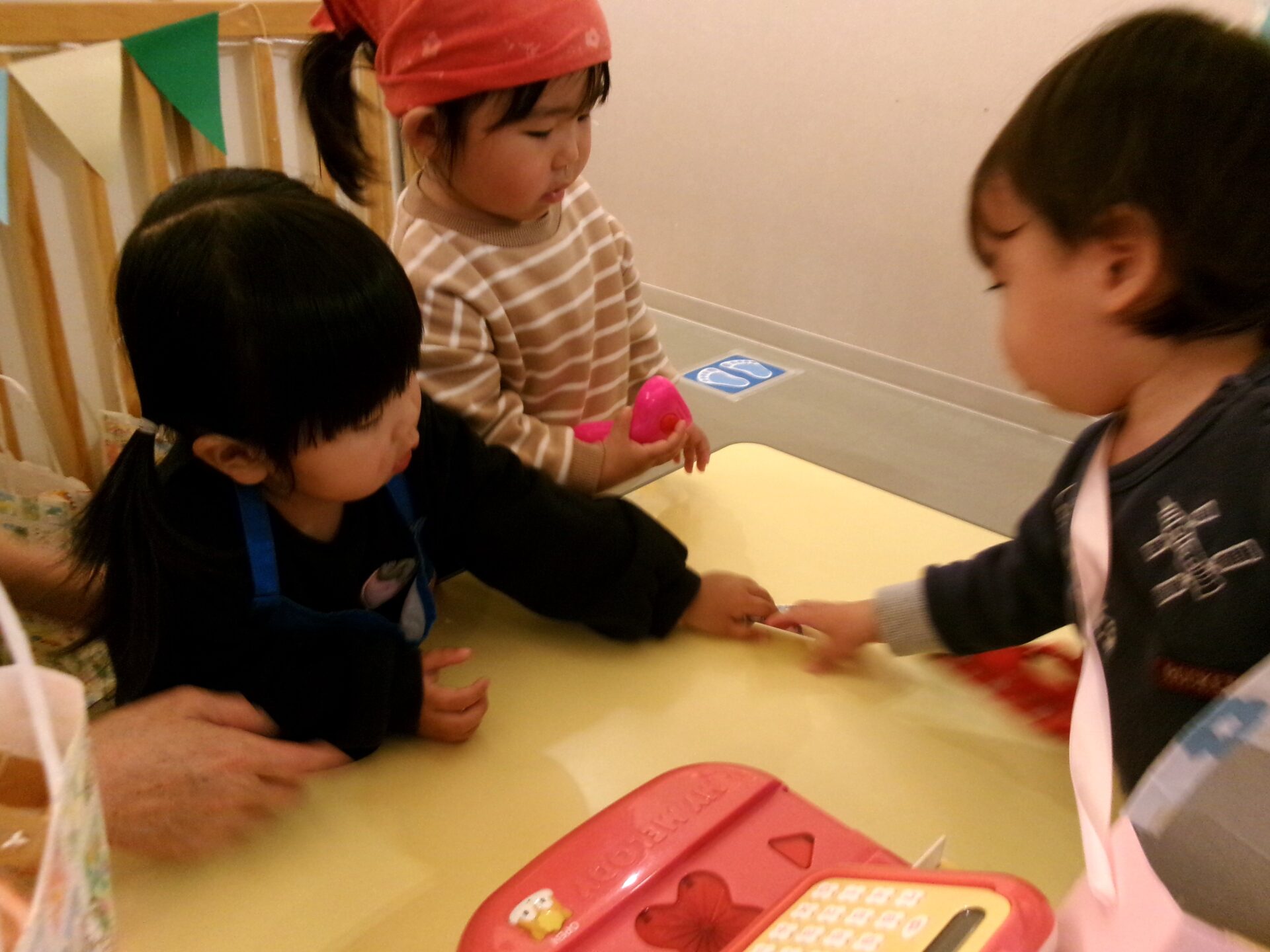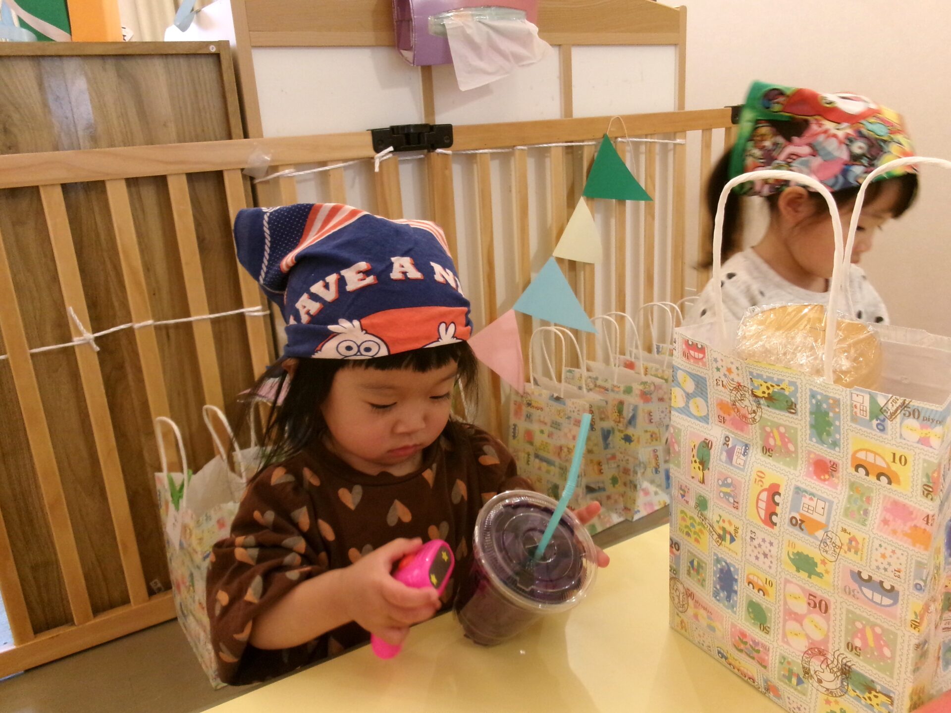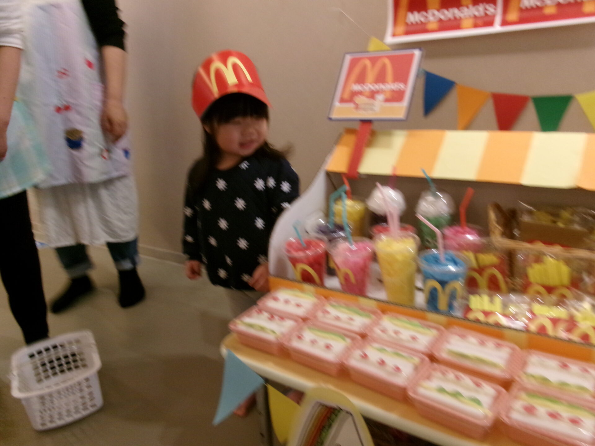 そら組(1歳児)、まんぼう組(2歳児)は、エプロンや三角巾など着けて、お店に立ち、準備完了です!