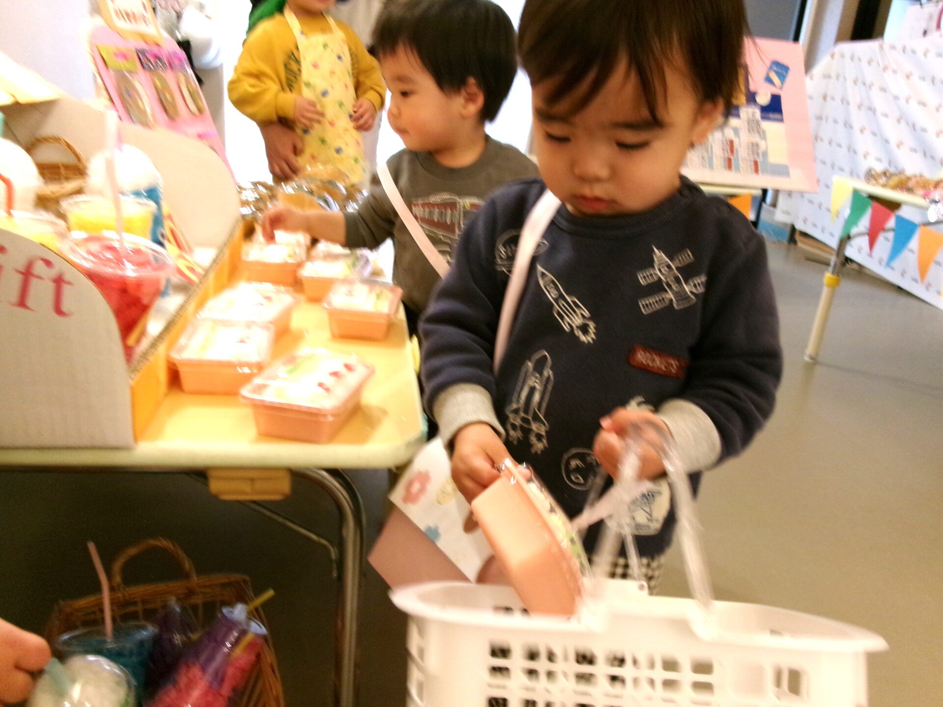 うみ組(0歳児)さんが、お買い物かごを持ってやって来ましたよ。店員さんから商品をもらったり、自分でどれにしようか選んでいました。