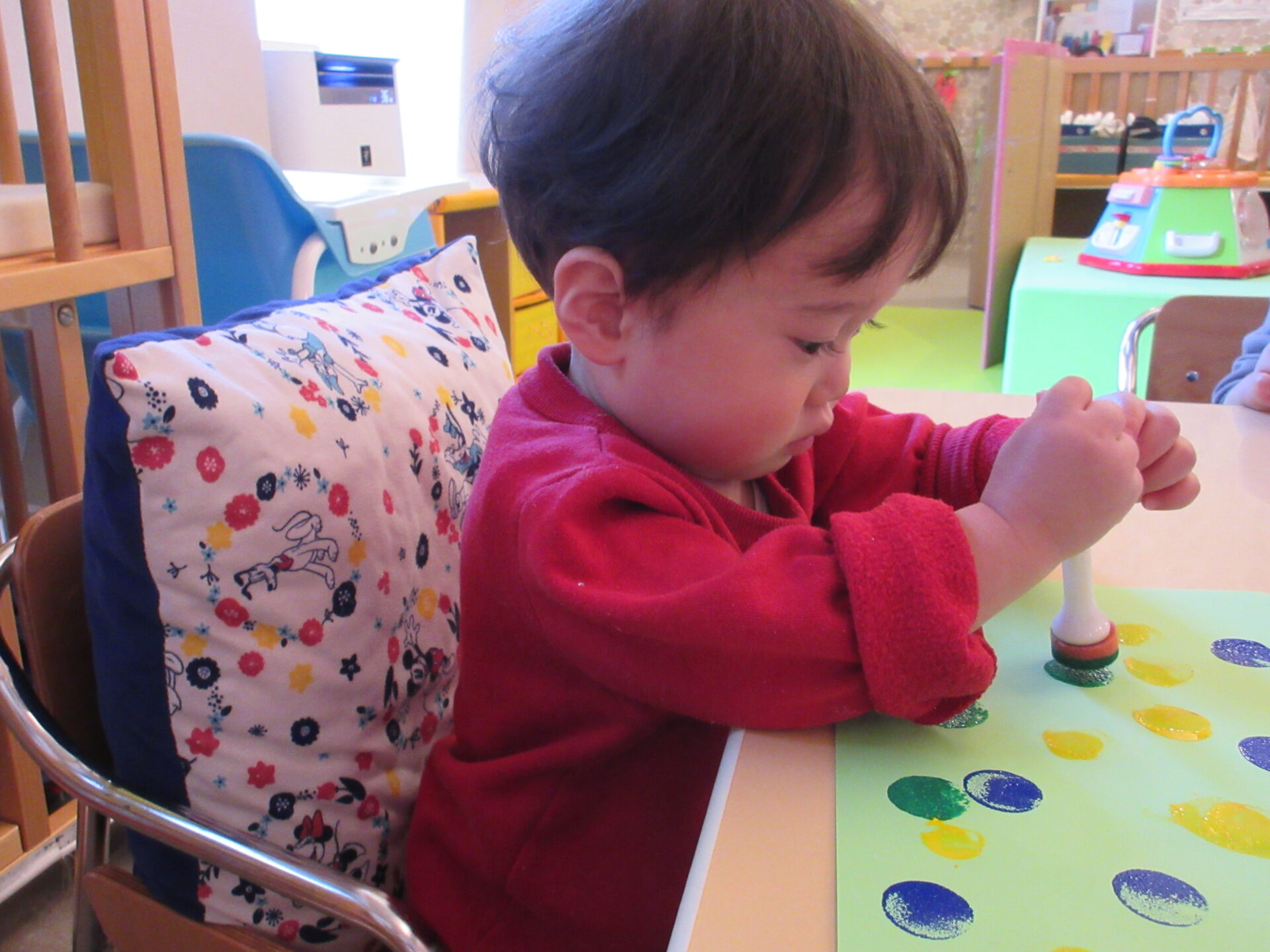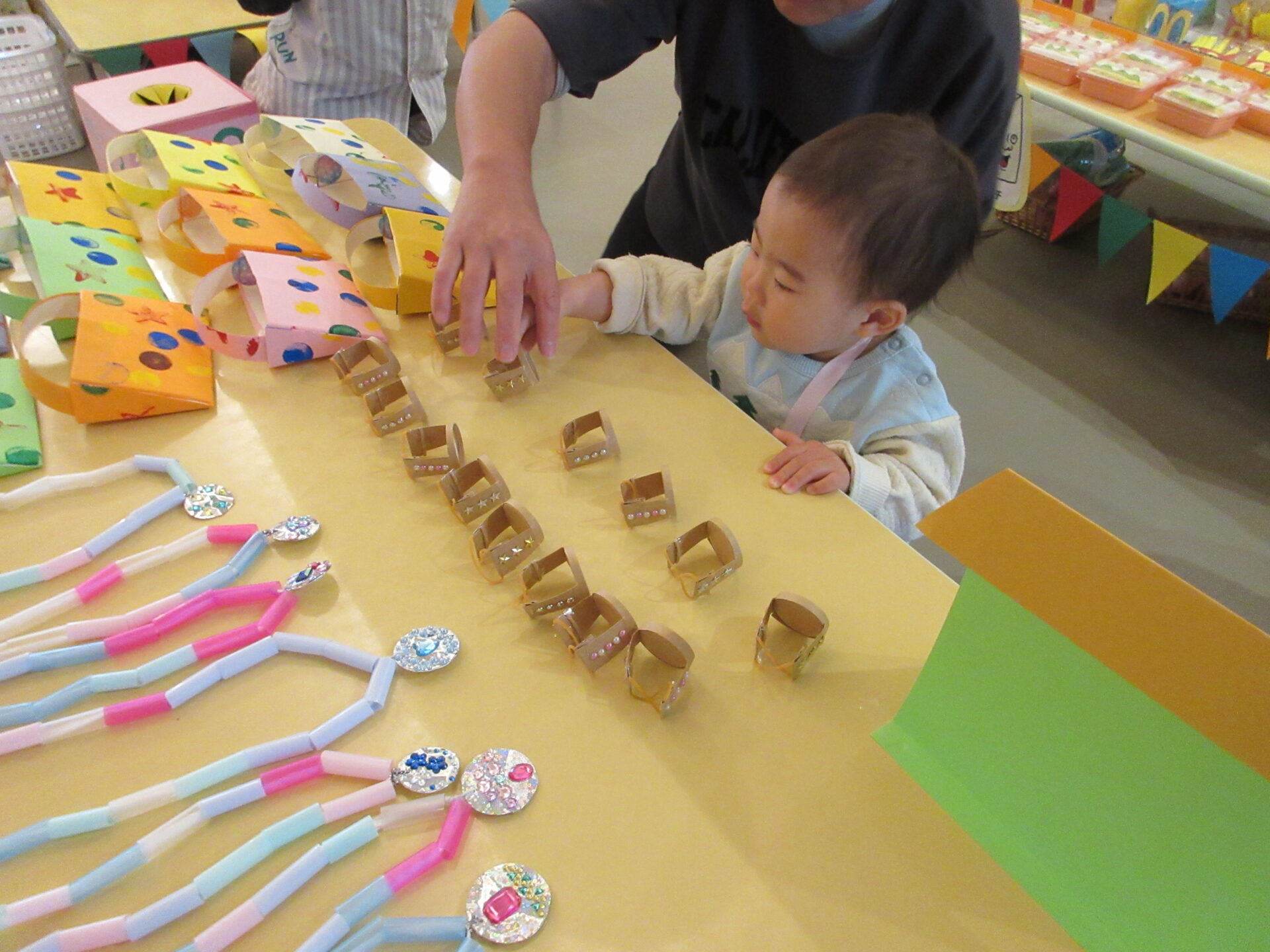 そら組(1歳児)とまんぼう組(2歳児)は、たこ焼き、ネックレスを作りました。たこ焼きは、紙を丸めて、絵の具でたれを塗り、画用紙の青のりをふりかけて作りました。ネックレスは、紐にストローを通して作りました。うみ組(0歳児)は、カラフルなスタンプをして、かわいいバッグを作りました。