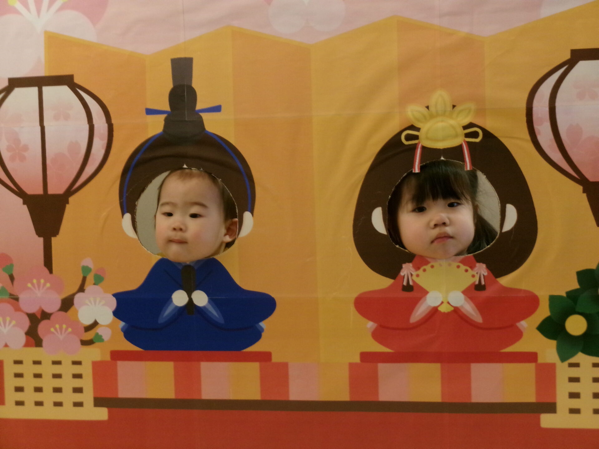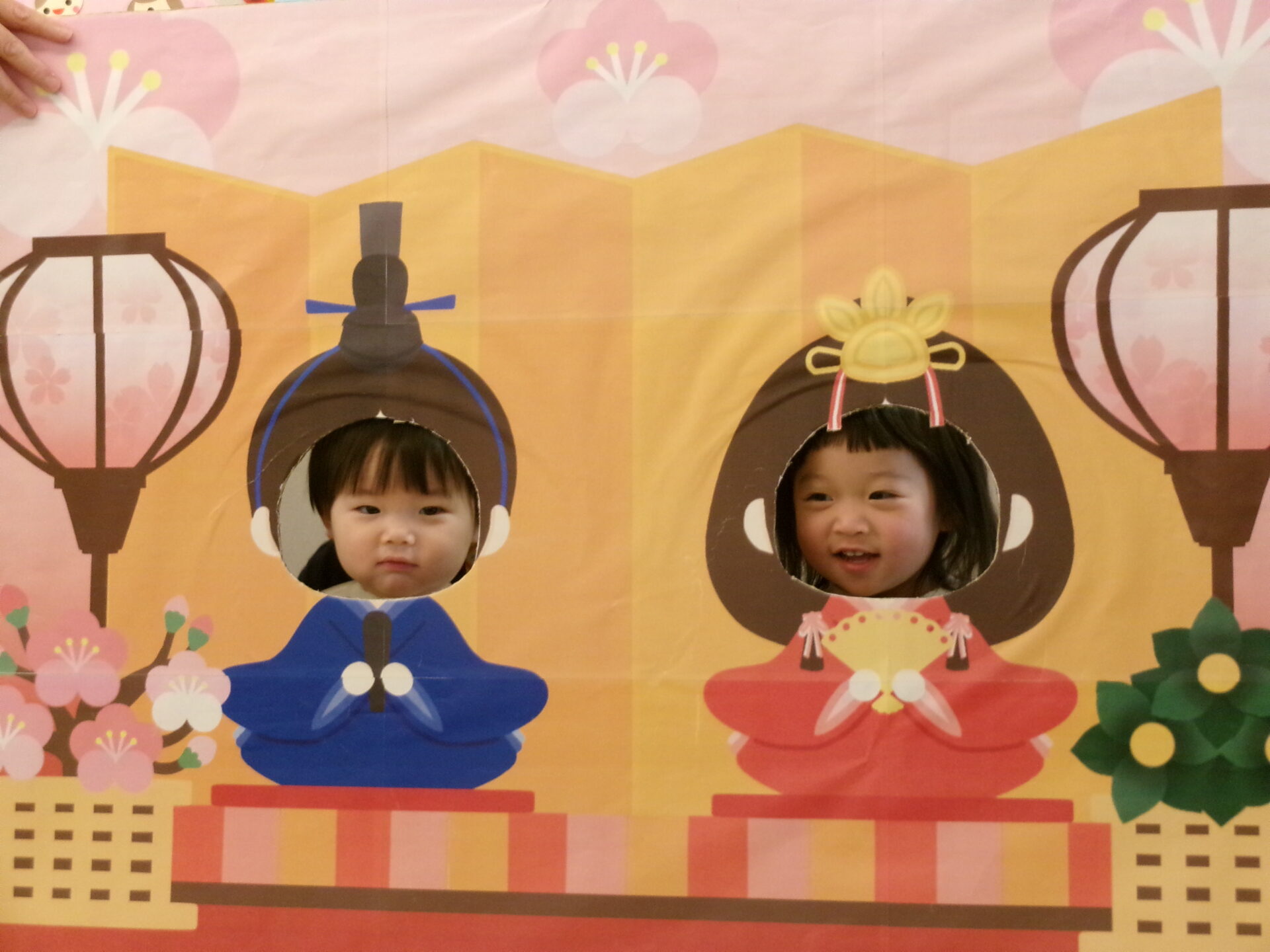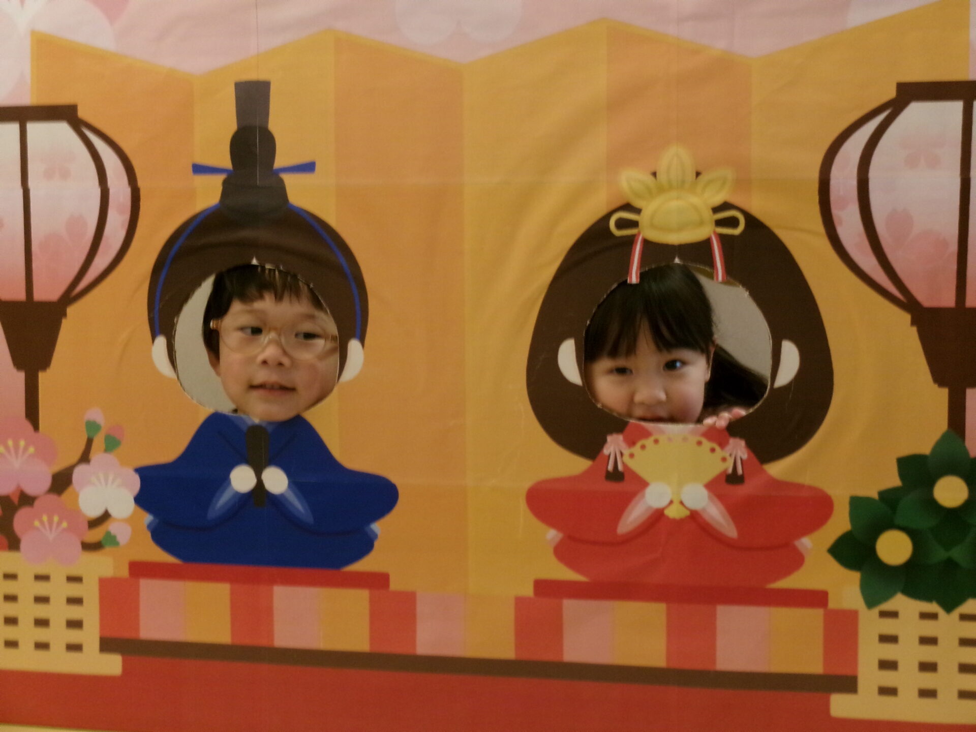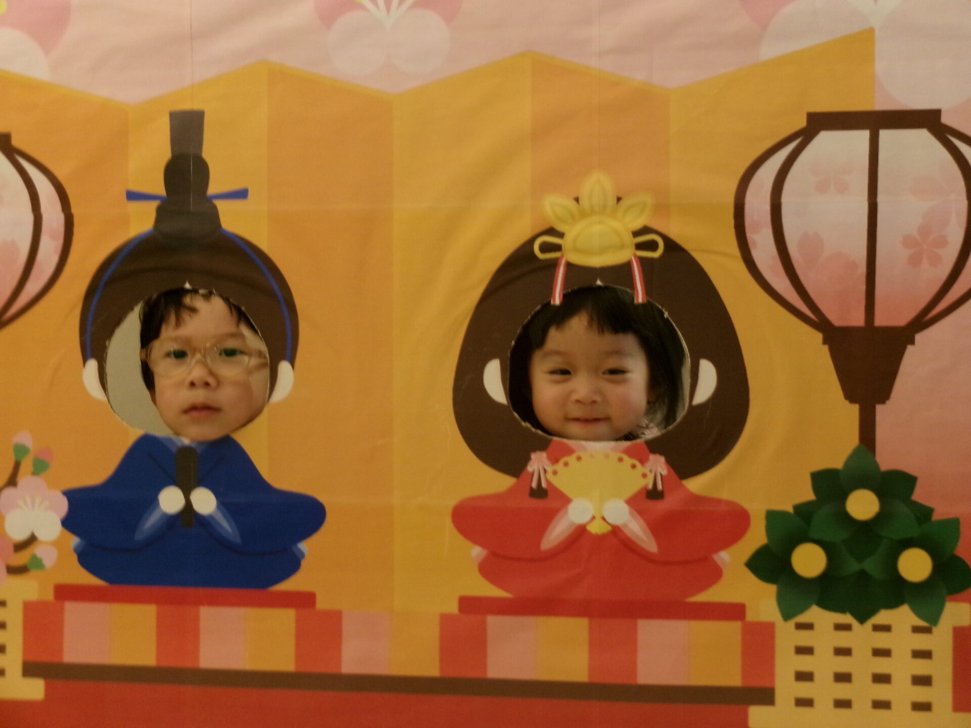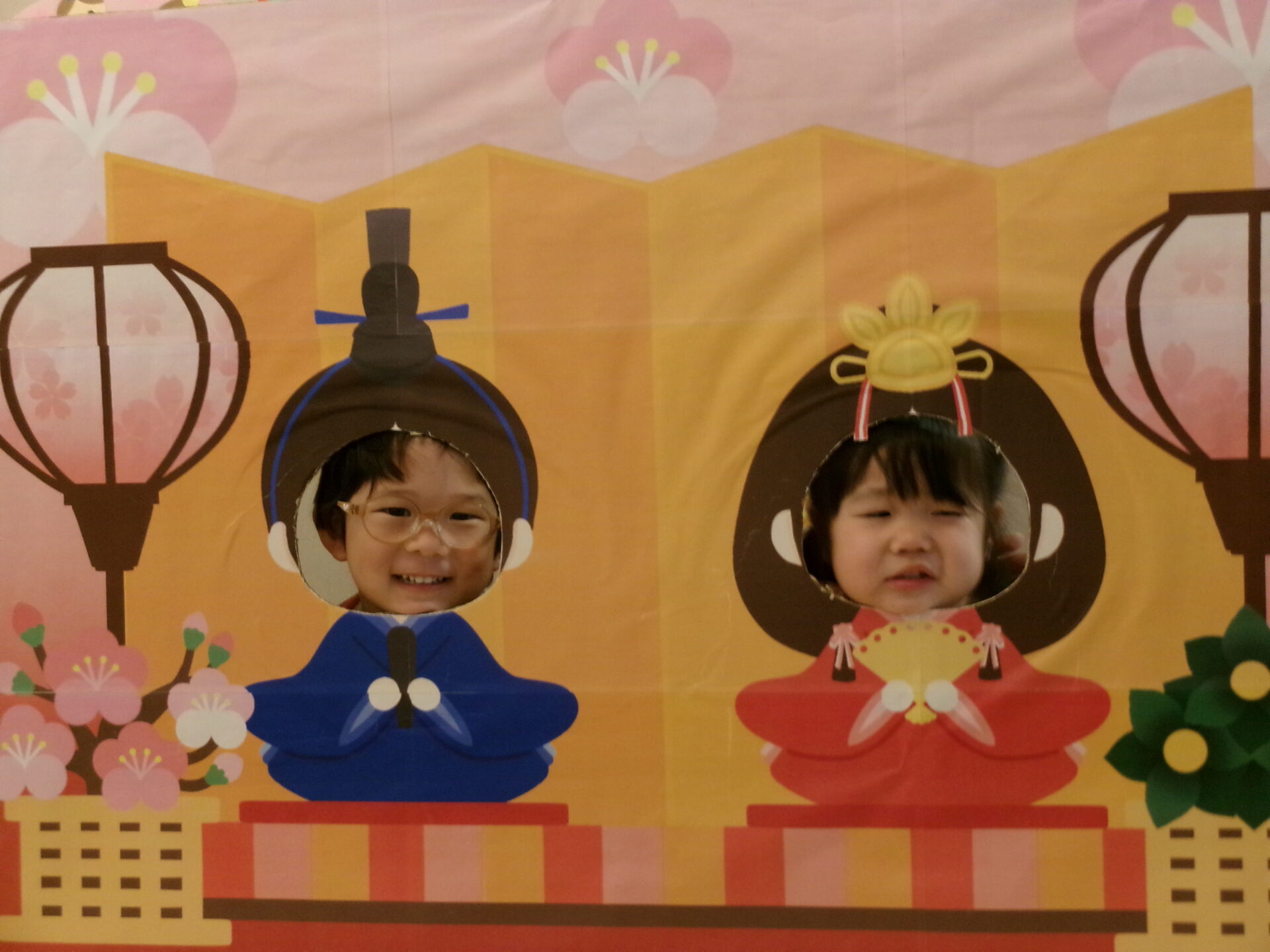 おひなさま💖 おだいりさま💙の顔出しパネルに変身でーす。「かわいい・カッコイイかしら?」